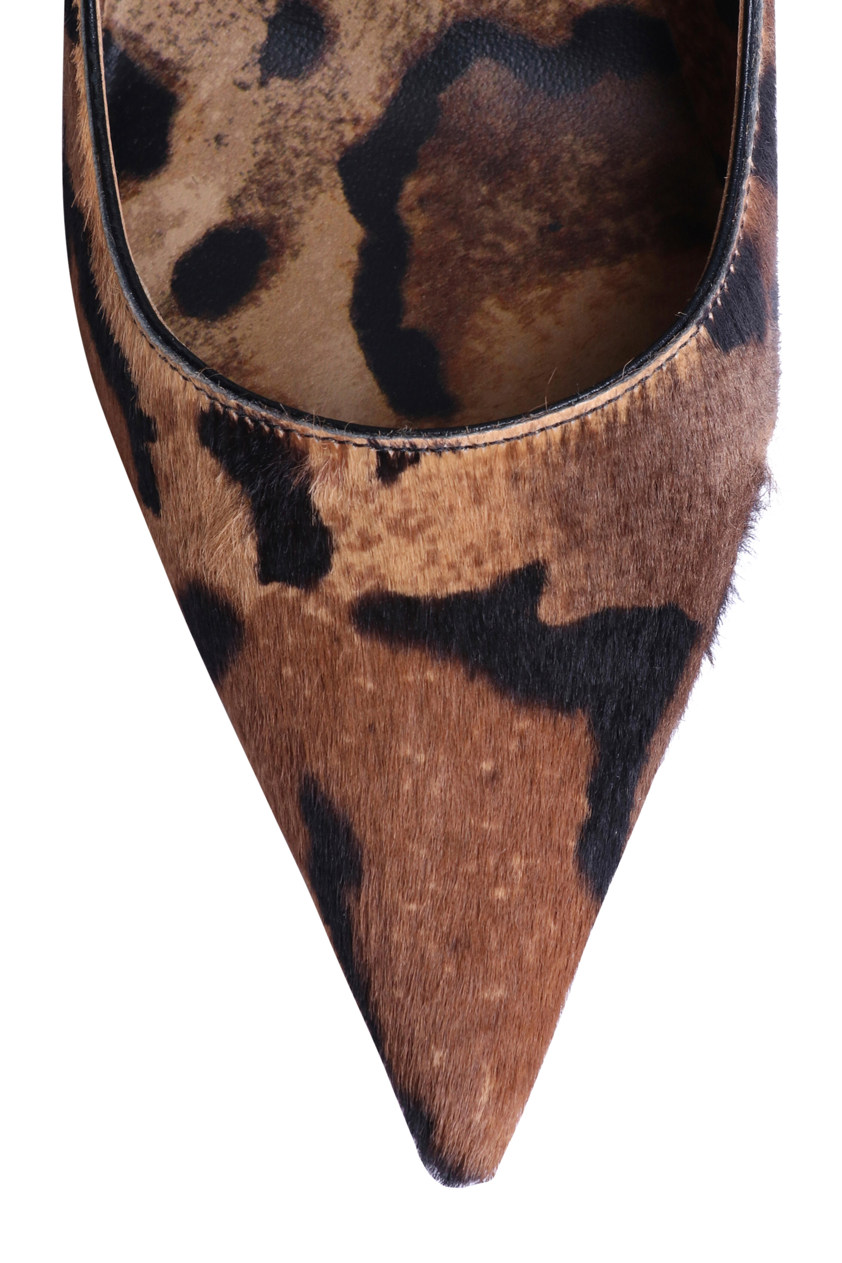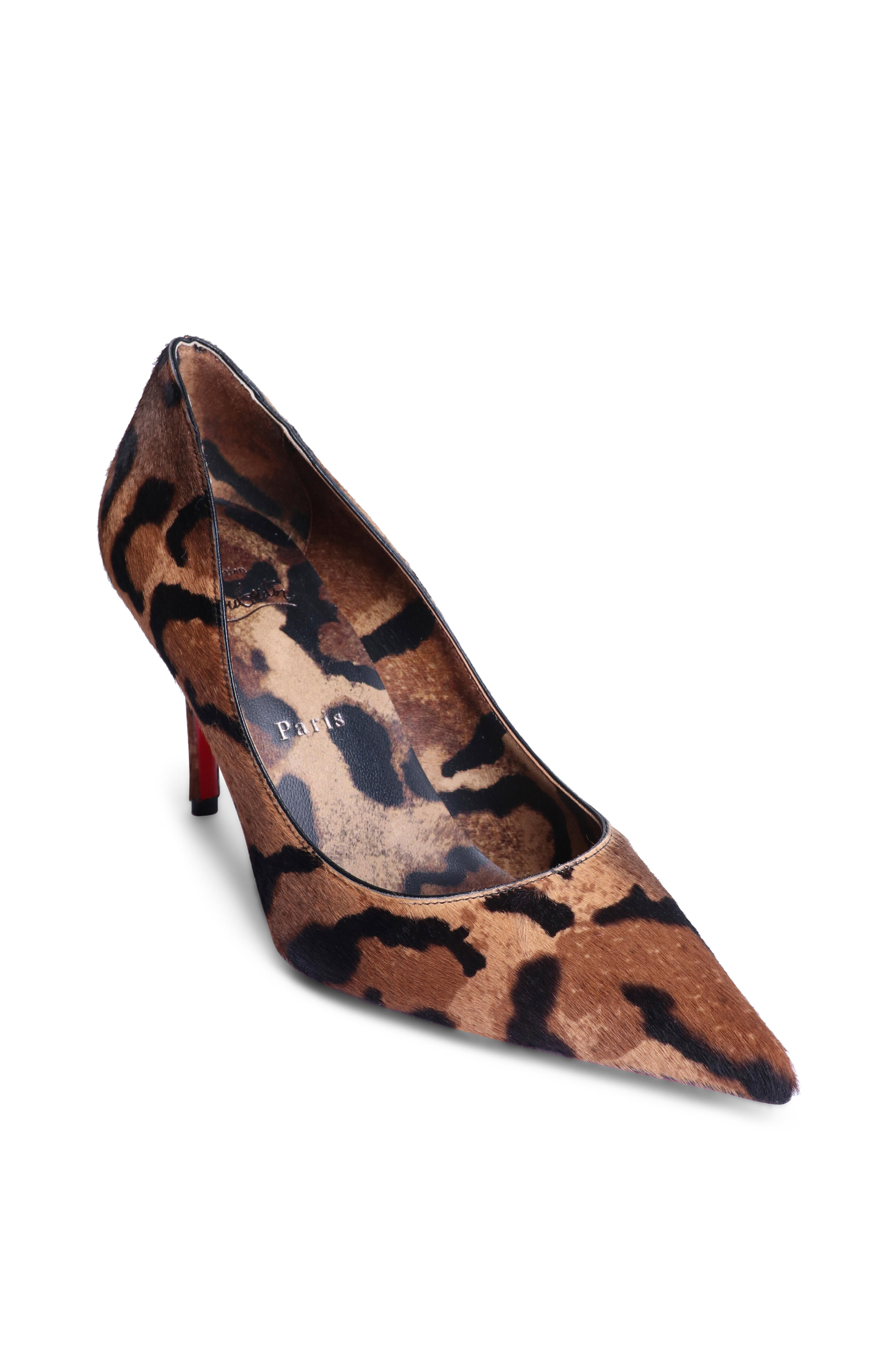 Pony hair upper. Leather lining. Signature red leather sole. Pointed toe. Slip-on style. Leopard print design. Stiletto heel. Made in Italy. Heel measurement: 80mm.