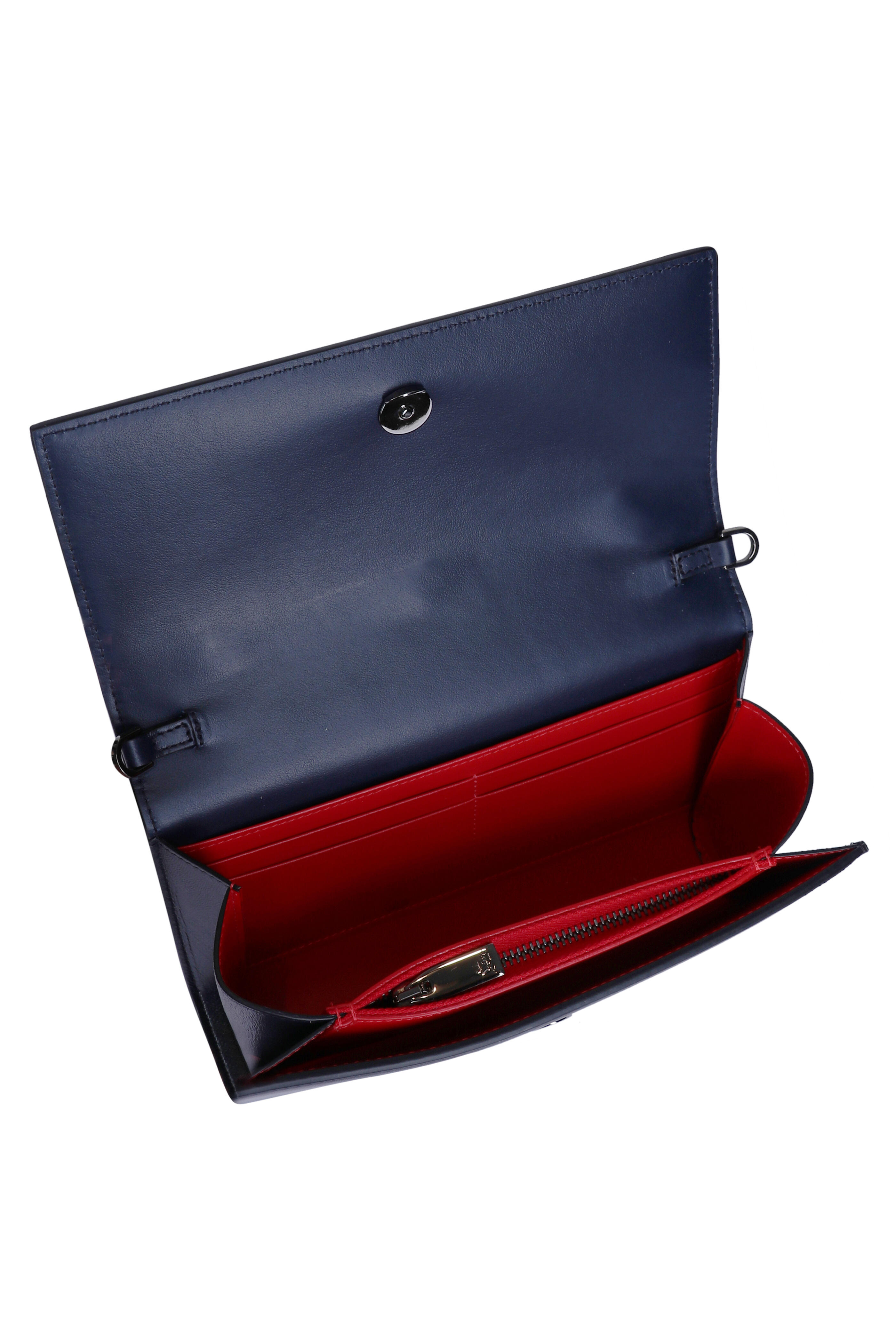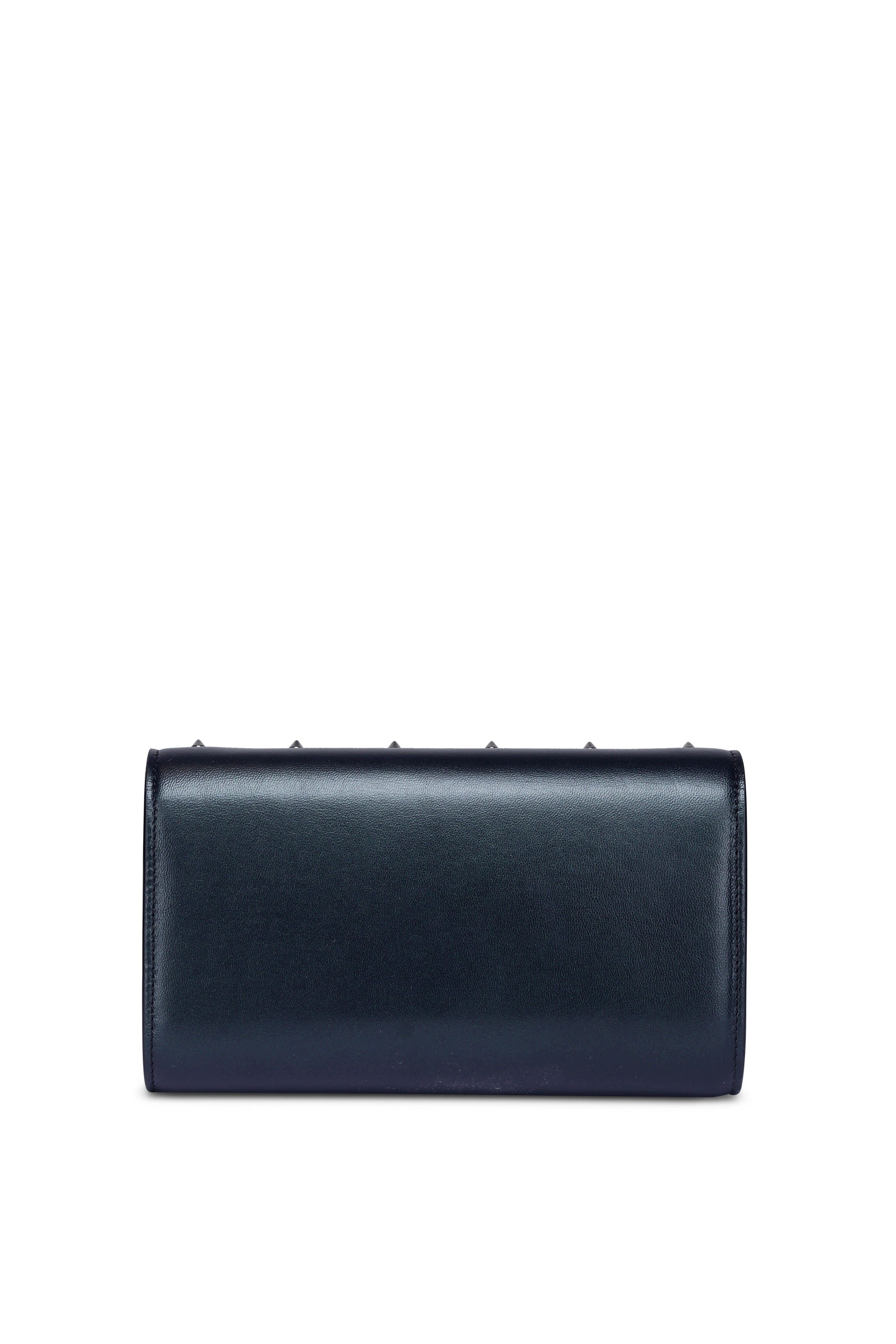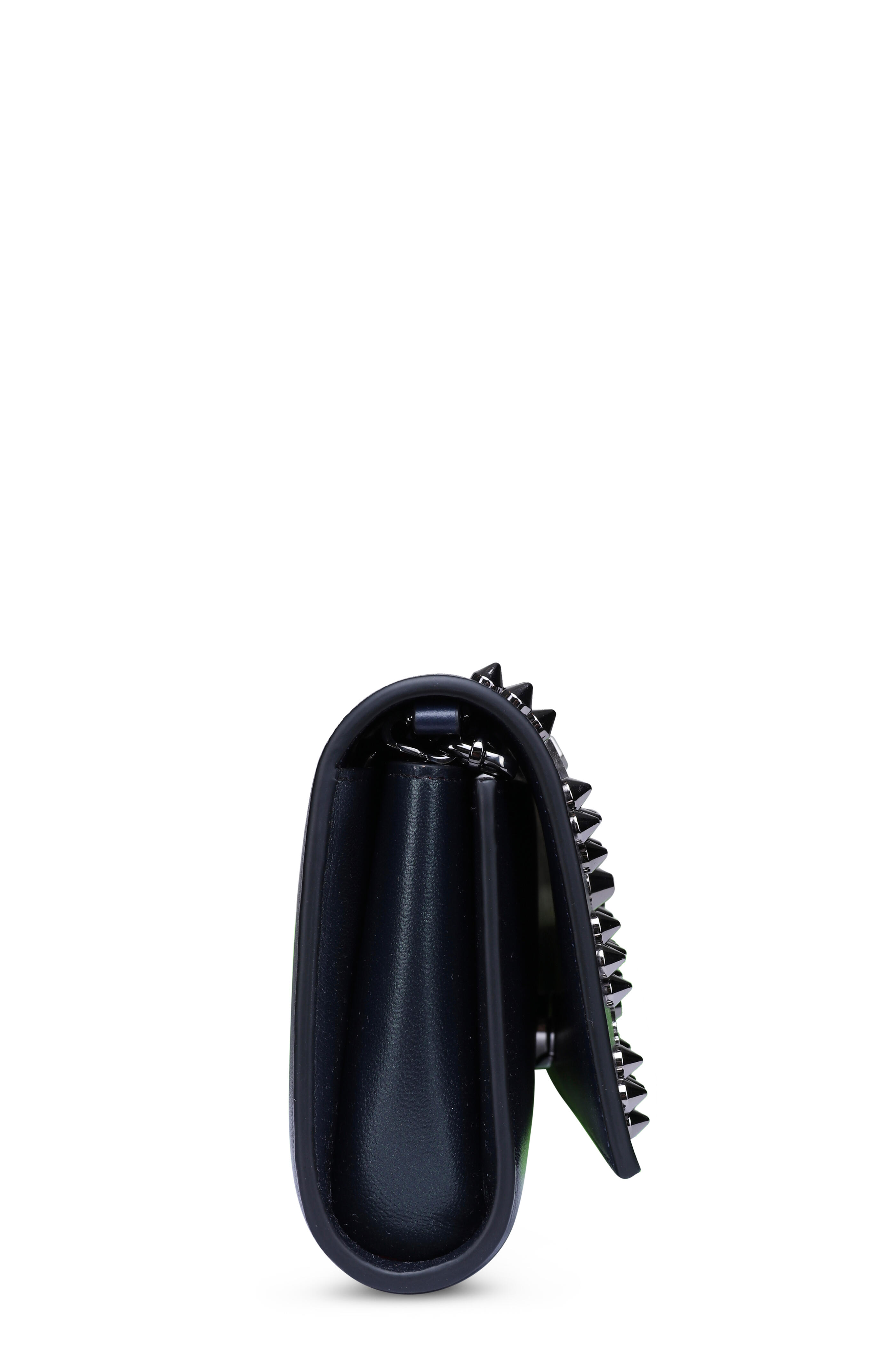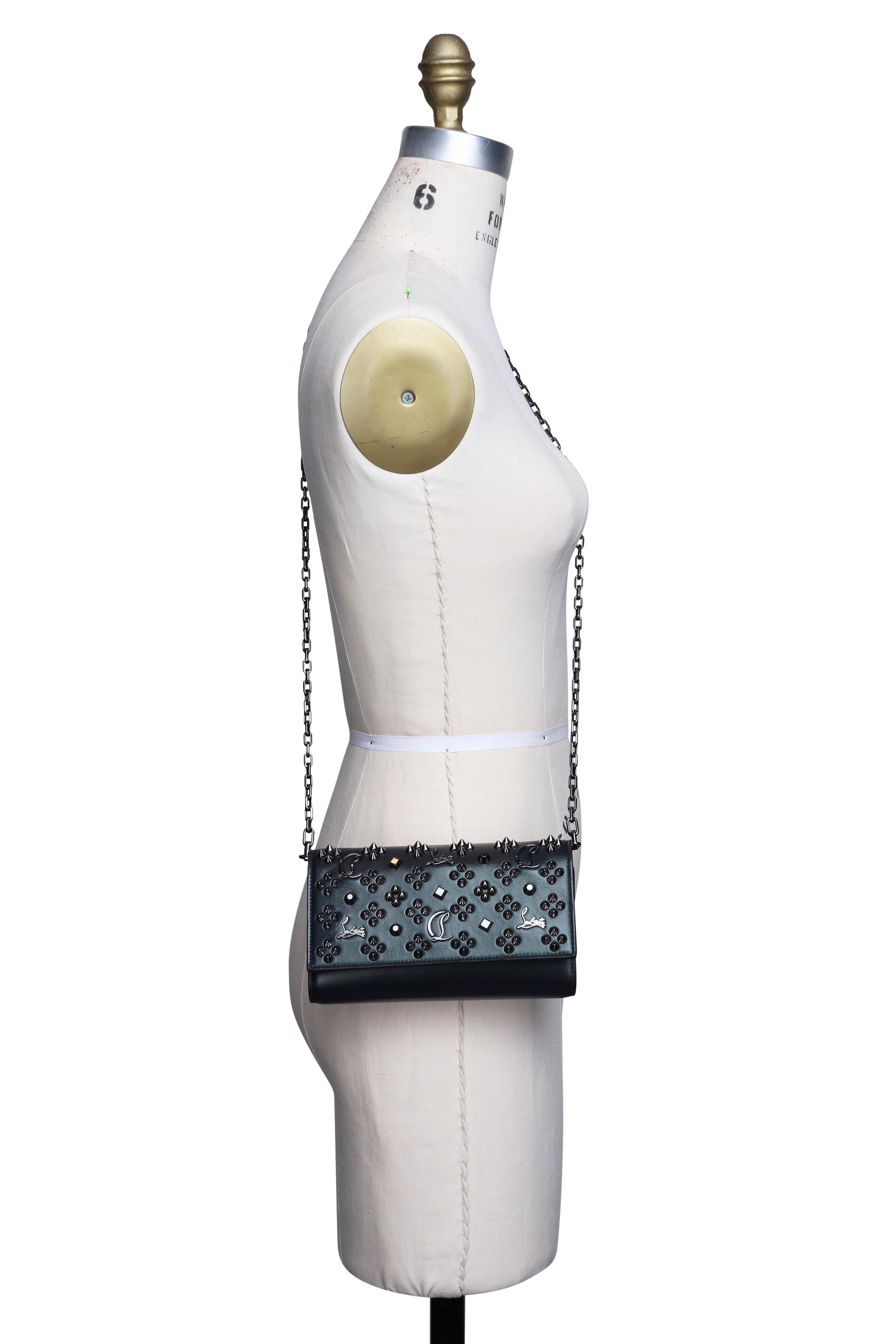 Leather outer and lining. Fold over flap. Magnetic closure. Adjustable and detachable chain crossbody strap. Loubinthesky spike stud embellishments. Interior zip pocket. Six total card slots. Made in Italy. Weight: 7.5”. Height: 4.1”. Depth: 1.8”.