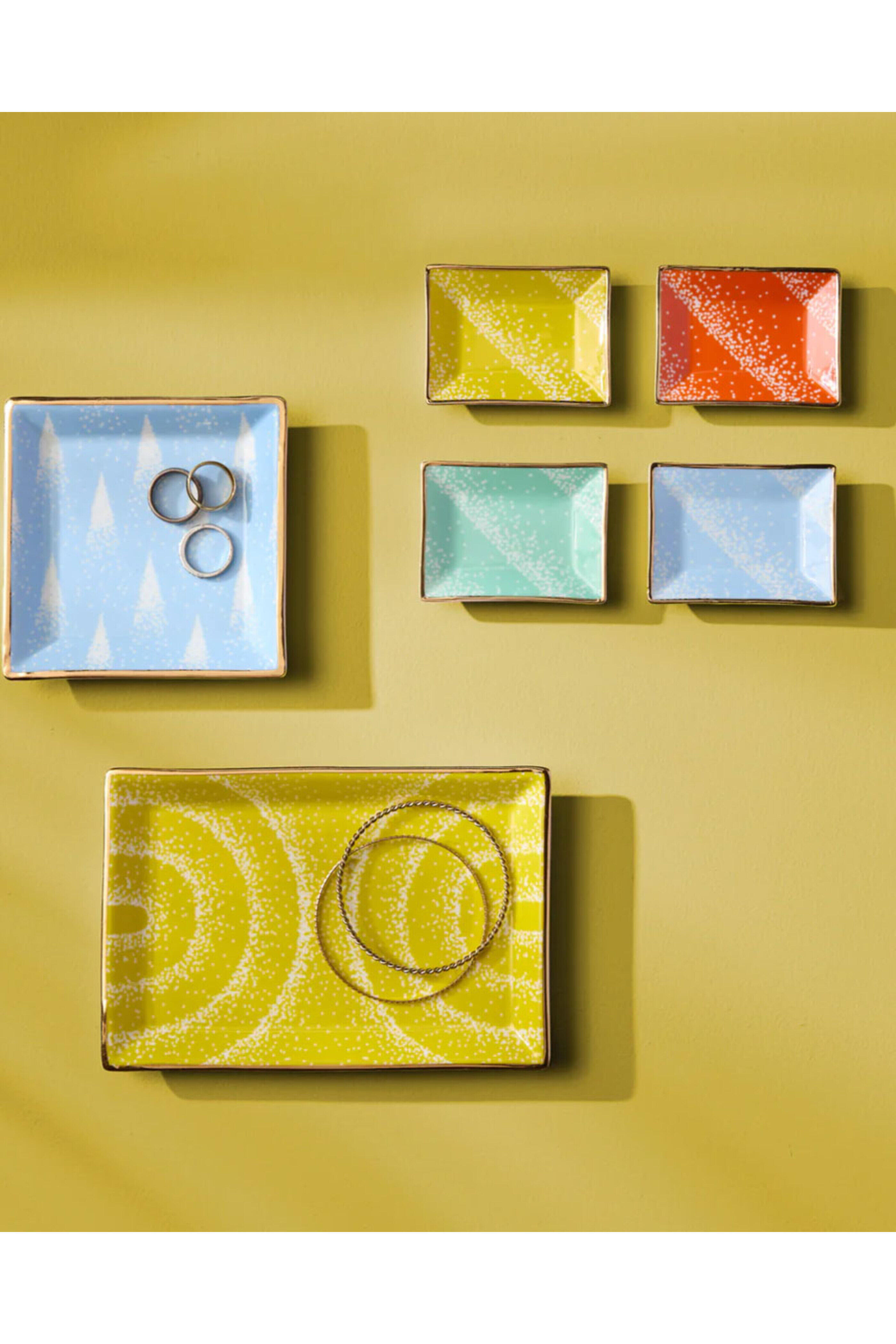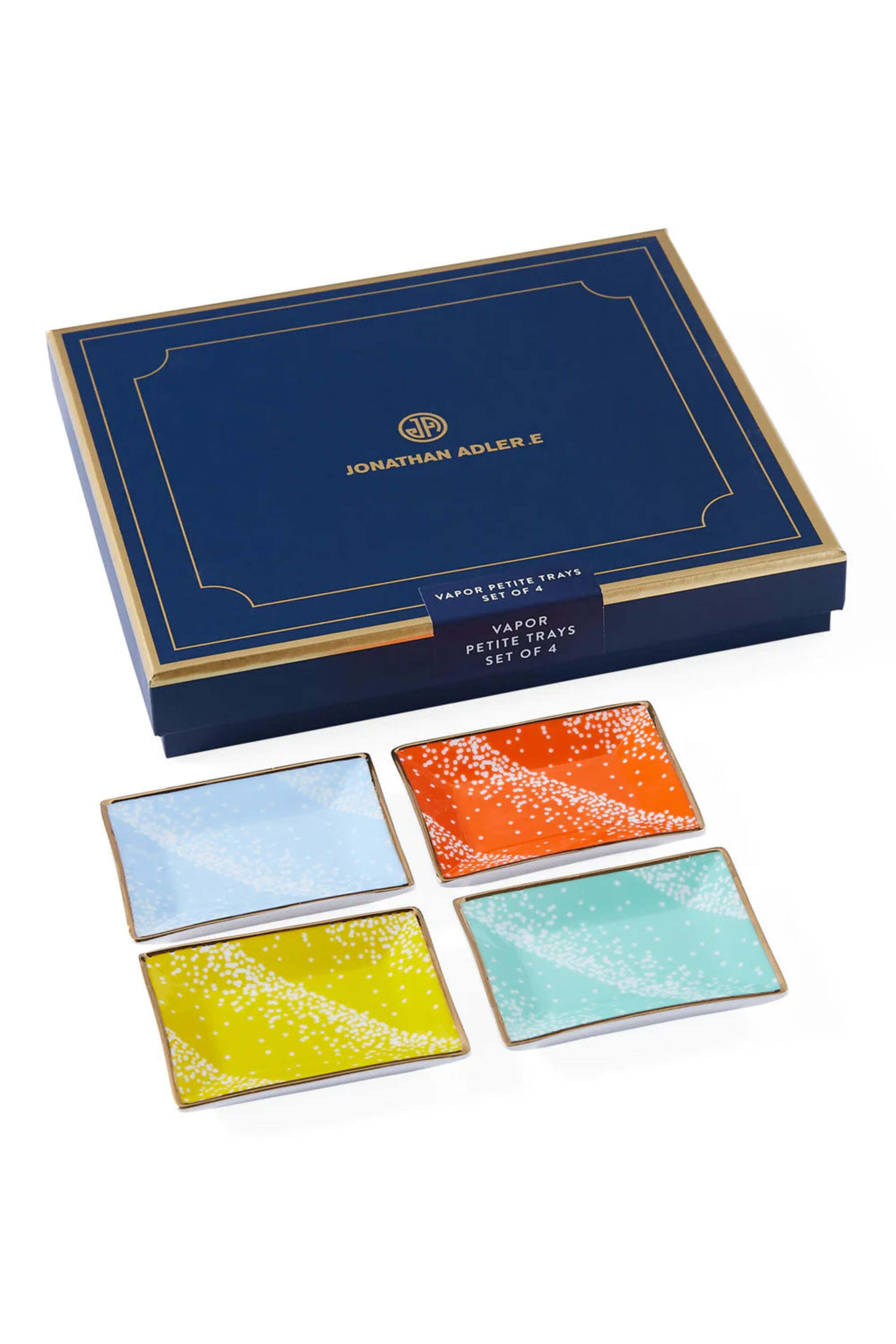 Jonathan Adler Vapor Petite Trays. Porcelain with sparkly gold boarders. Inspired by 30s Art Deco airbrushing. 3" W, 2.25" D, .50" H each.