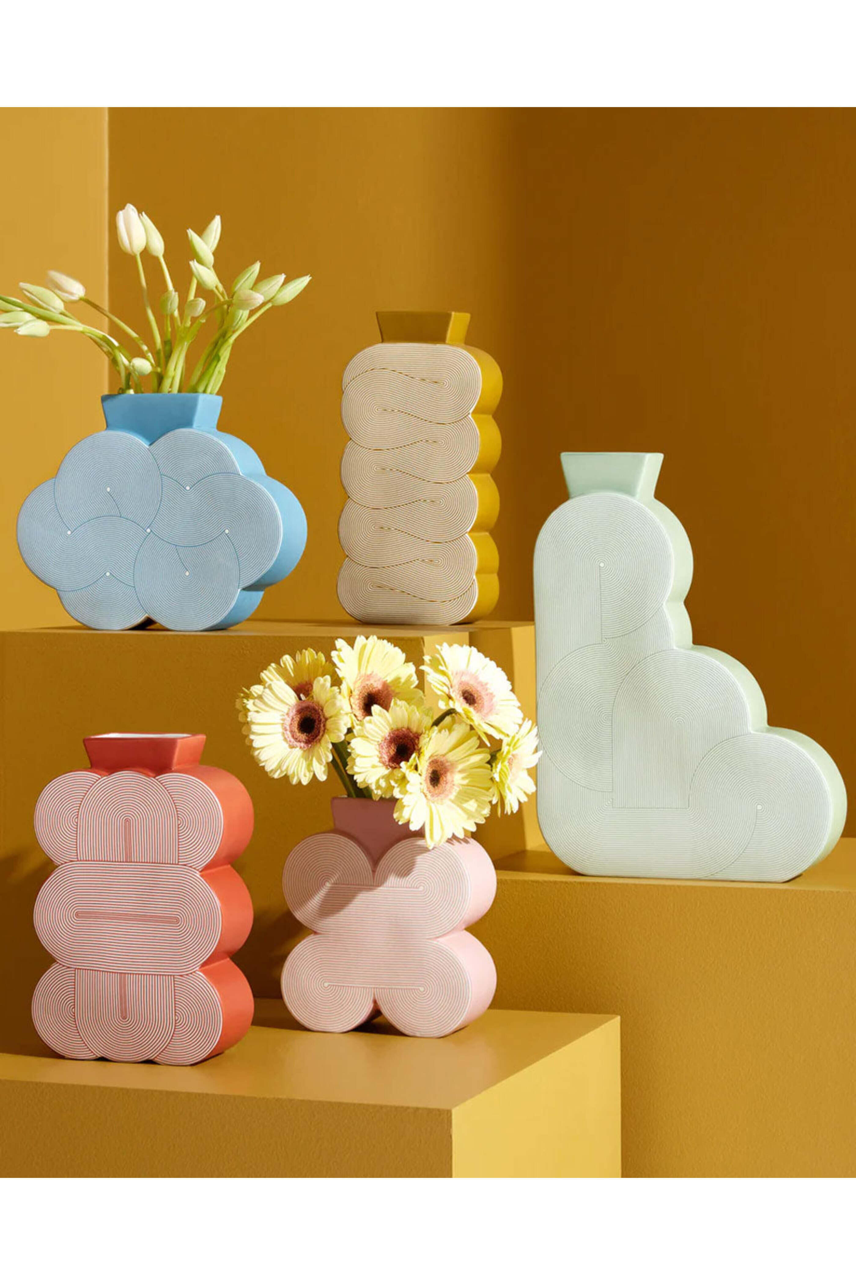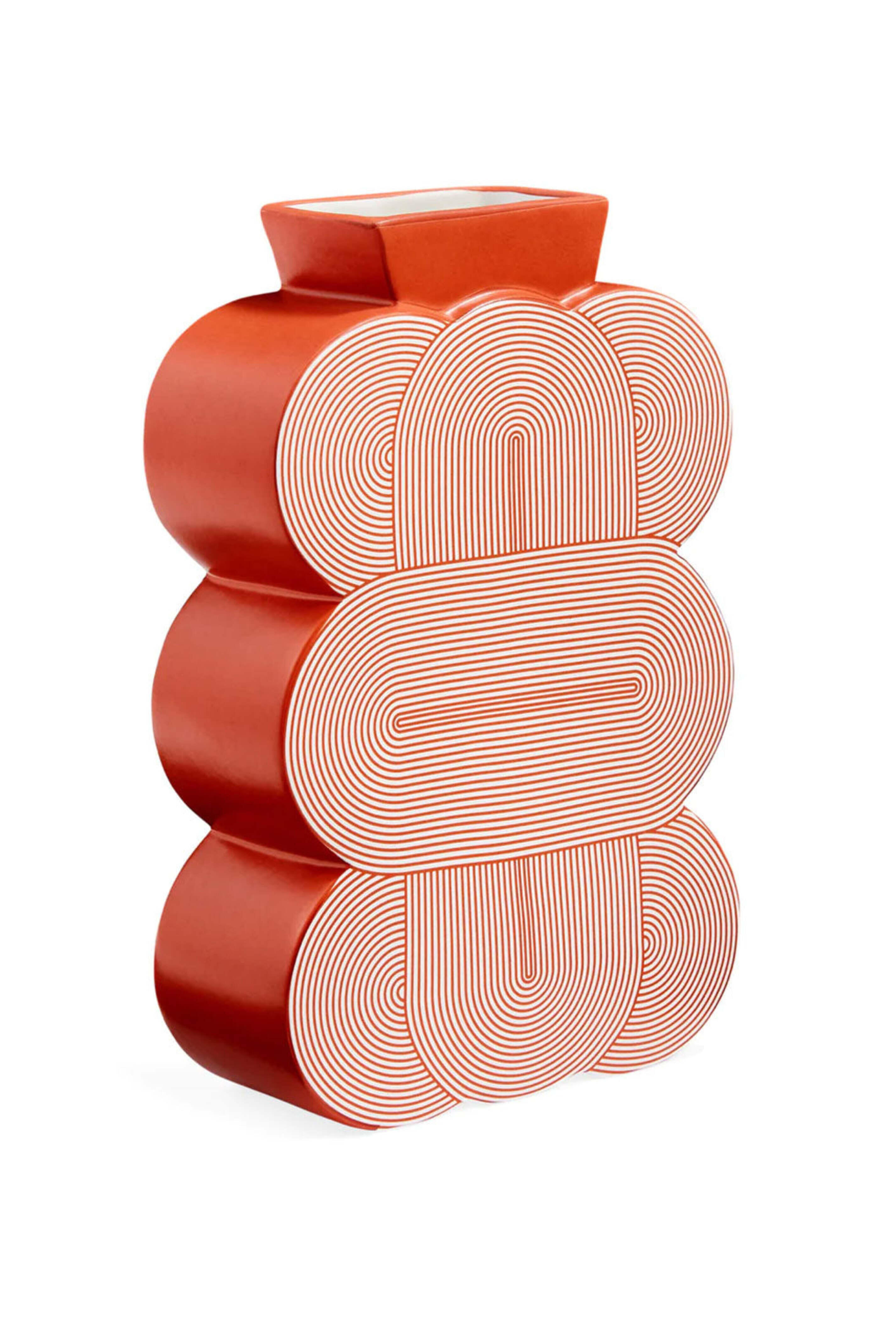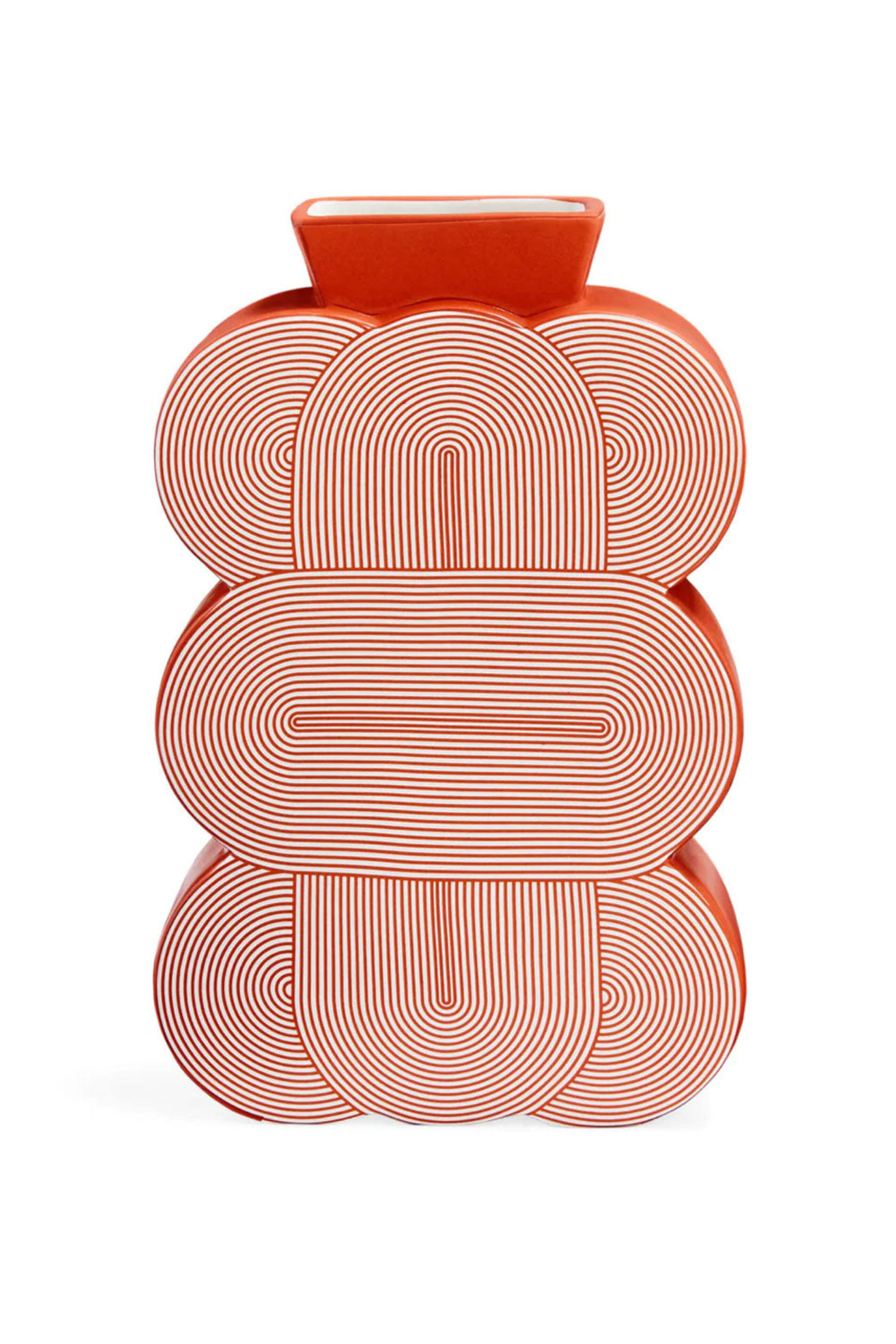 Jonathan Adler Pompidou Medium Red Vase. 70s inspired pattern. Satin matte finish. 6" W, 2.5" D, 9.5" H.