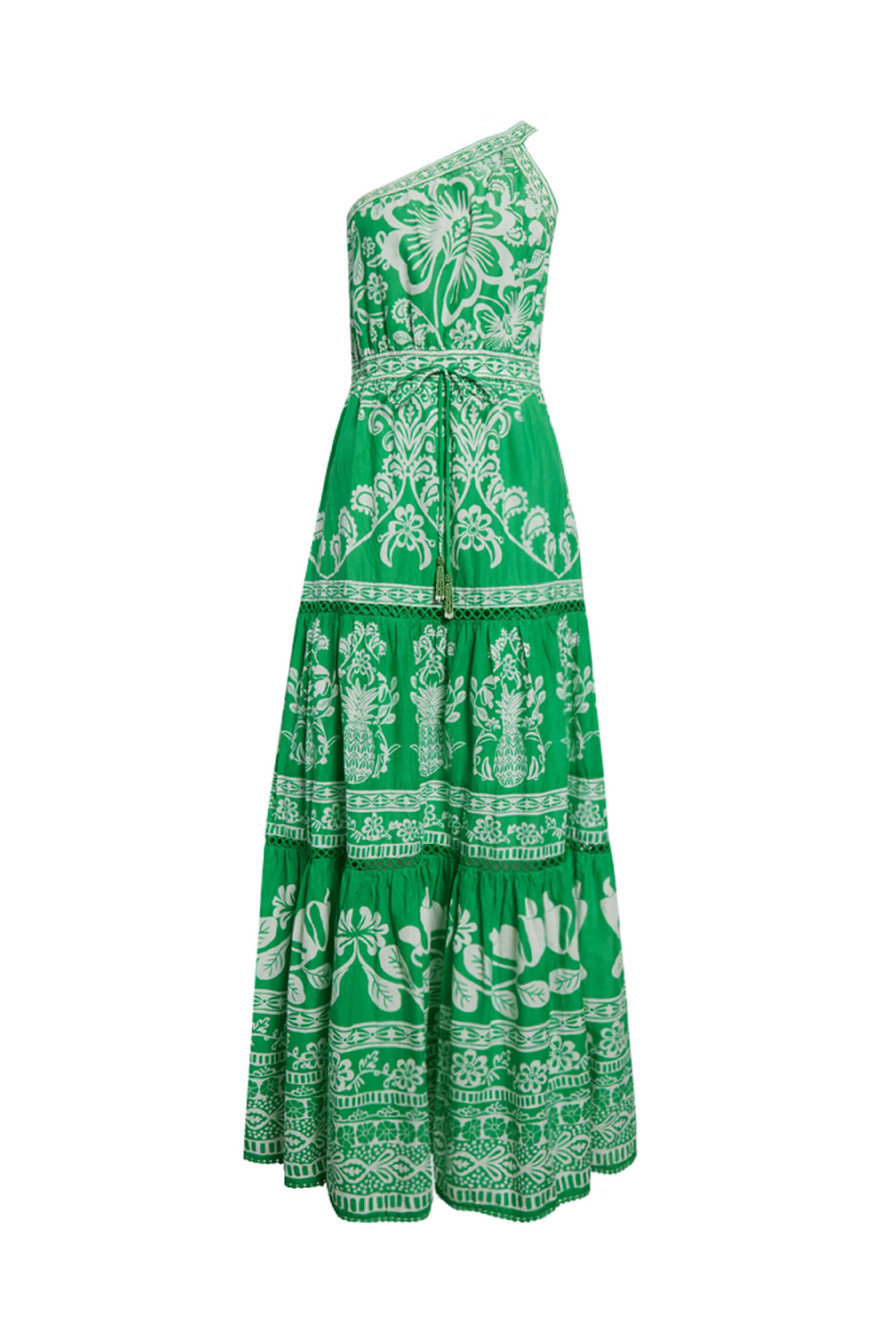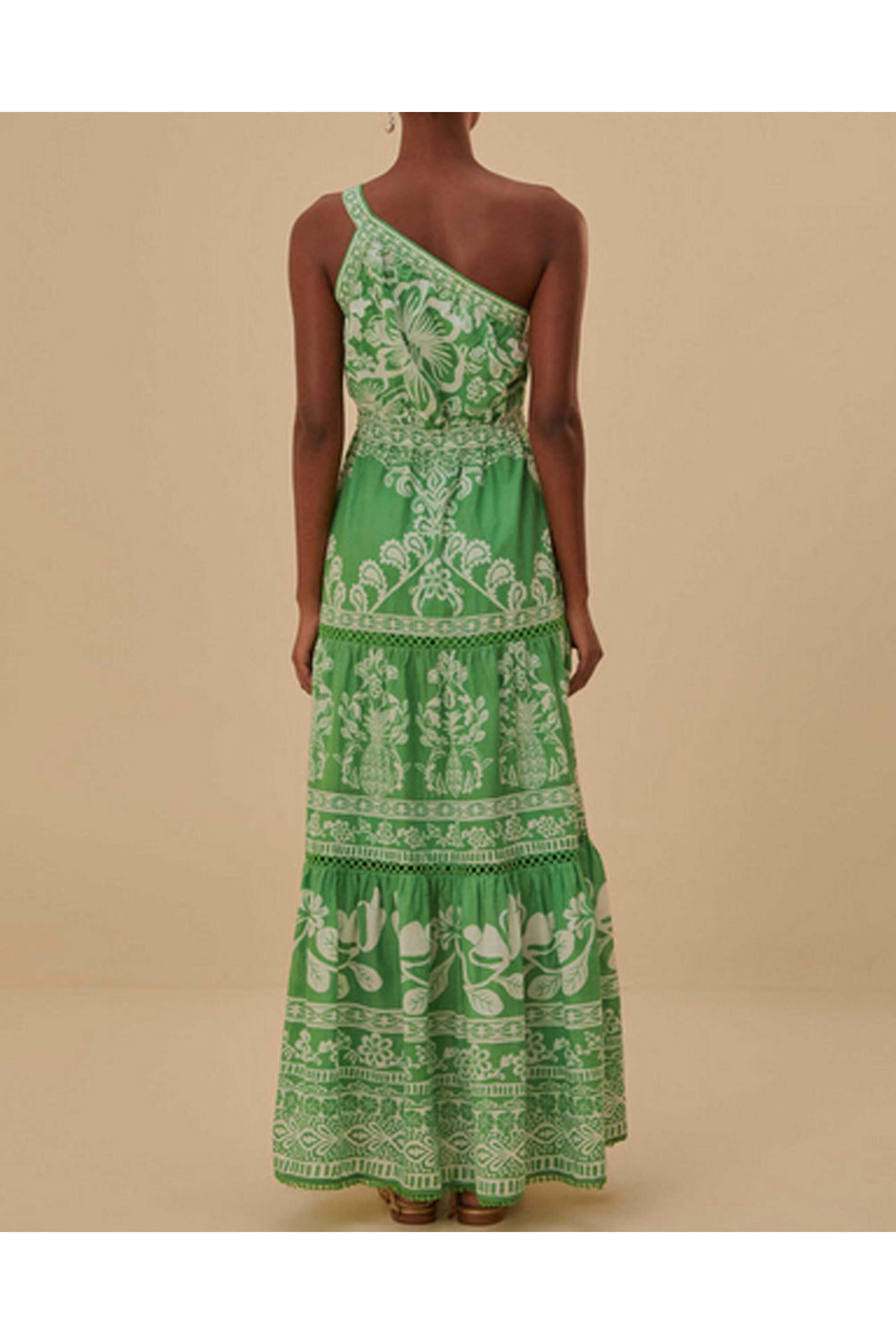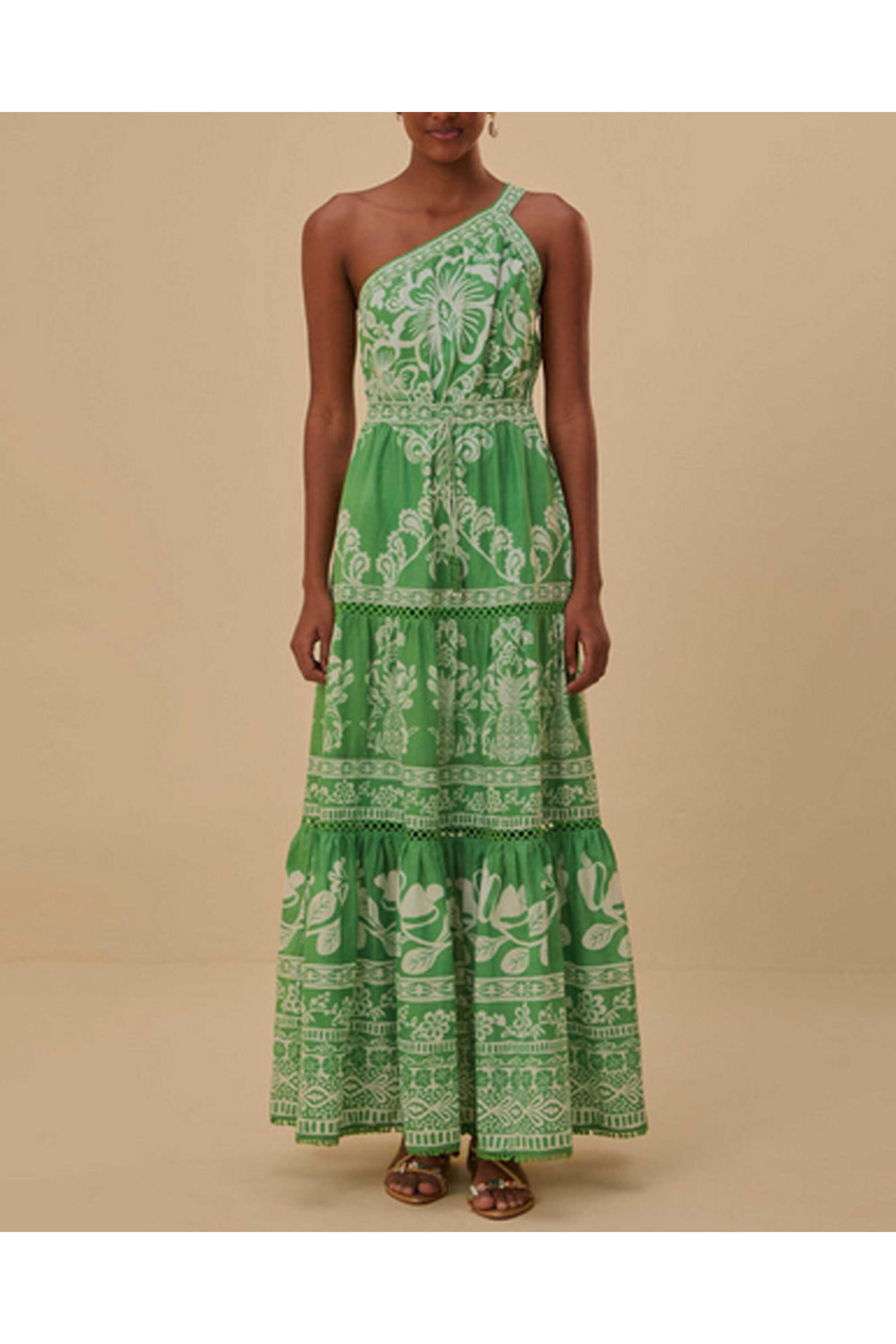 Farm Rio Green Sweet Garden Maxi Dress. Asymmetrical single shoulder. Sleeveless. Drawstring waist; beaded tassel detail. Tiered silhouette. Maxi length. 100% cotton.