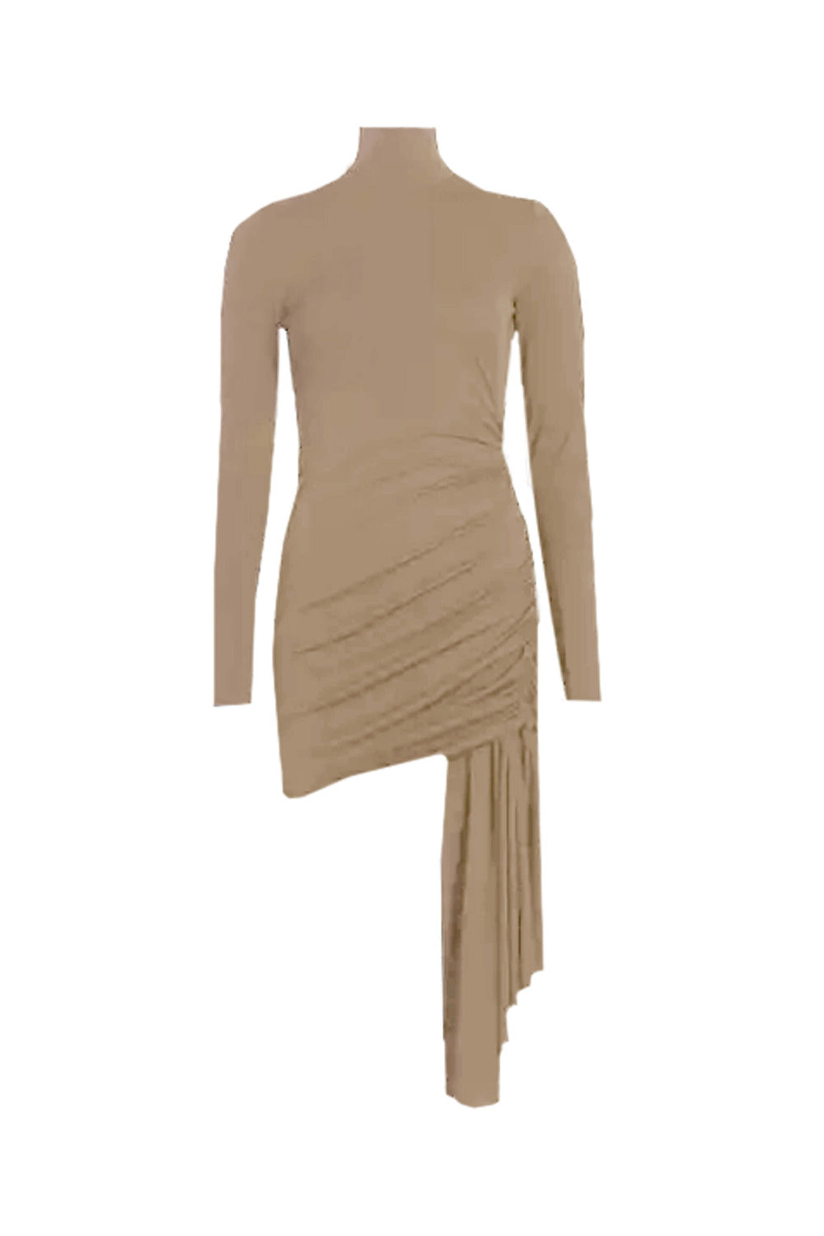 Ronny Kobo Toasted Almond Ronaldo Dress. Turtleneck. Long sleeves. Ruched at sides. Asymmetrical hem. Drape detail. Mini length. 70% rayon, 30% polyester.