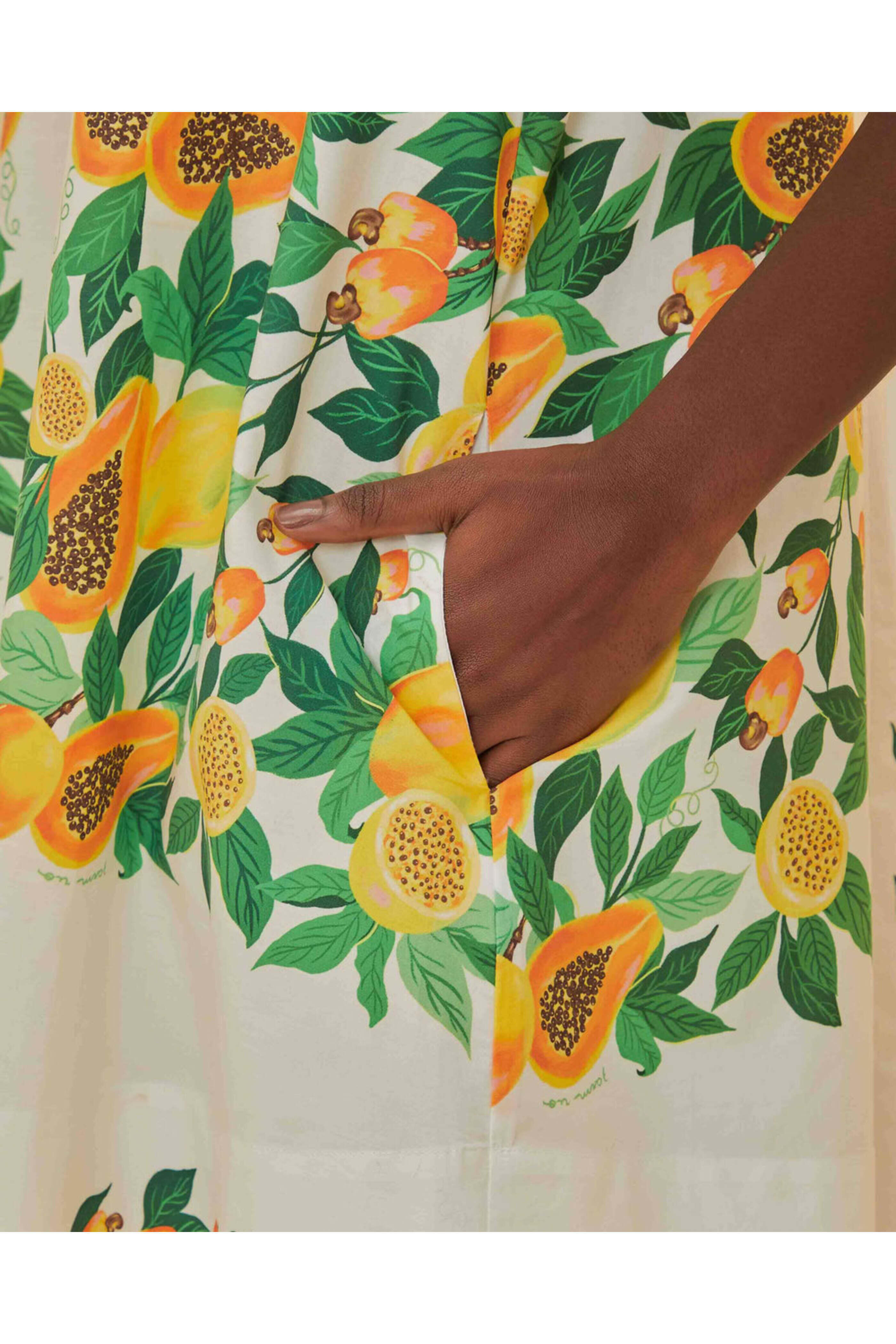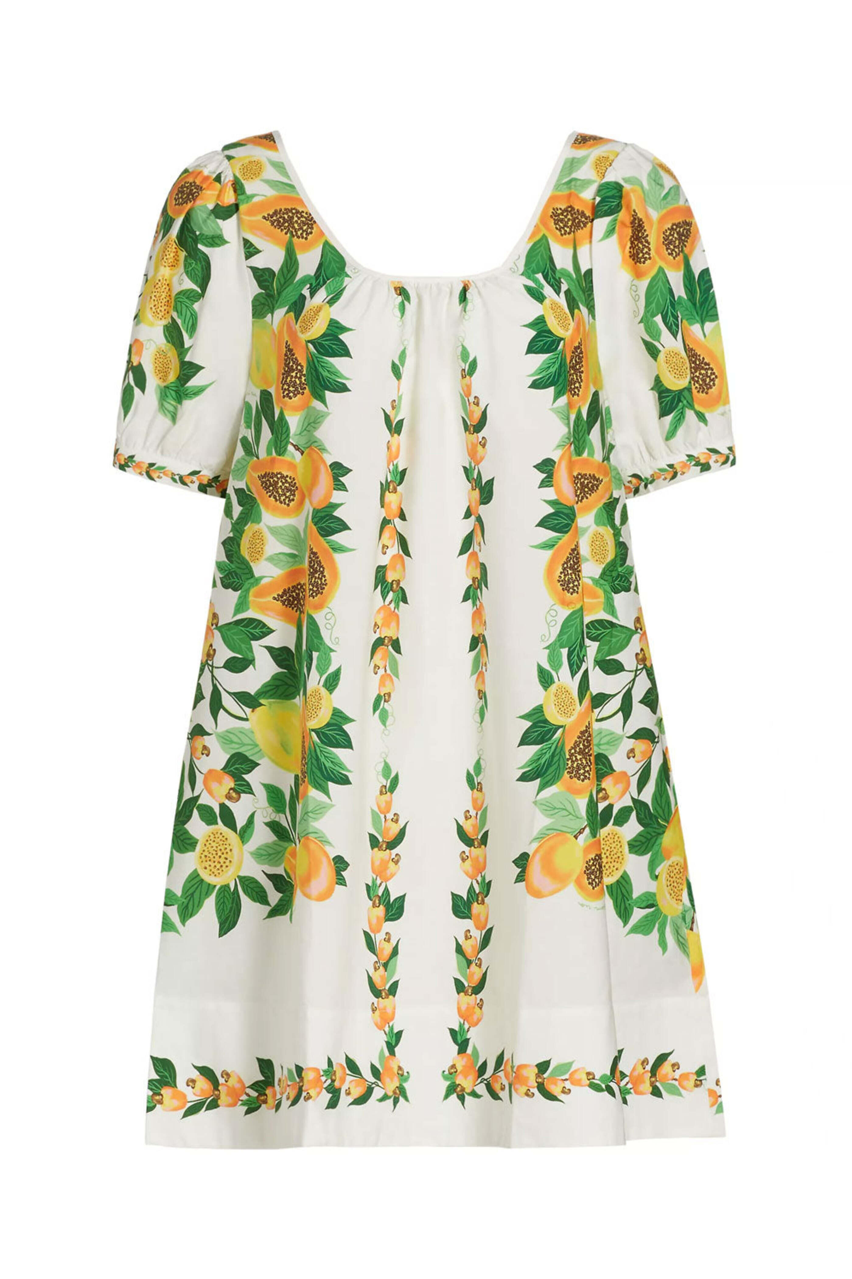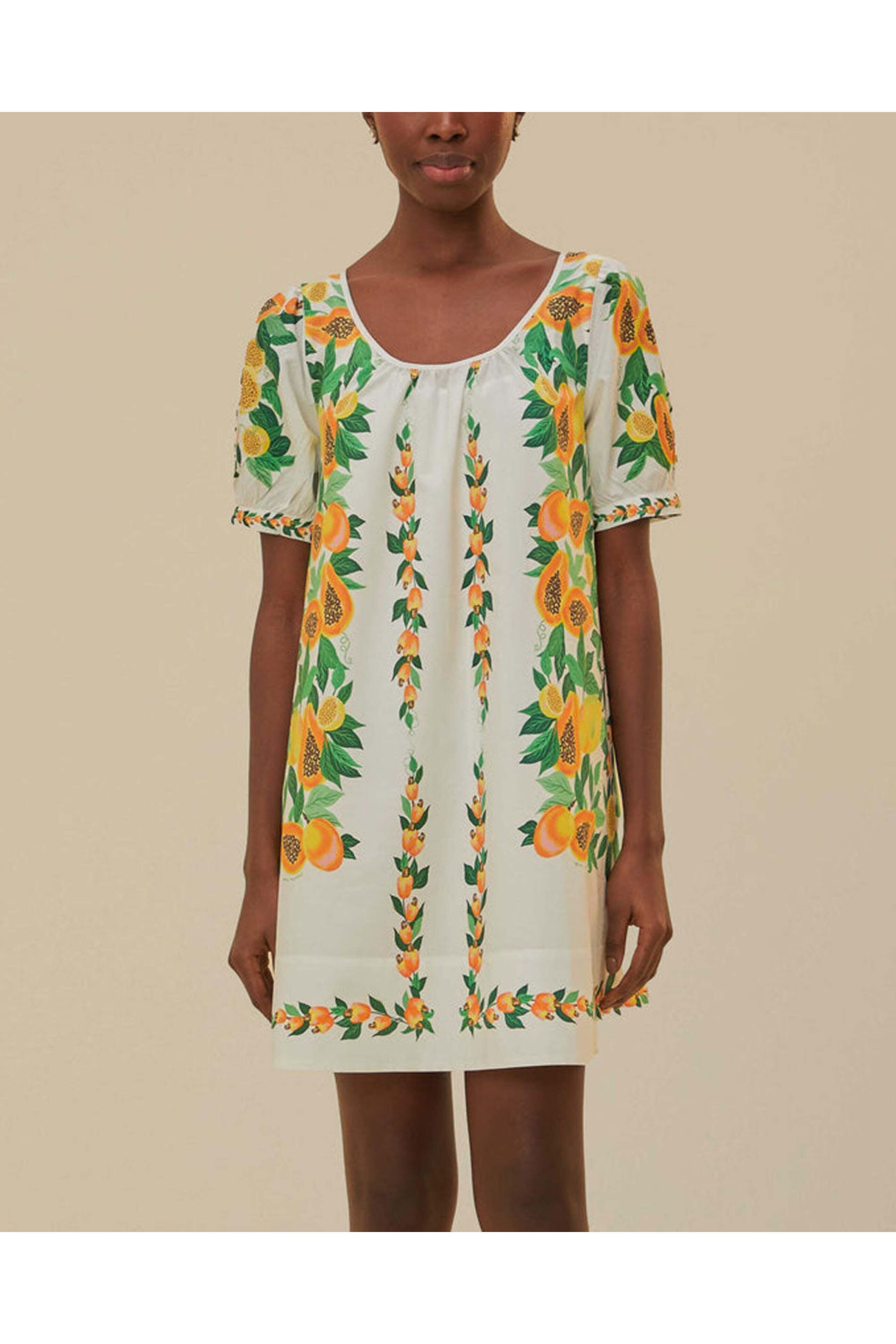 Farm Rio Papaya Salad Scarf Mini Dress . Scoop neck . Short sleeves . Side-seam pockets . Relaxed fit . Pulls over . 100% cotton .