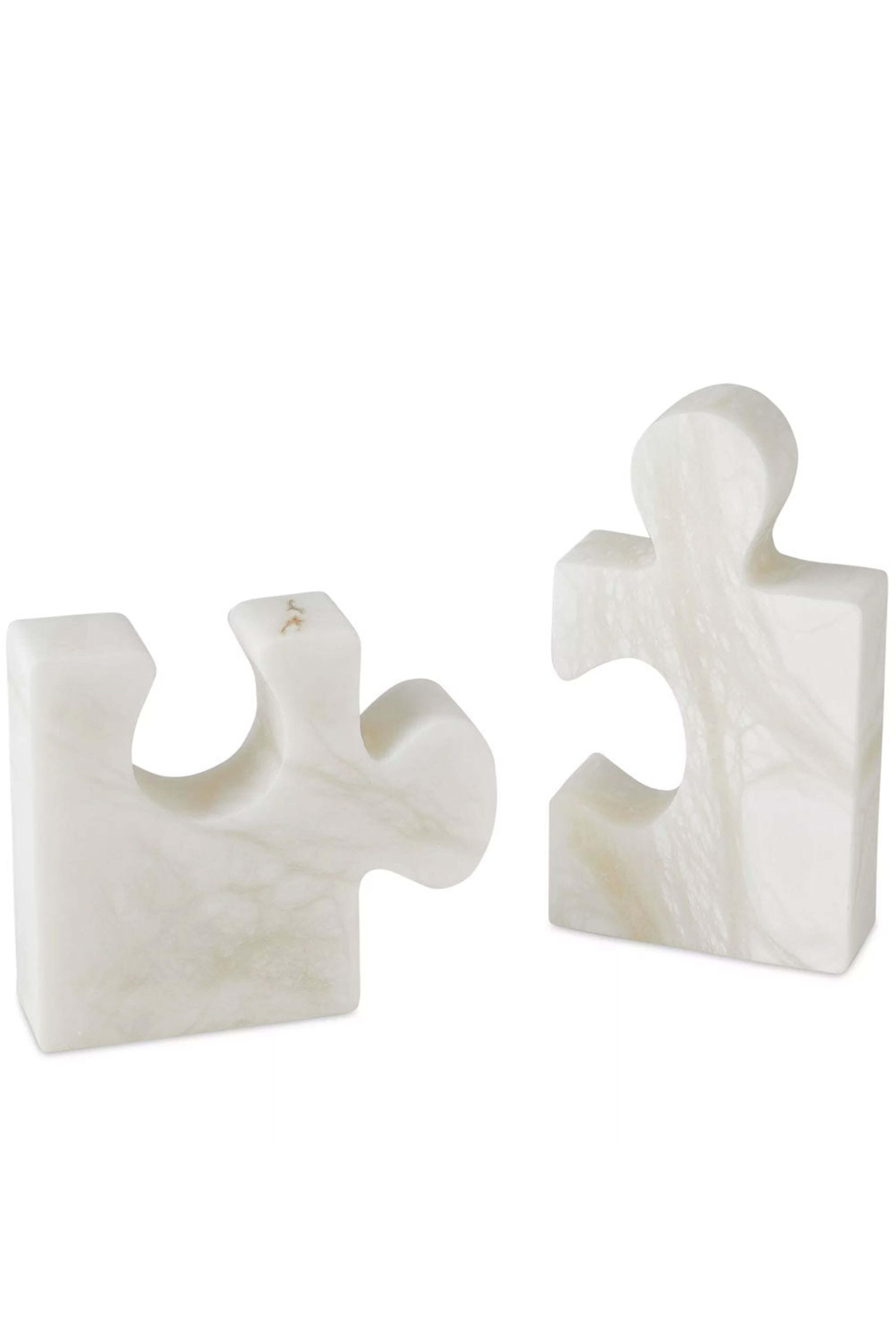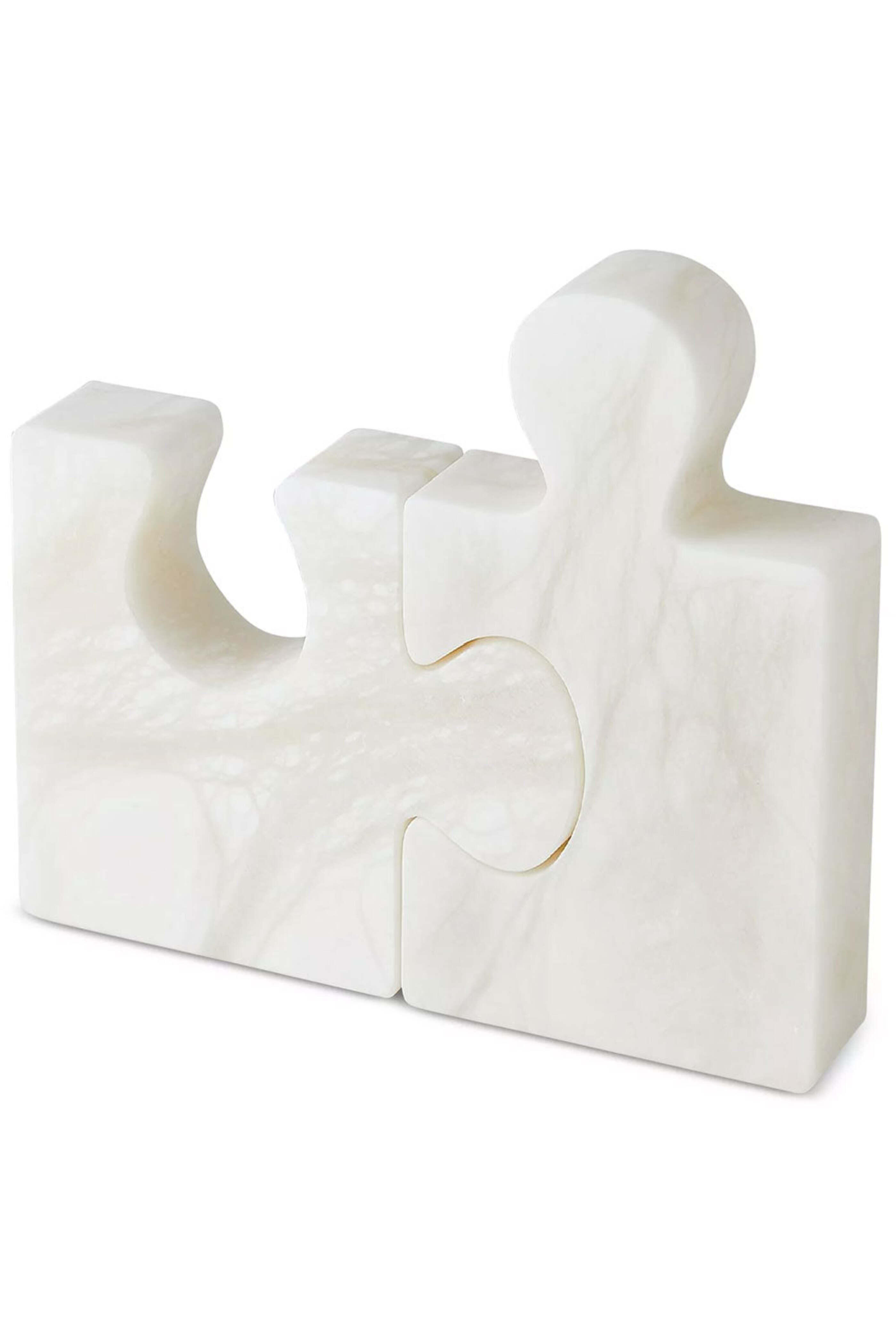 Global Views Alabaster Jigsaw Bookends in White. A whimsical set of two bookends made of Italian alabaster. Set of two bookends. Jigsaw puzzle design. 5"L x 2.5"W x 9.75"H. Made in Italy.