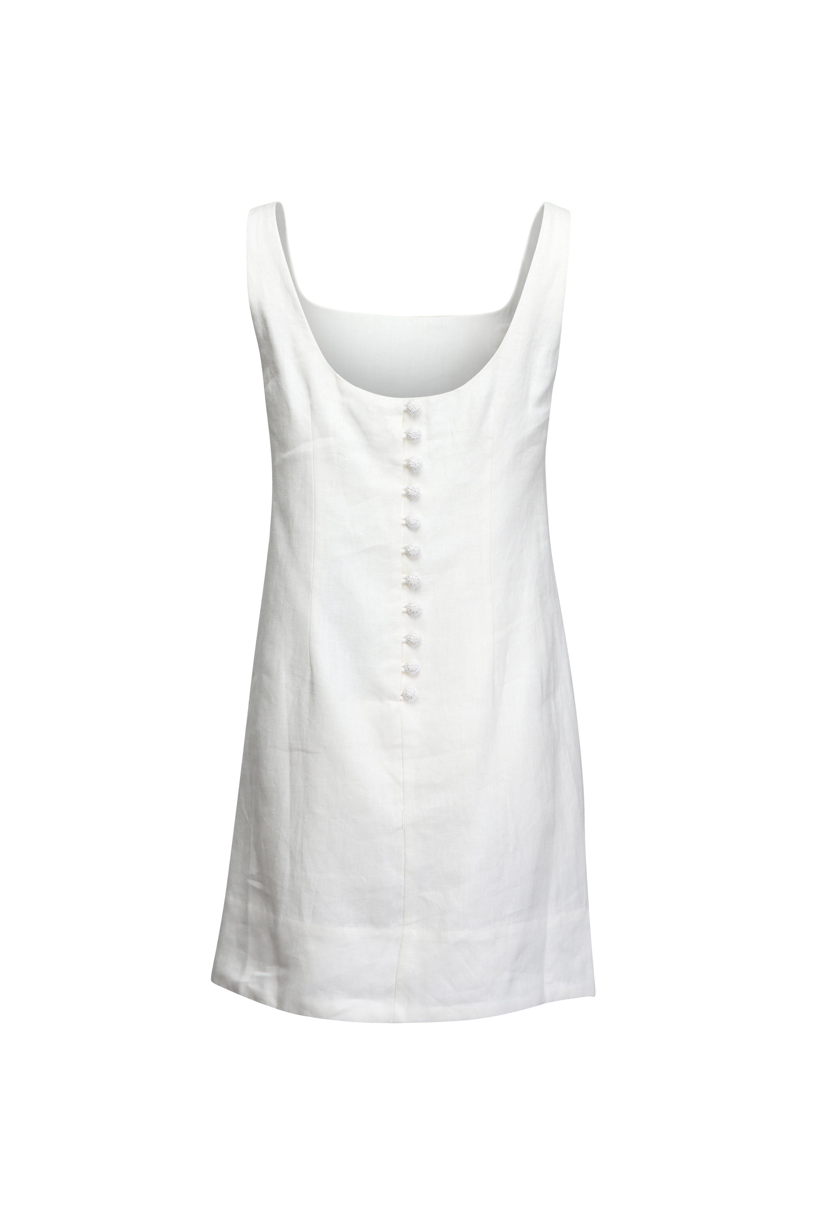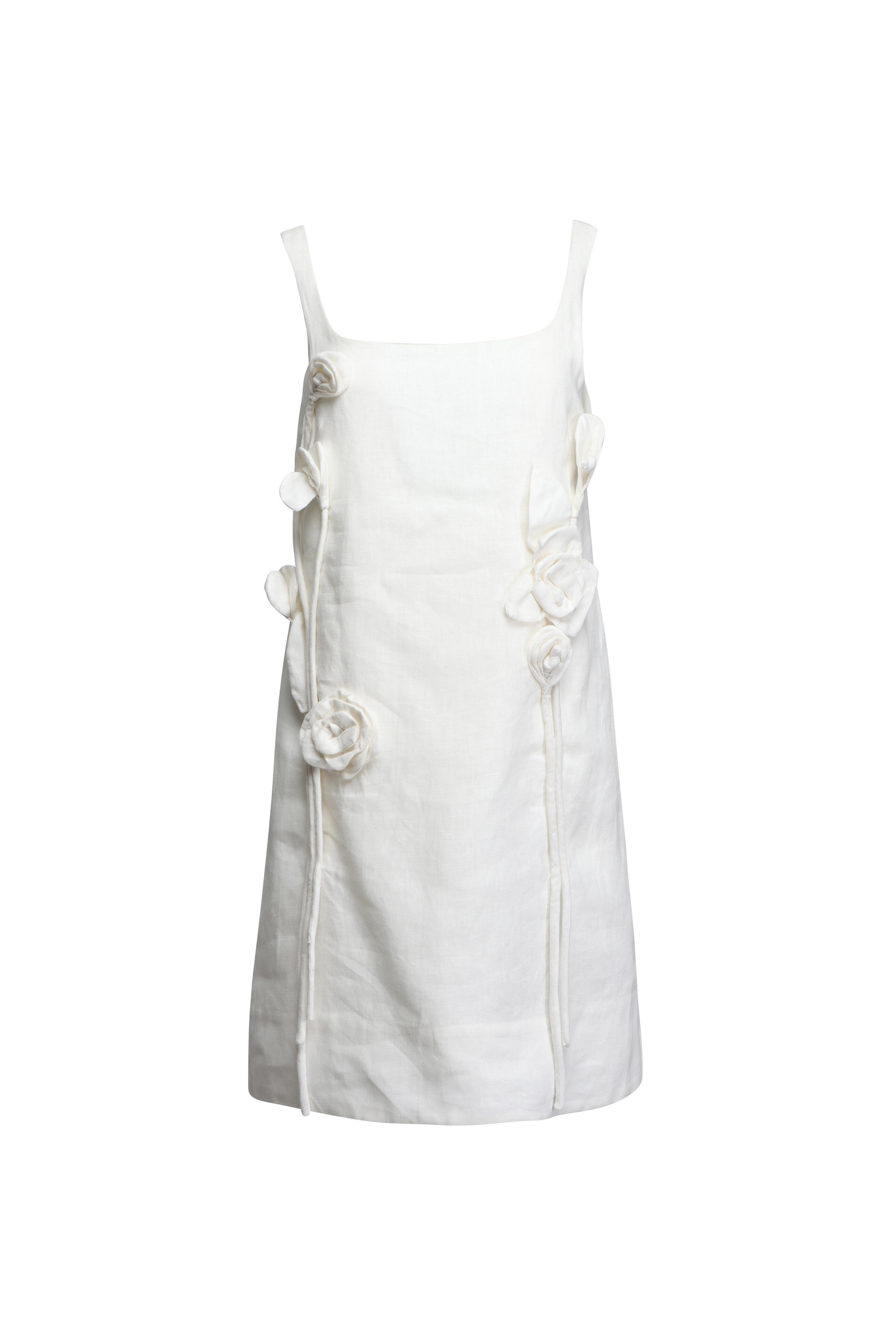 Square neck. Scoop back. Sleeveless; thick shoulder straps. Back button detail. Shift silhouette. Applique detail; self fabrication. Imported. Waist 33” (Size S). Hip 38.5” (Size S). Length 33.75” (Size S). 100% linen. Machine washable.