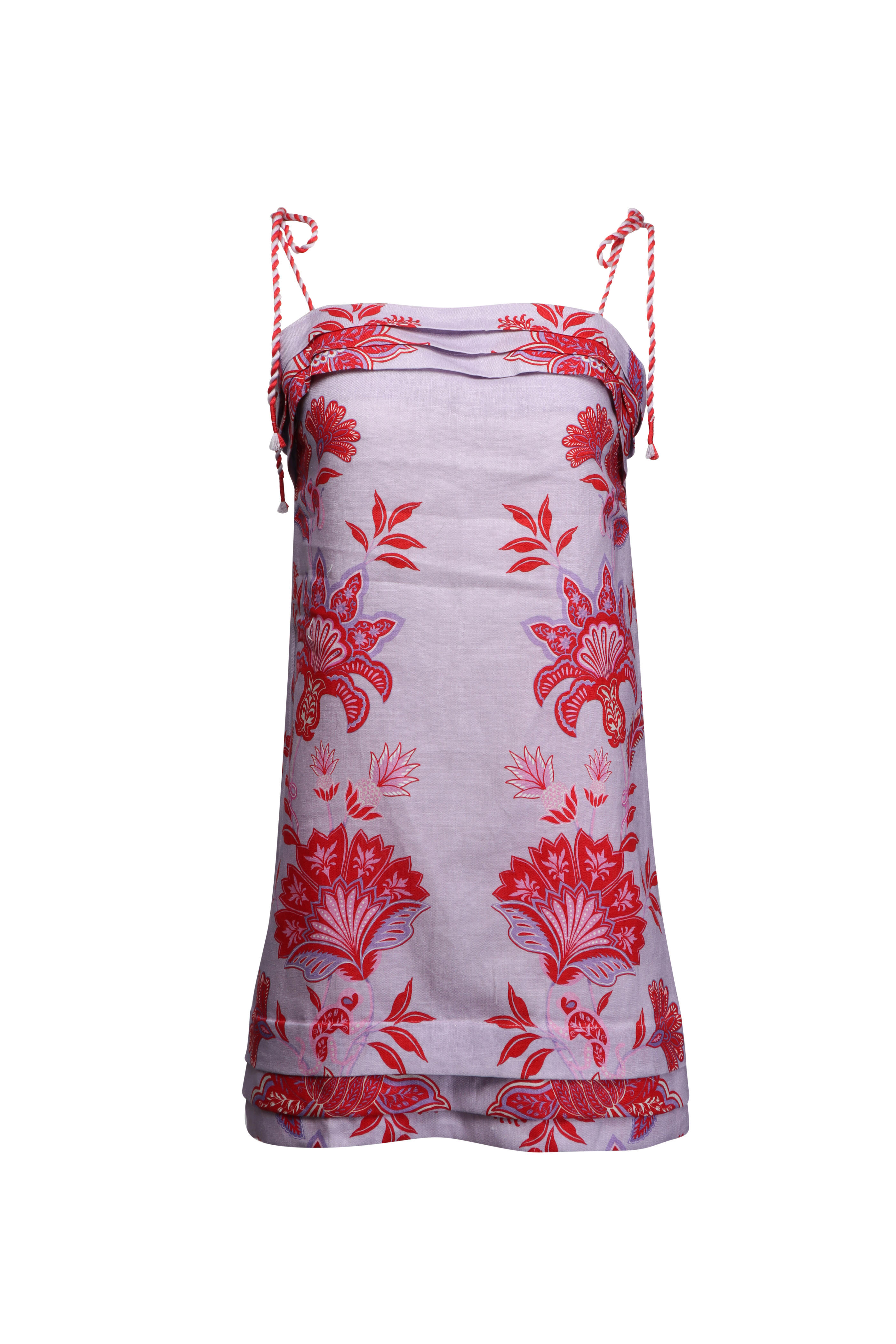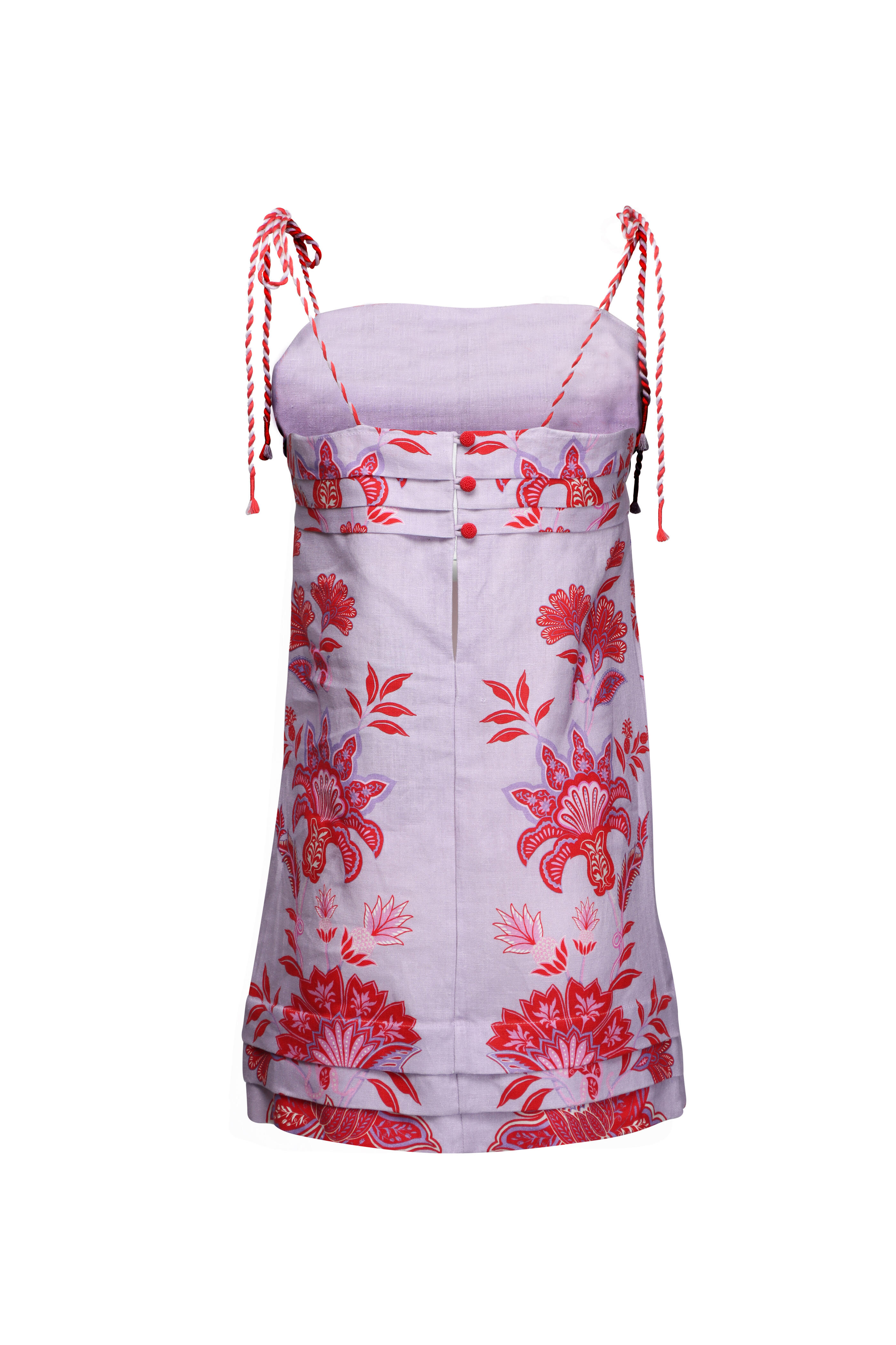 Square neck. Square back. Sleeveless; thin rope shoulder straps. Back button detail; beaded buttons. Shift silhouette. Pleated at neckline and hem. Imported. Bust 33.75” (Size S). Hip 38.5” (Size S). Length 26.75” (Size S). 100% linen. Machine washable.