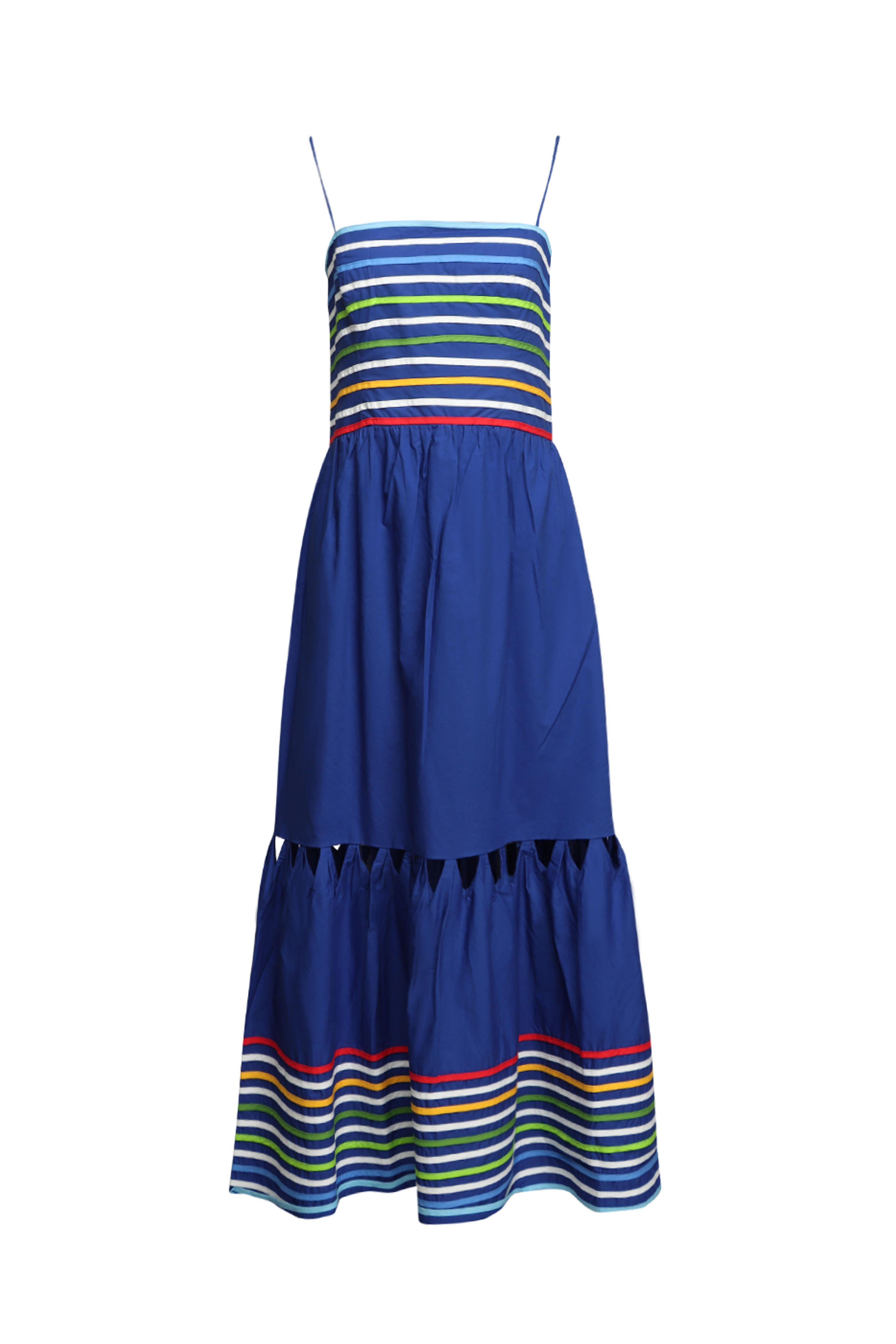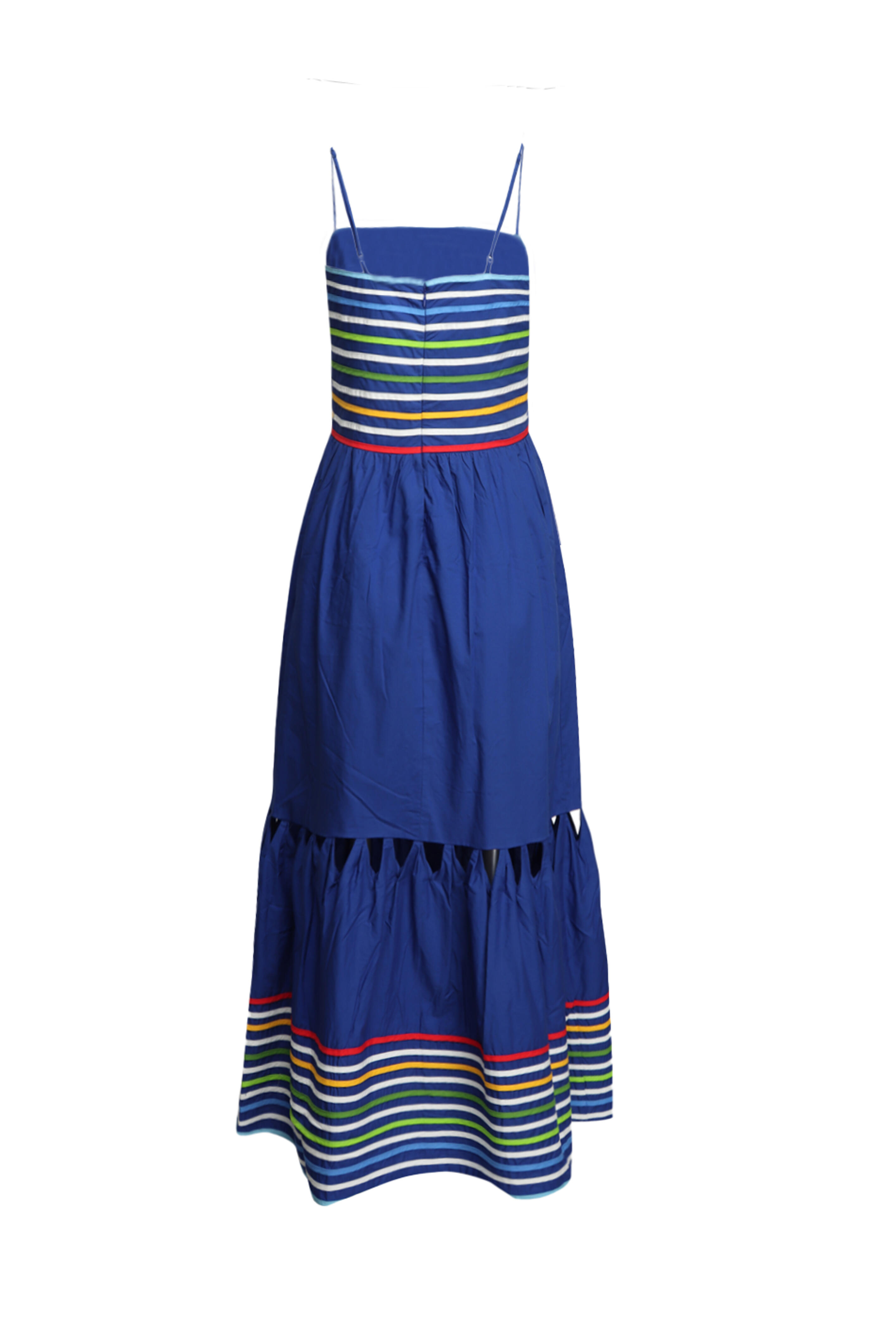Blue Striped Midi Dress. Square neck. Square back. Sleeveless; thin shoulder straps. Concealed back zip closure. Midi length. Flounce hem; cutout detail. 100% cotton.