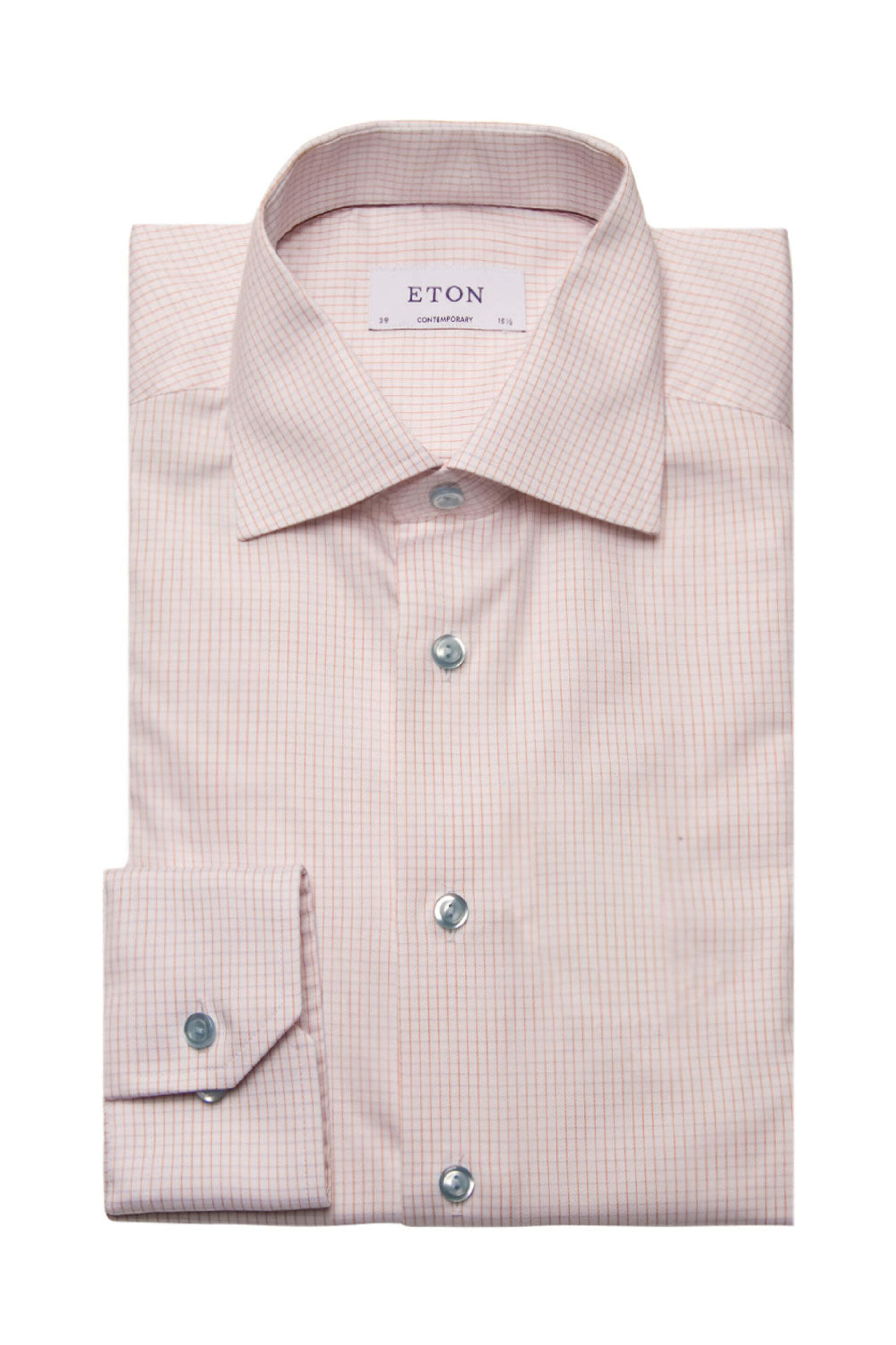 Eton Orange Check Dobby Dress Shirt. Point collar. Long sleeve. Button down. Mitered cut cuff. Single button cuff. Made in Europe. 100% cotton.