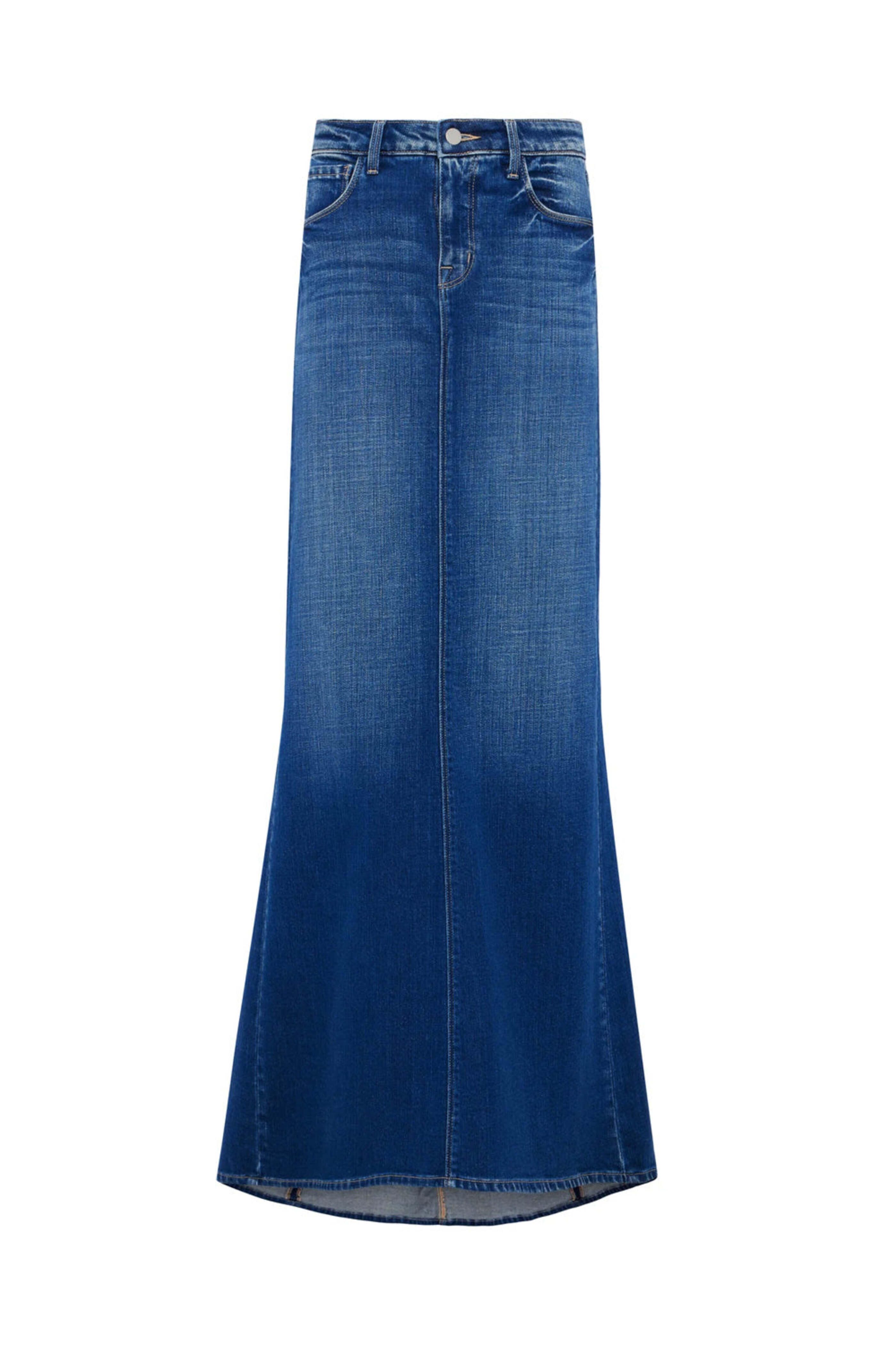 LAgence Athos Kalani Mermaid Denim Skirt. High rise. Button closure. Zip fly. Belt loops. Five pocket style. Slim through hip. Maxi length. High low hem. Denim fabrication. 94% cotton, 5% polyester, 1% spandex.