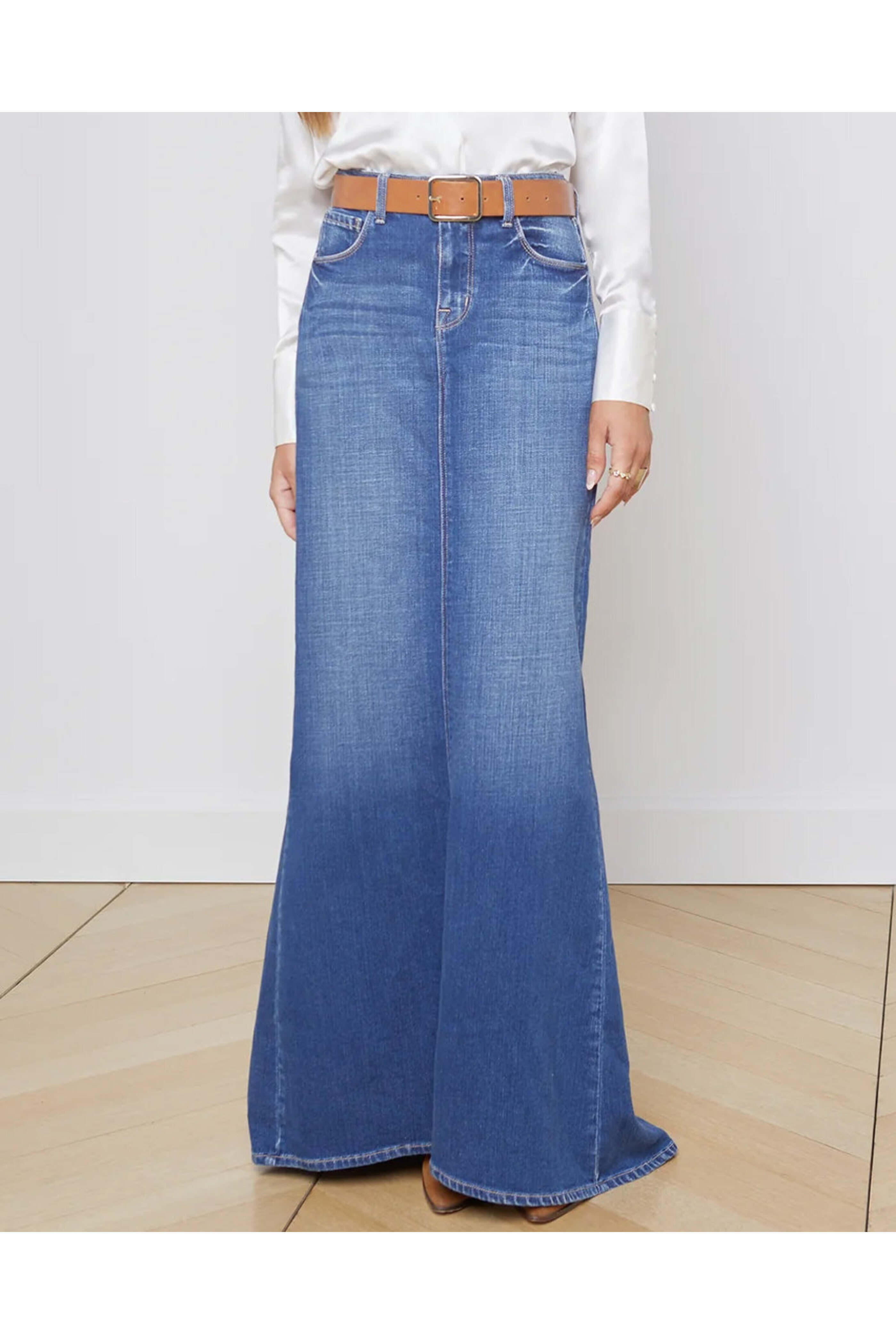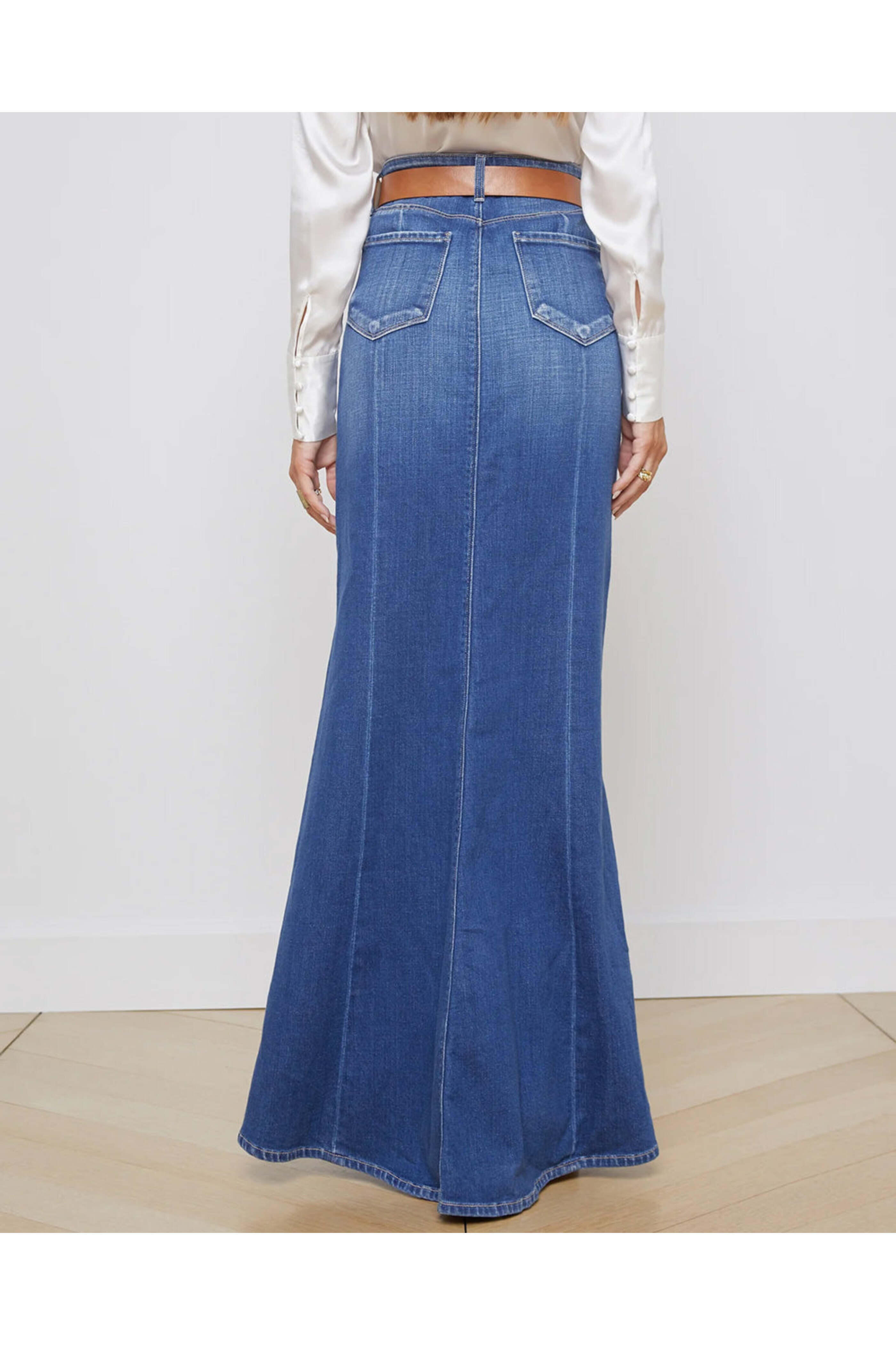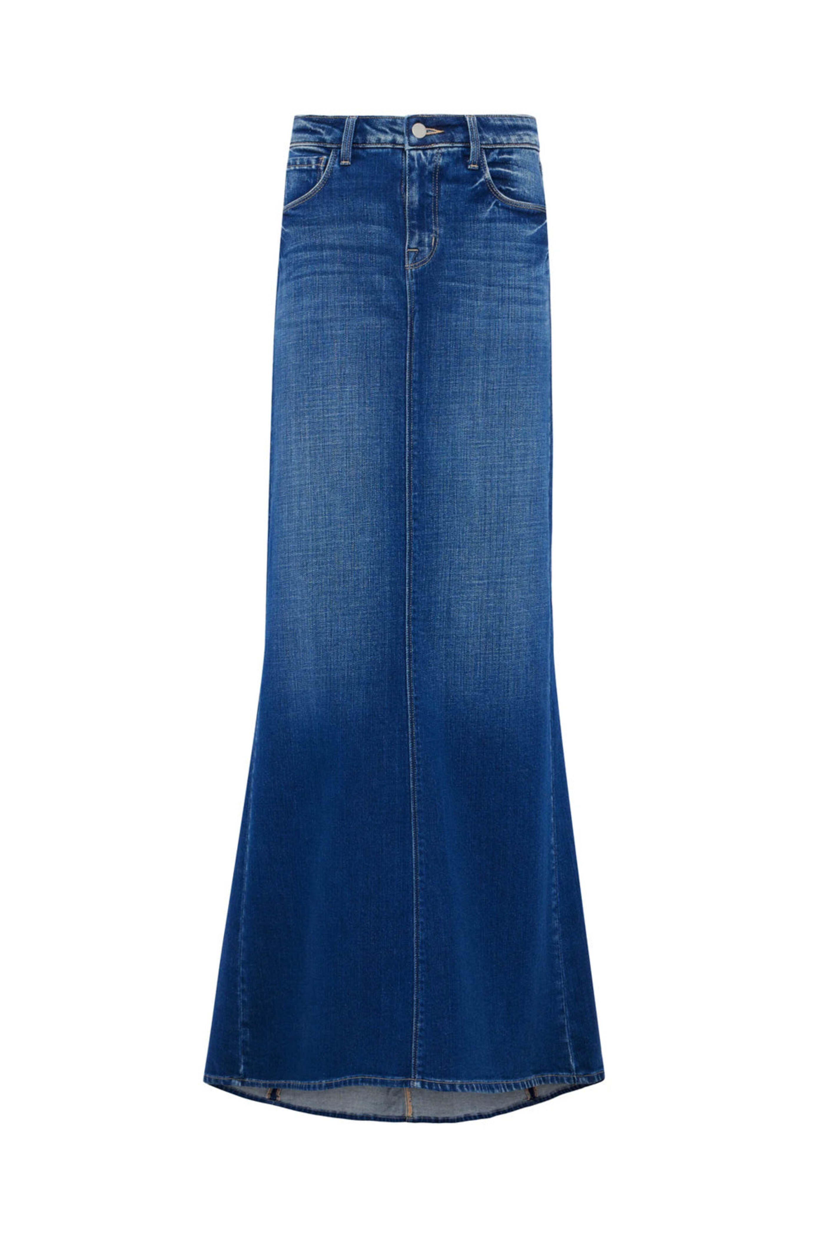 LAgence Athos Kalani Mermaid Skirt. High rise. Button closure. Zip fly. Belt loops. Five pocket style. Slim at hip. Flare hem. Maxi length. 94% cotton, 5% polyester, 1% spandex.