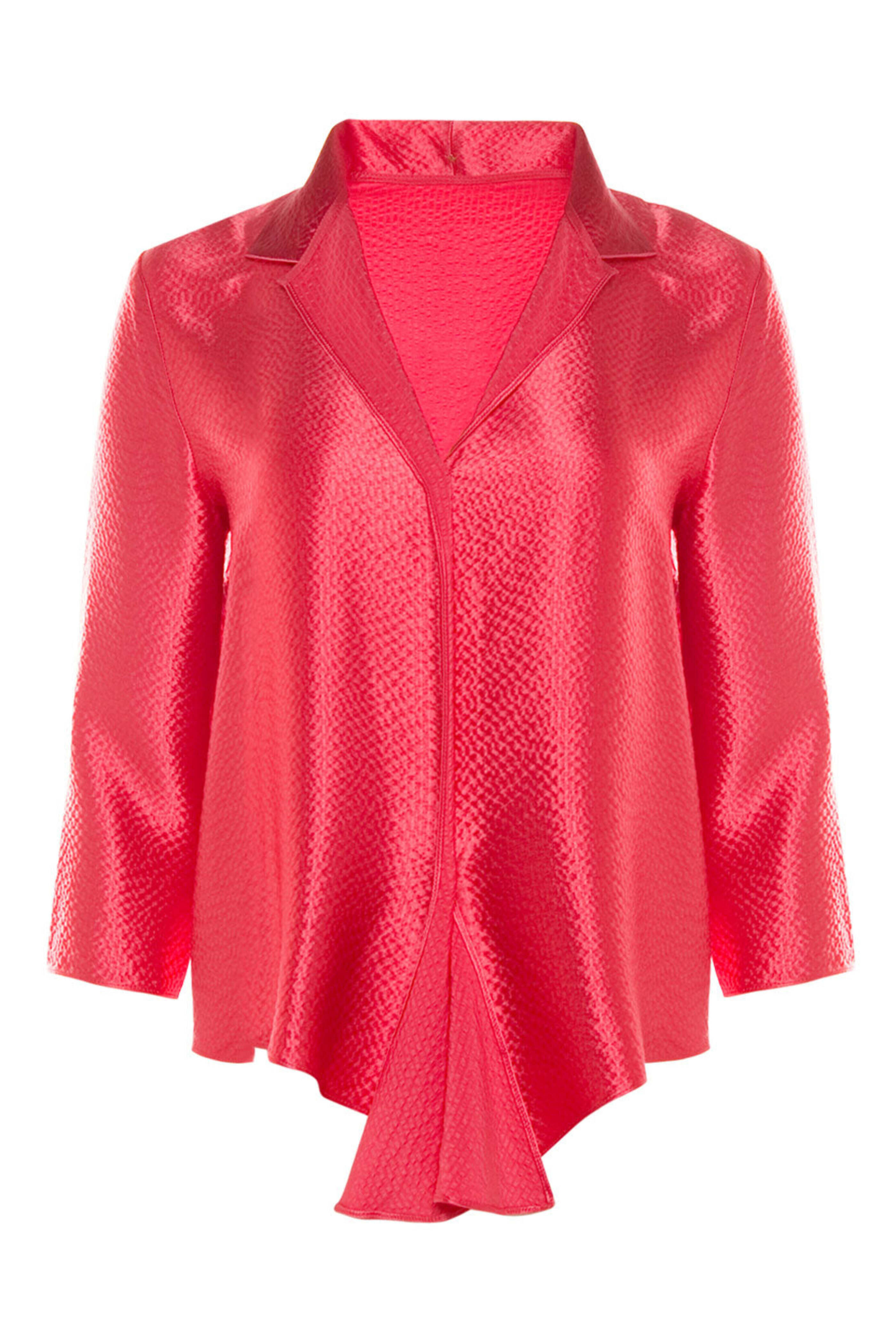 Peter Cohen Flamingo Frolic Top. Collar. V neck. ¾ length sleeves. Center front foldover. Draped hem detail. Relaxed fit. Hammered silk satin fabrication. Made in USA. 100% silk.