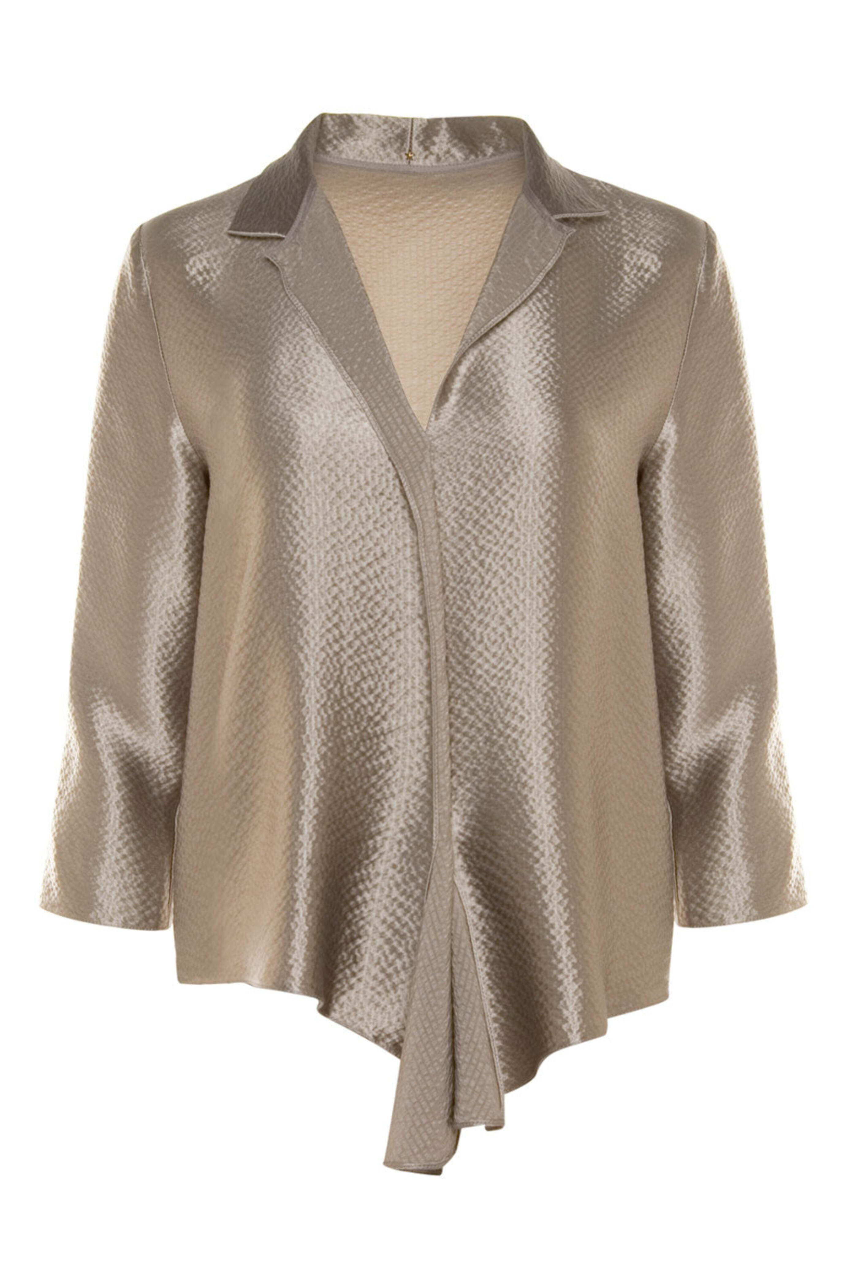 Peter Cohen Platinum Frolic Top. Collar. V neck. ¾ length sleeves. Center front foldover. Draped hem detail. Relaxed fit. Hammered silk satin fabrication. Made in USA. 100% silk.