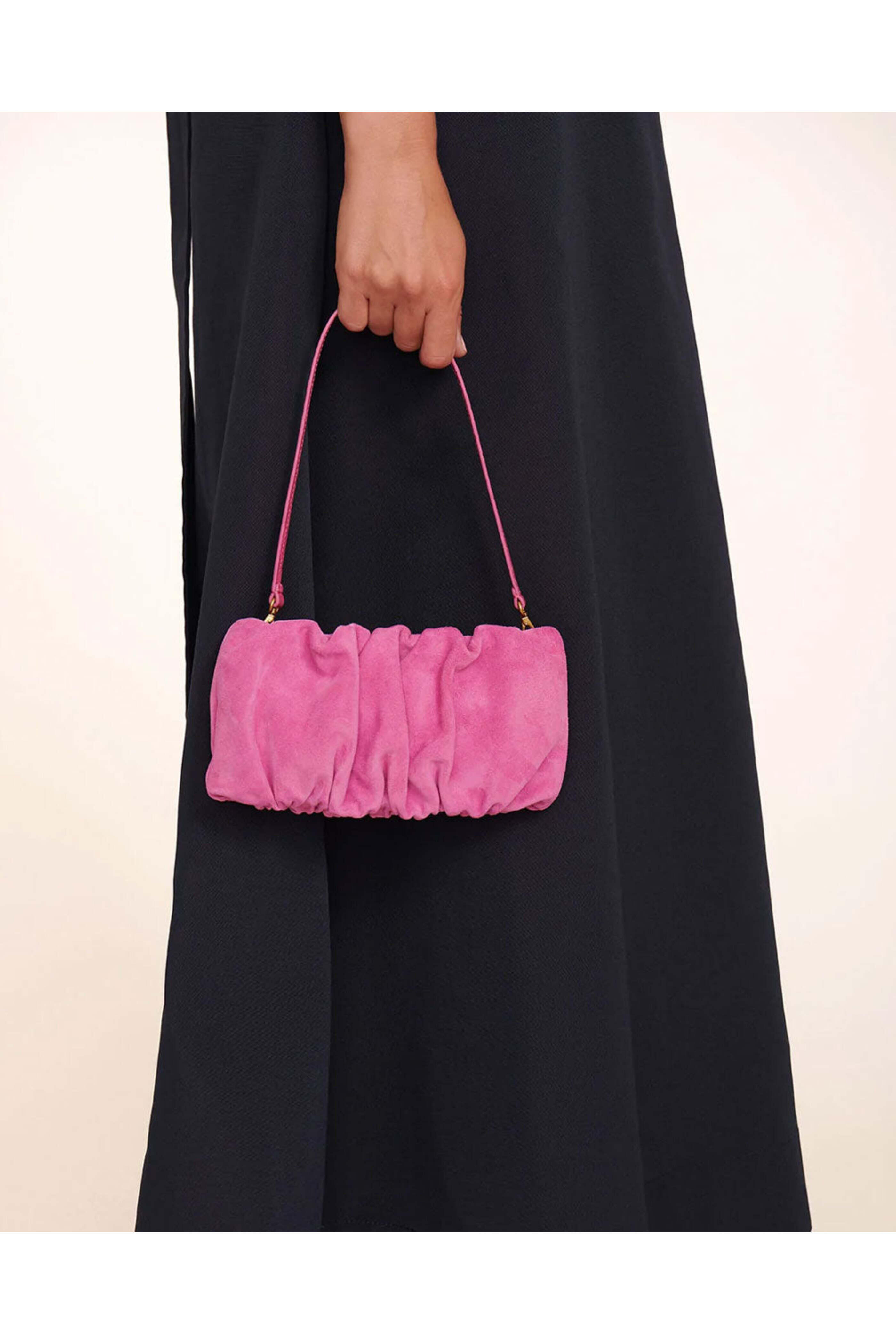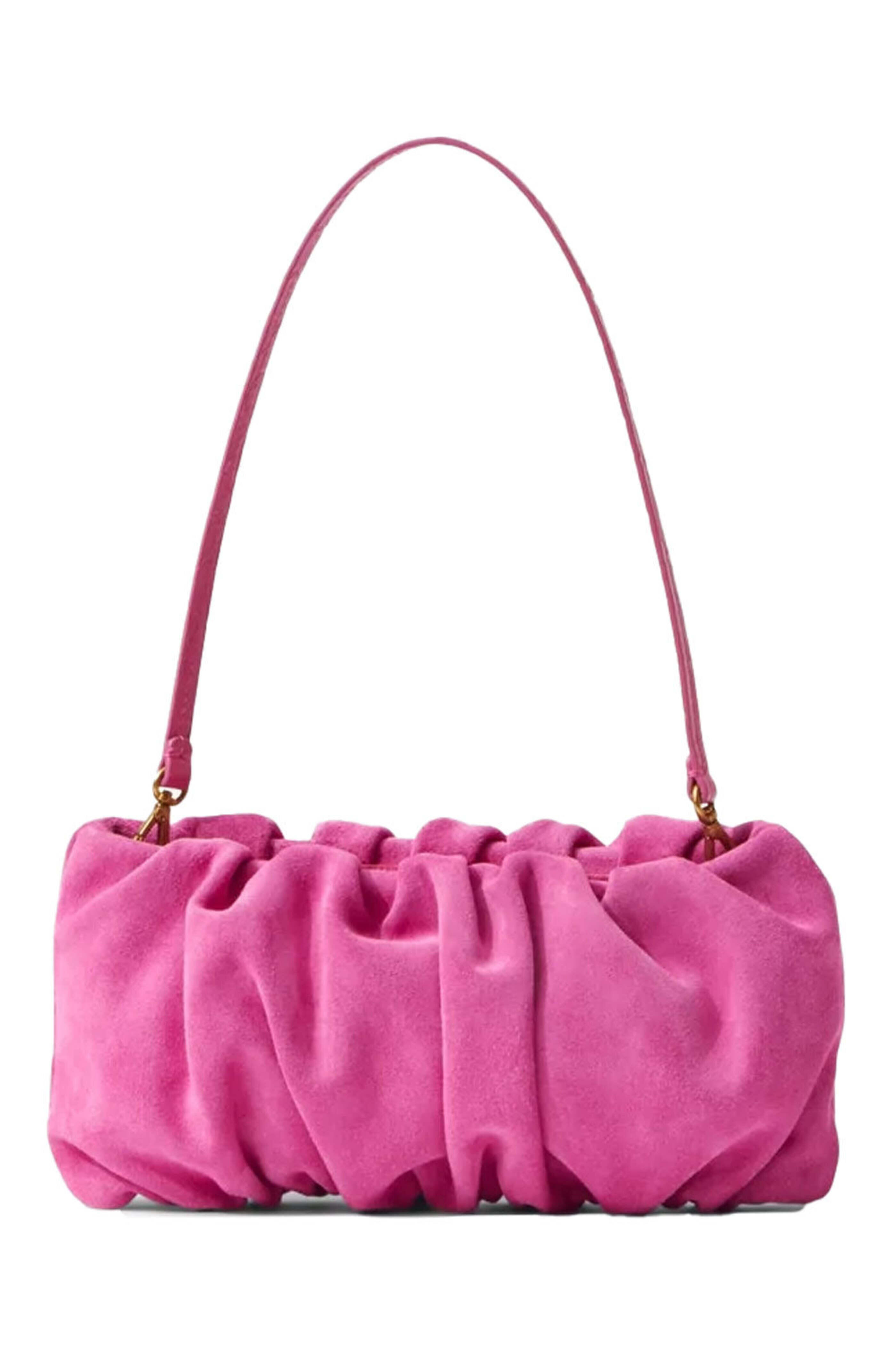 STAUD Bean Convertible Bag Lollipop. Top zip closure. Convertible shoulder strap. Interior slip pocket. Gold tone hardware. Suede outer and lining. 10.5 W X 4.5 H X 1 D. 8.5 handle drop.
