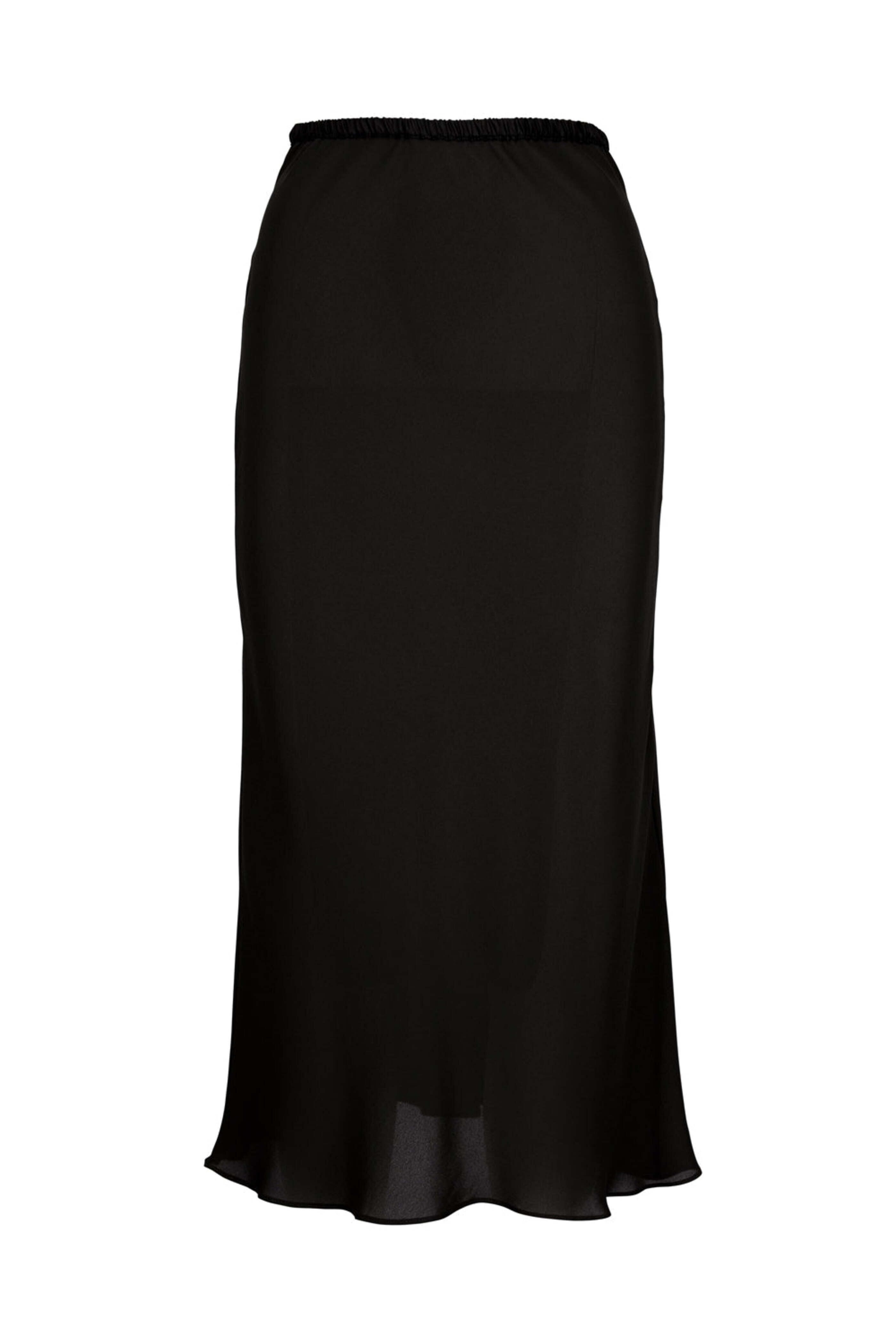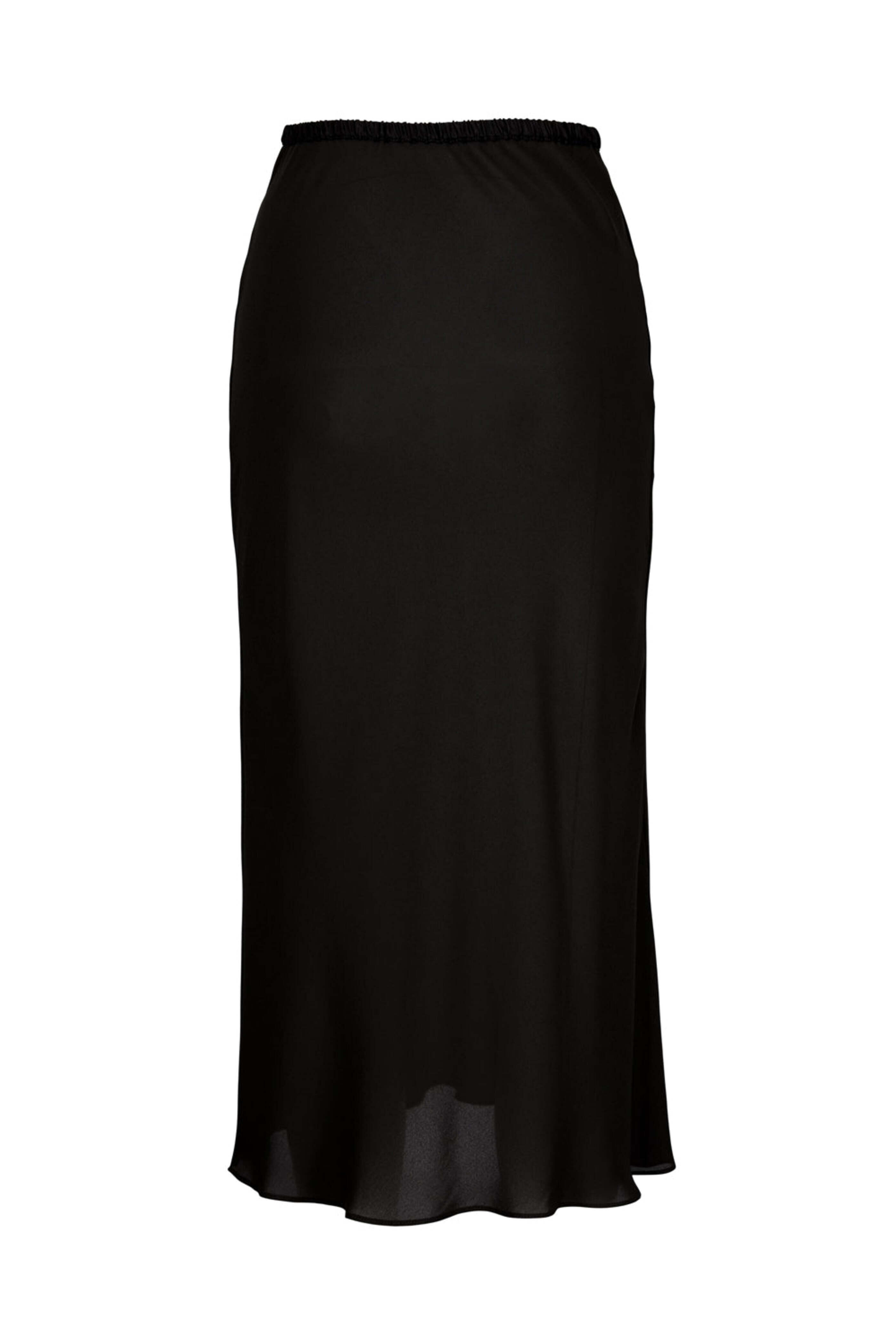 Elastic waist. Flare silhouette. Midi length. Made in USA. 100% silk. Dry clean.