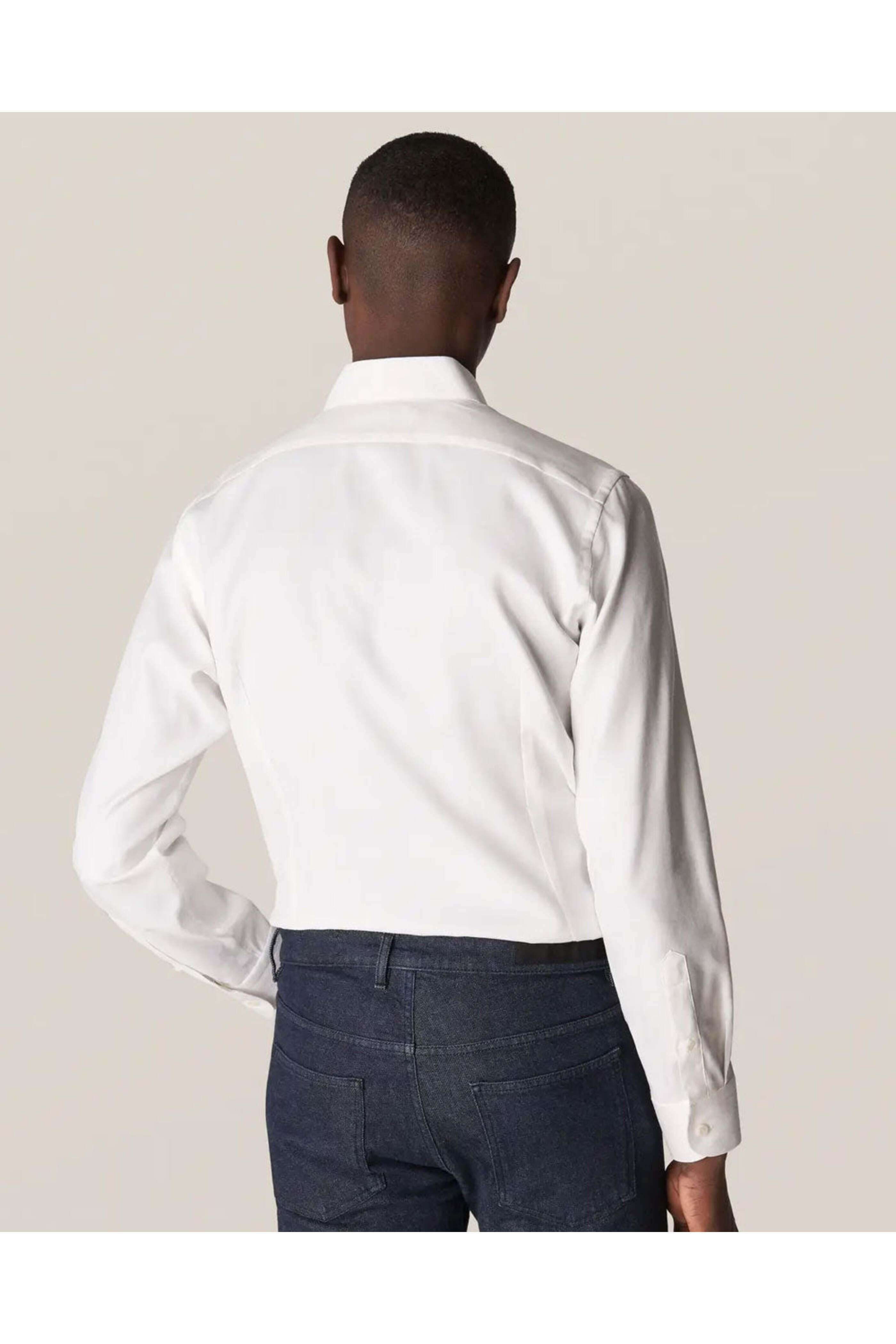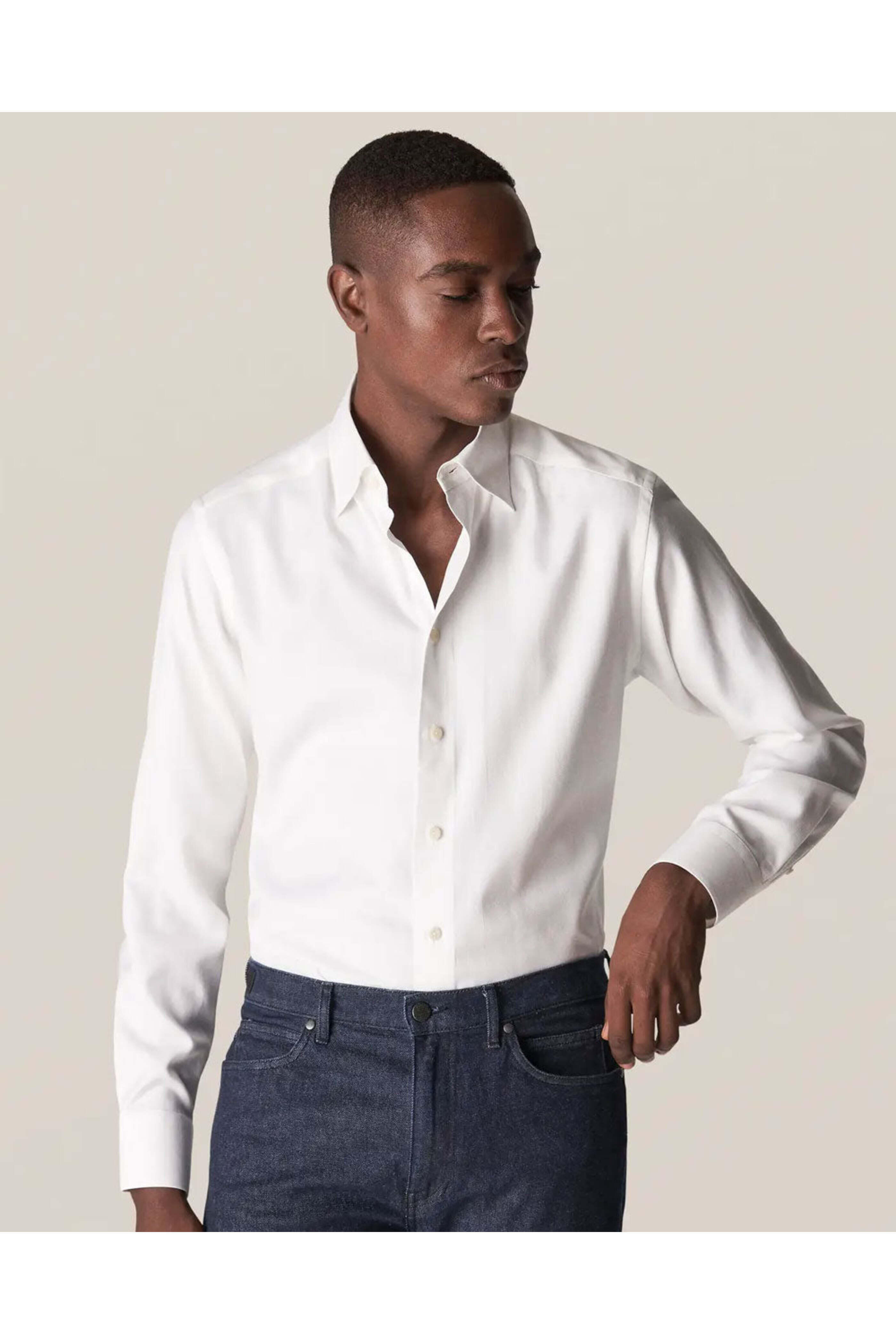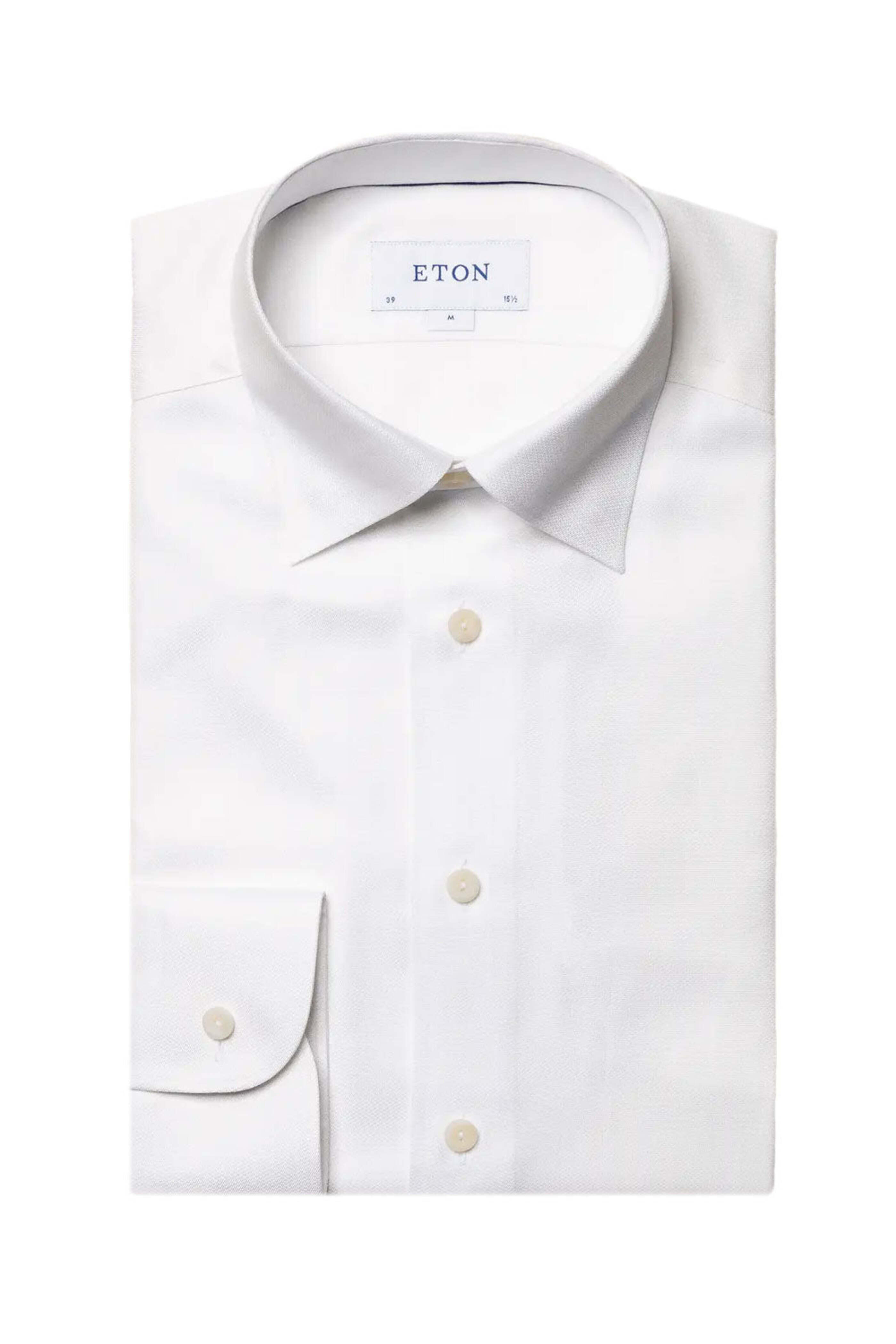 Eton White Stretch Knit-Effect Dress Shirt. Button under collar. Long sleeve. Button down. Rounded single cuff. Contemporary fit. 73% cotton, 3% elastane, 24% lyocell.