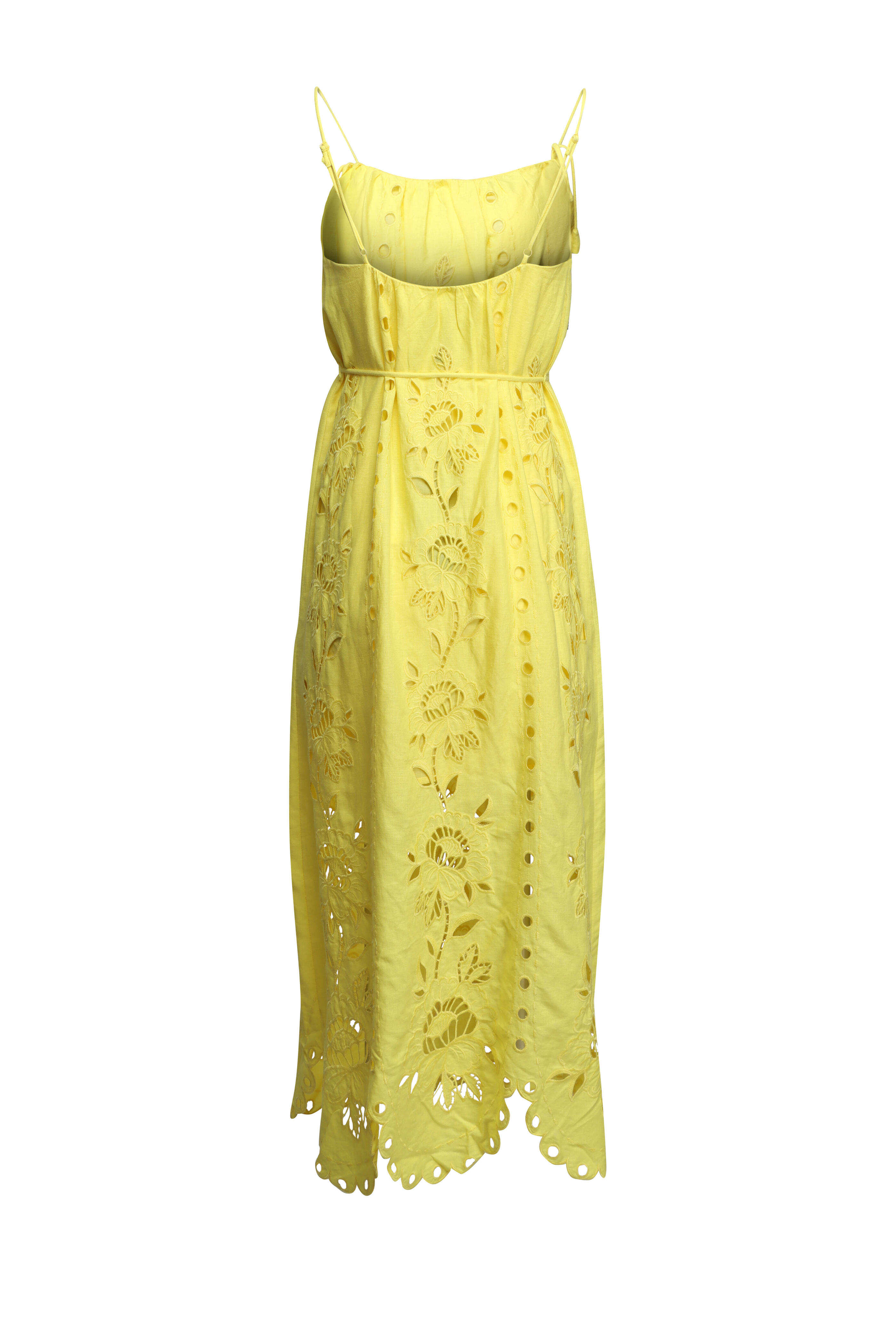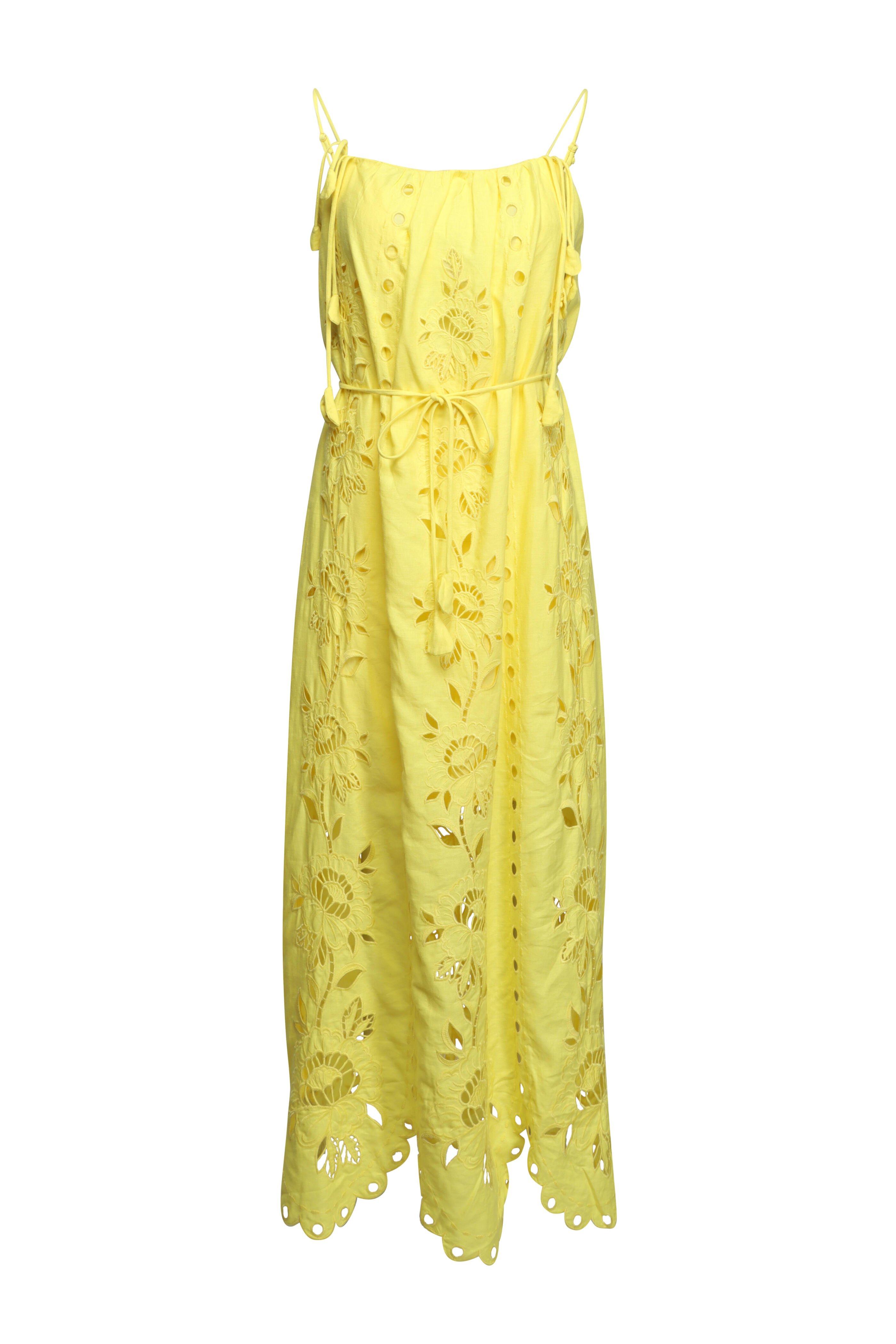 Square neck. Square back. Sleeveless; thin adjustable shoulder straps. Removable self-tie belt. Relaxed fit. Midi length. Scalloped hem. Richelieu embroidered detail throughout. Imported. Bust 30.75” (Size S). Waist 40.25” (Size S). Hip 44.75” (Size S). Length 47.25” (Size S). 55% linen, 45% viscose. Handwash.