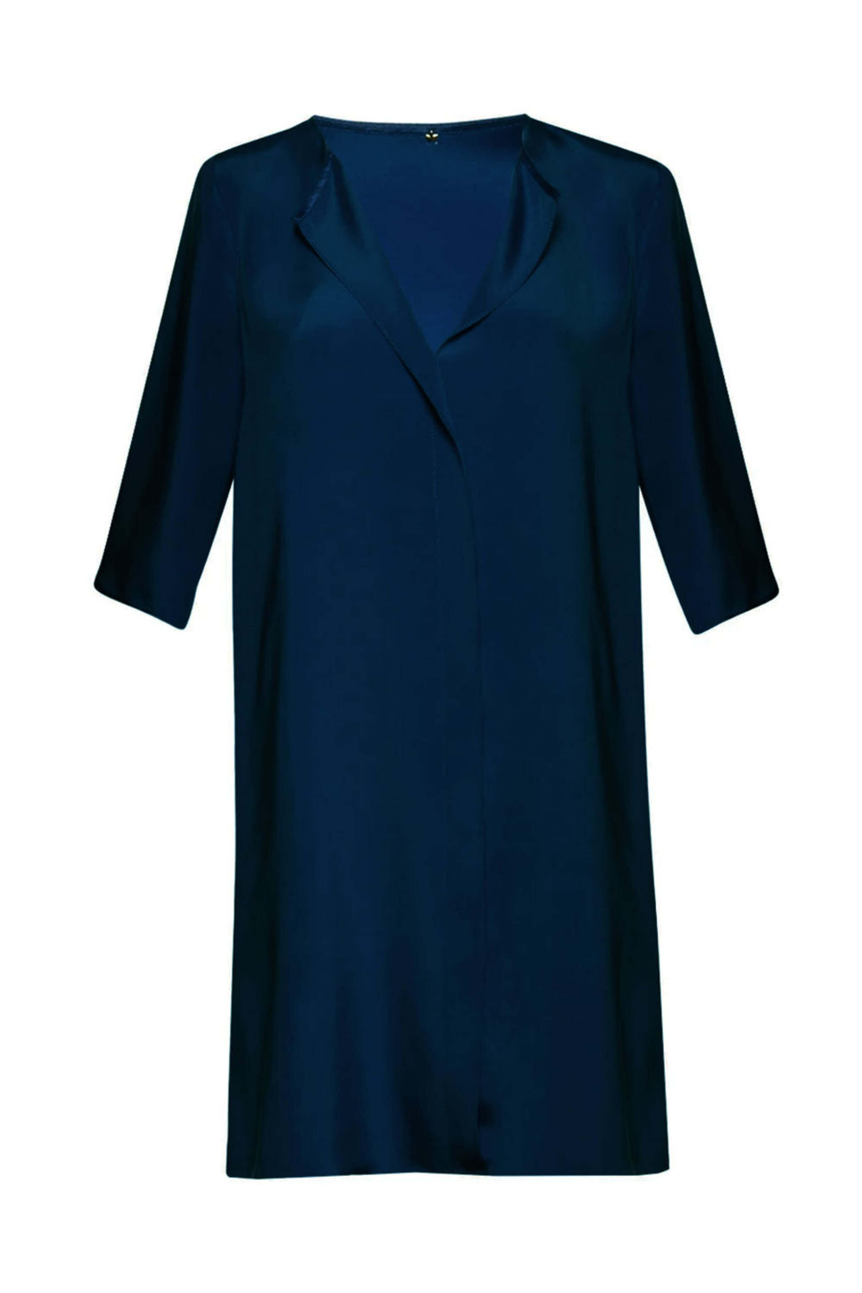 Peter Cohen Navy Oh Dress. V neck. ¾ length sleeves. Center front foldover. Midi length. Knee length. Relaxed fit. Made in USA. 100% silk.