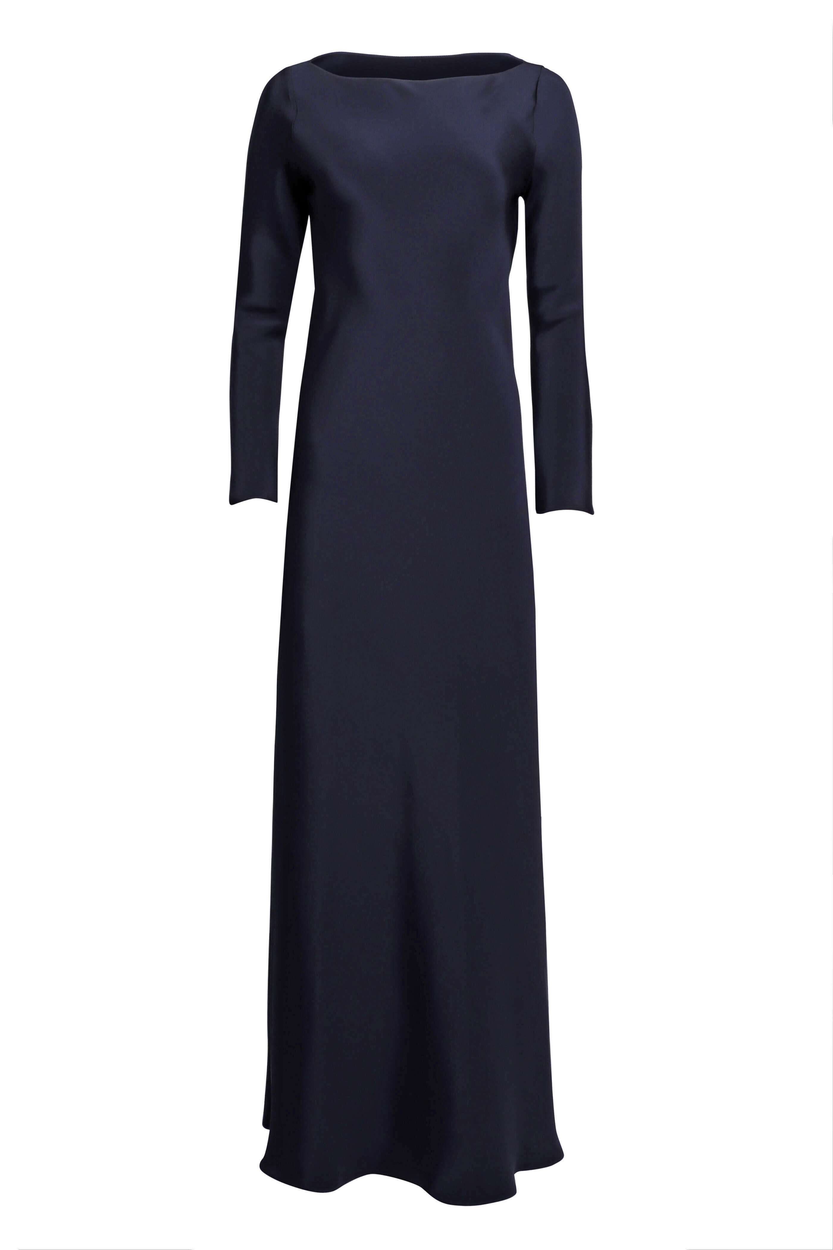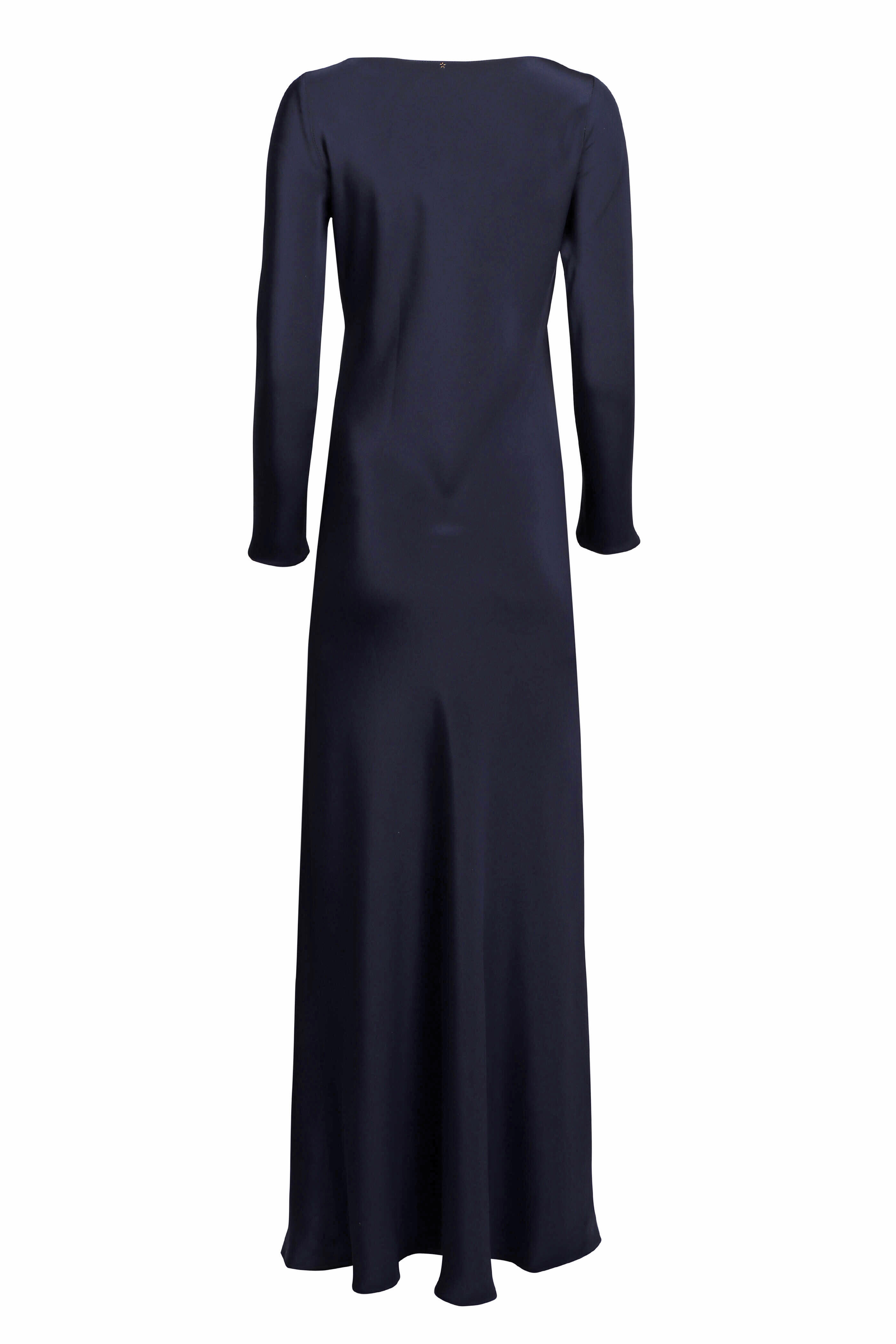 Boat neck. Long sleeves. Slim through waist. Flare hem. Made in USA. 100% silk. Dry clean.