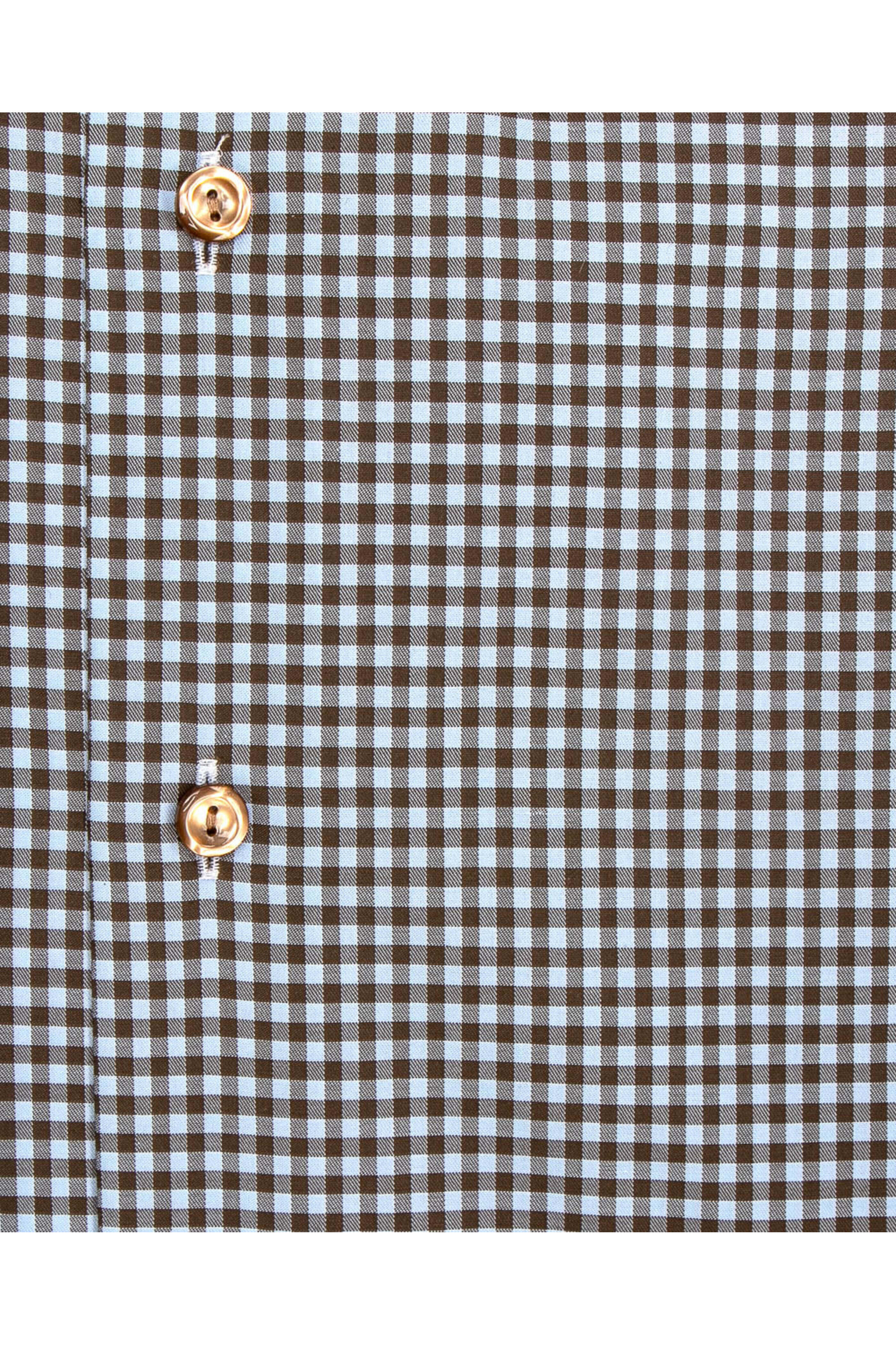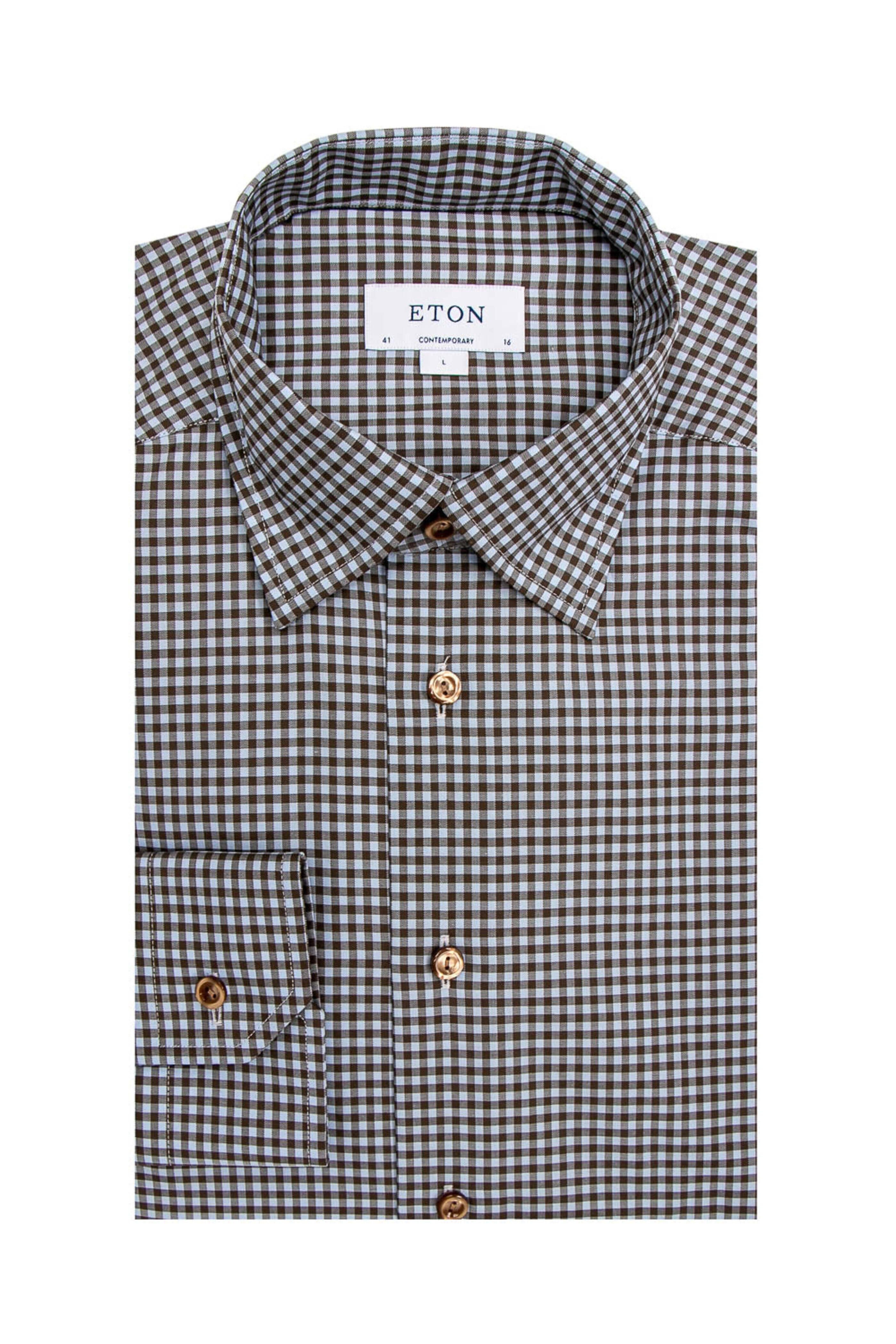 - Eton Chocolate and Sky-Blue Gingham Dress Shirt Contemporary fit Point collar Mitered cut cuff Single button cuff 100% cotton Made in Europe