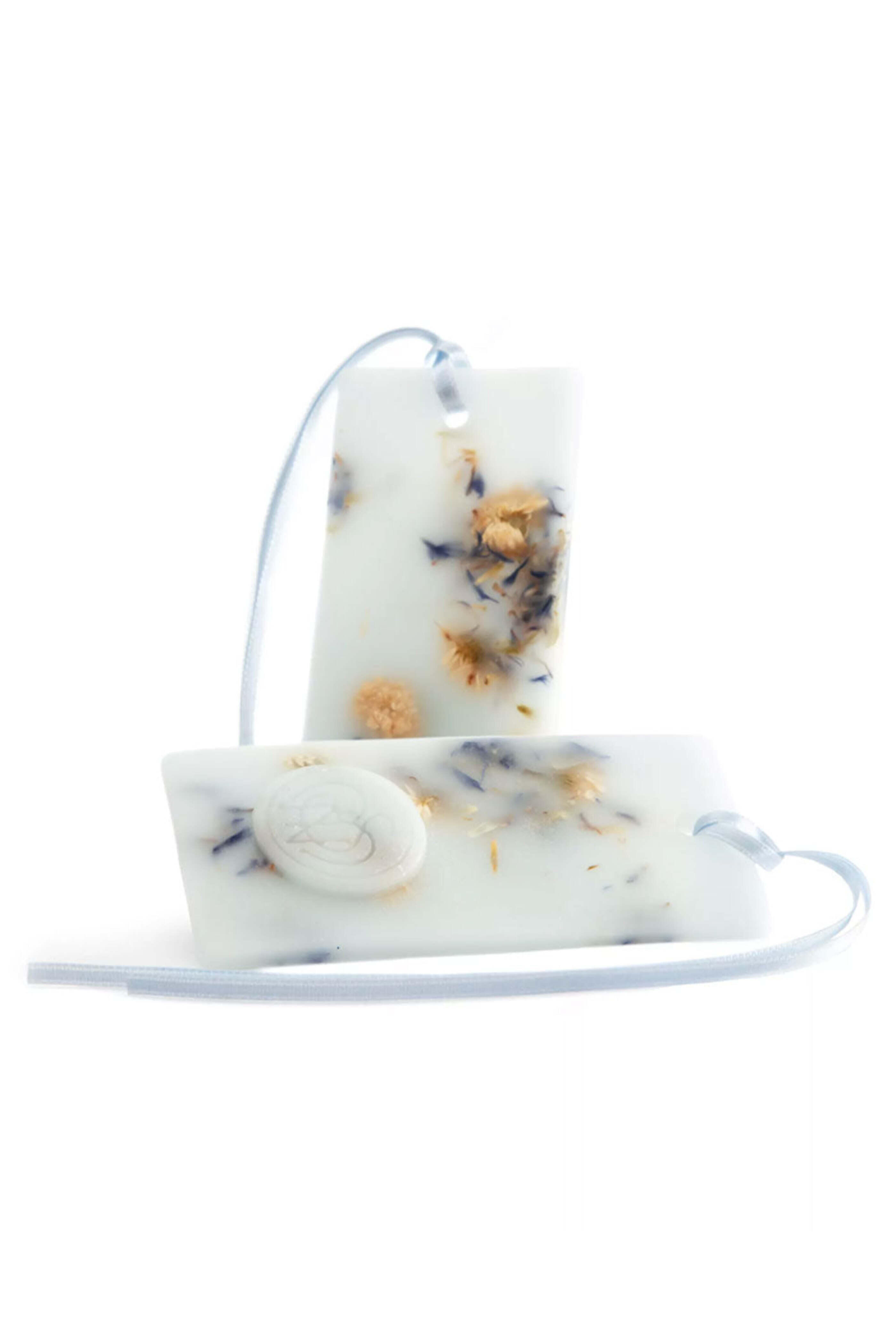 Santa Maria Novella Angeli Di Firenze Wax Tablets. From the Firenze 1221 Edition. These scented wax tablets are molded and hand-finished. Decorated with blue cornflower petals and Chamomile blossoms. Top notes: peach, orange. Middle notes: marine, jasmine, blackcurrant. Base notes: sandalwood, vanilla, musk. Set of two, each 1 oz. Made in Italy.