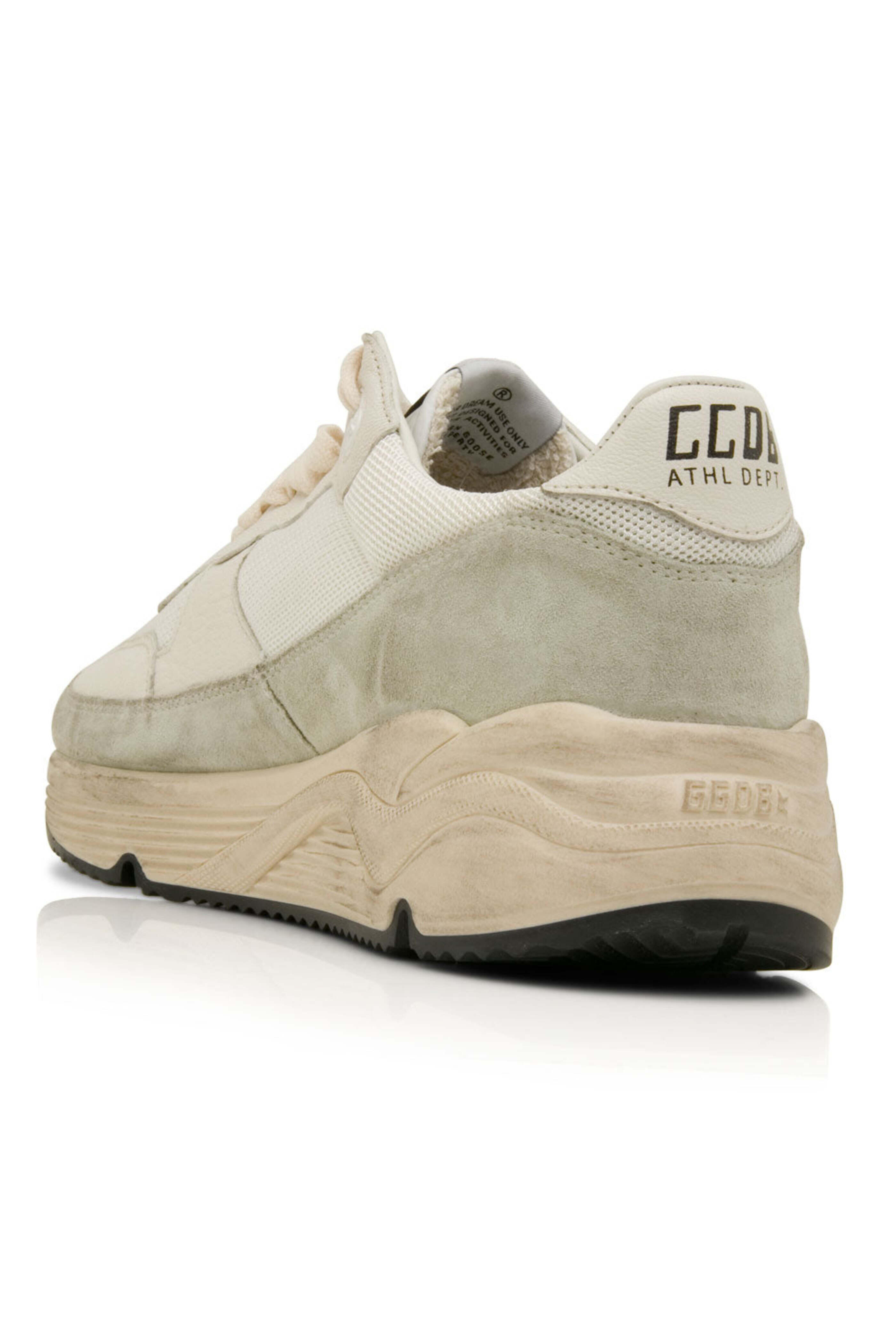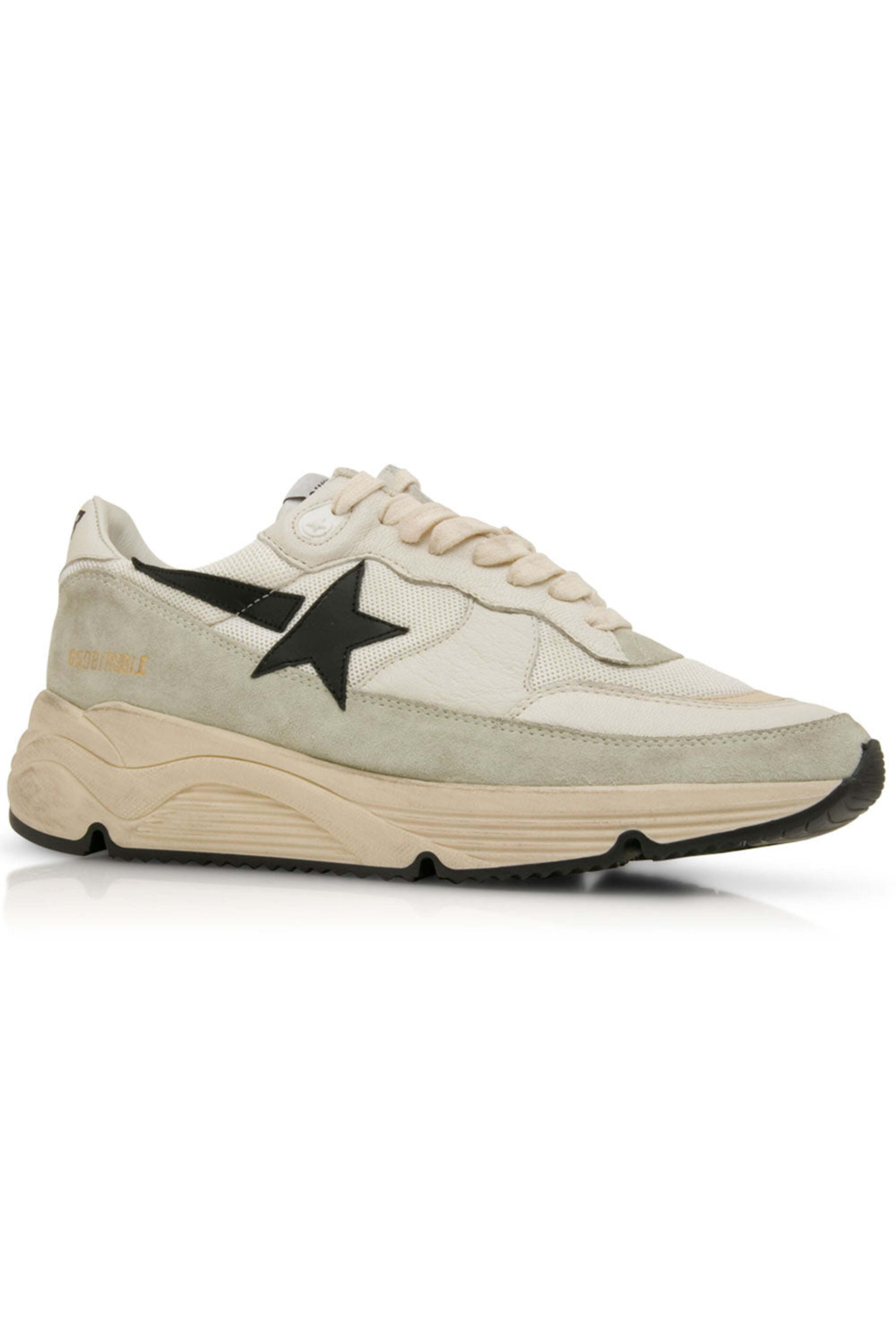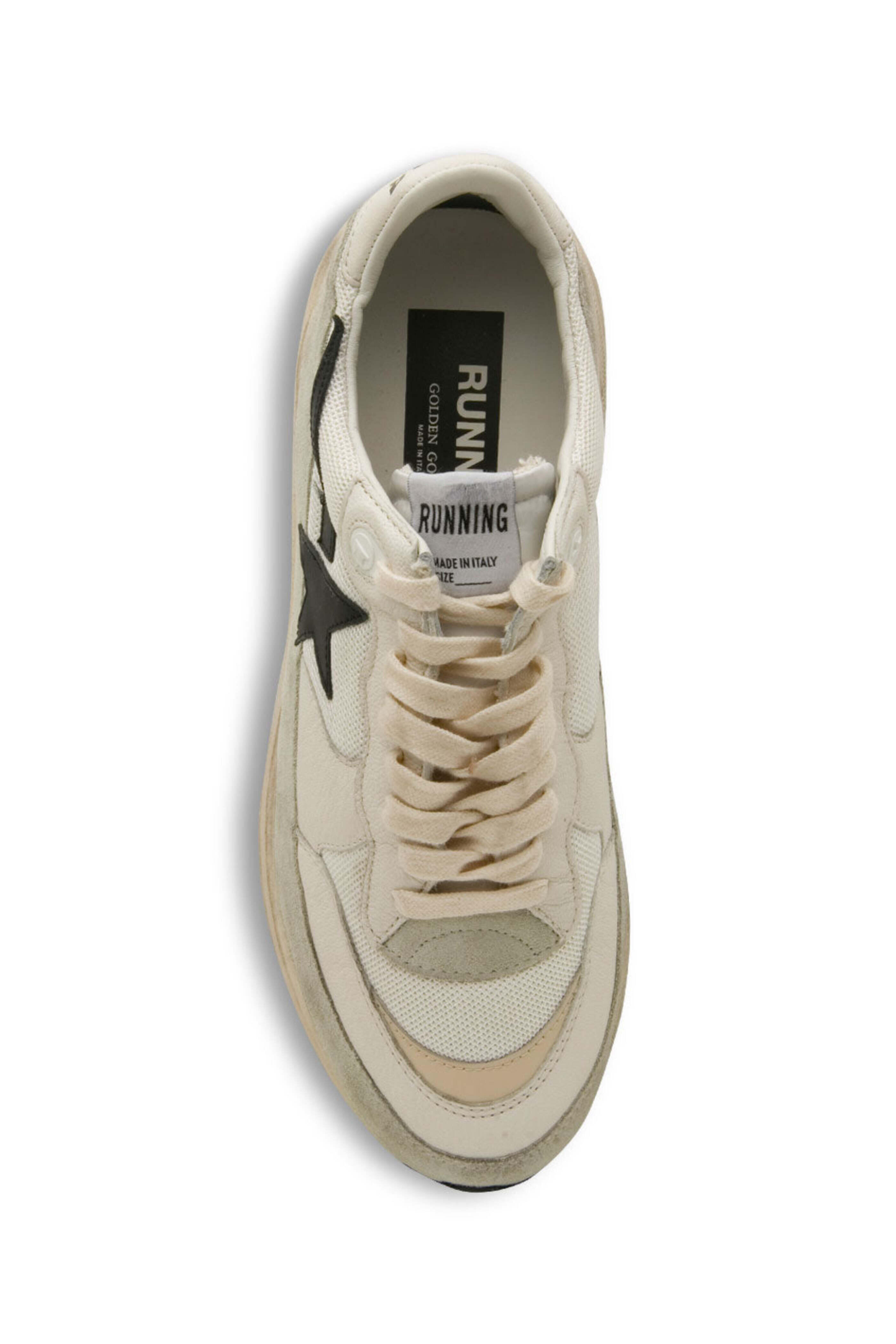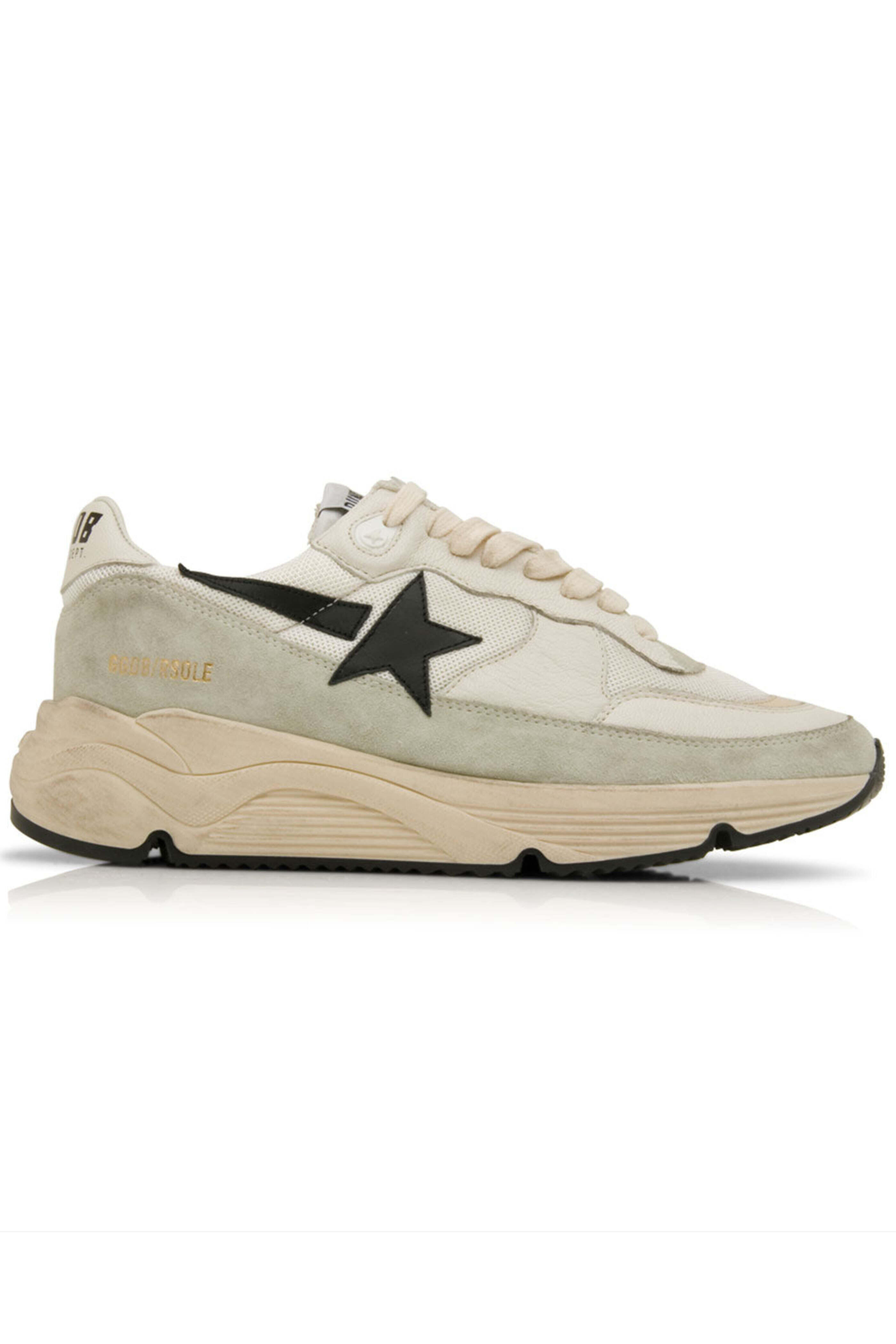 Golden Goose Running Sole Sneaker in White and Black. Reinforced round toe. Lace up front. Signature star detail. Mesh paneling . Cheetah print back tab. Signature aged rubber midsole . Leather lining and insole. Mesh, suede, and leather upper. Made in Italy.