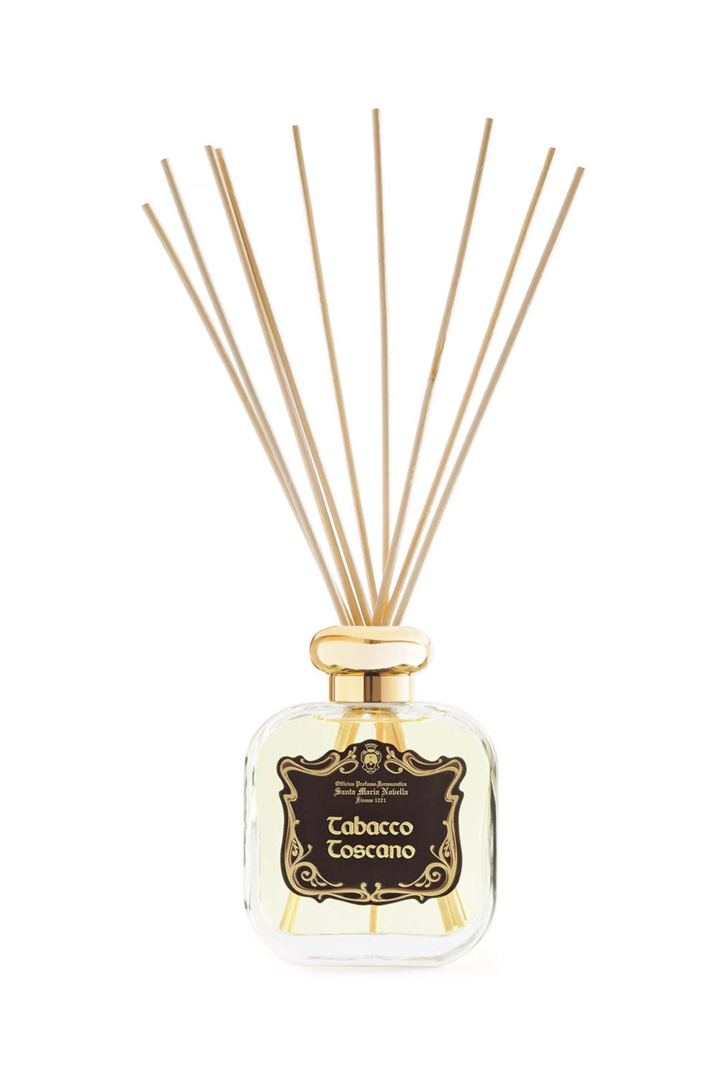 Santa Maria Novella Tabacco Toscano Diffuser. Tabacco Toscano ambient diffuser will complete any interior with the force of a gentle smokey vanilla note. From the Firenze 1221 Edition. Top notes: Bergamot, Tuscan tobacco leaves. Middle notes: Leather, Amber, Birchwood. Base notes: Cedarwood, Guaiacum, Sandalwood, Musk, Vanilla. 8.4 oz.. Made in Italy.