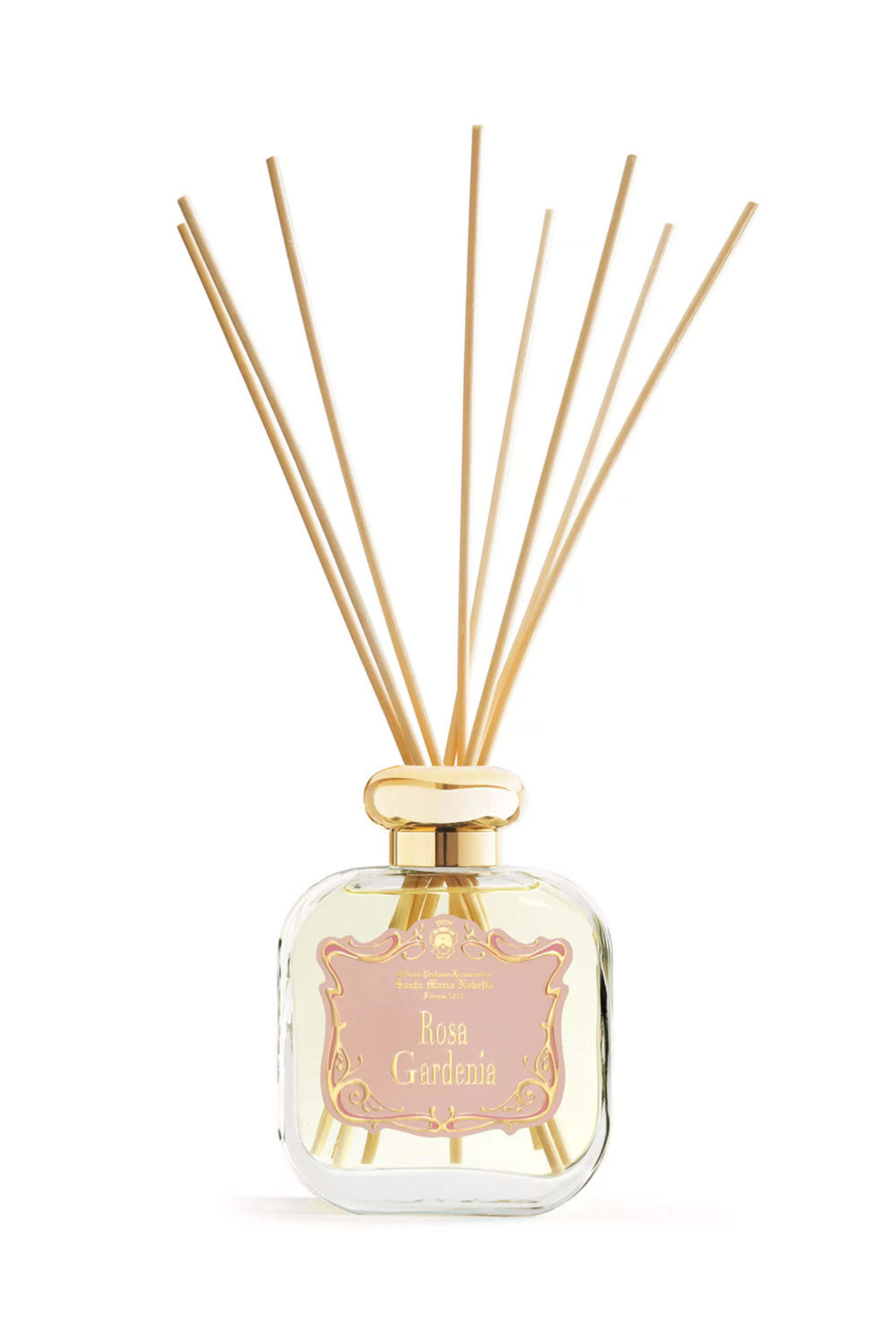 Santa Maria Novella Rose Gardenia Diffuser. From the Firenze 1221 Edition. Top notes: bergamot, almond blossom, orange blossom. Middle notes: gardenia, cabbage flower, fig flower, jasmine. Base notes: sandalwood, vanilla, musk. Golden cap crowns an iconic glass bottle with the SMN monogram on its back. 8.4 oz.. Made in Italy.