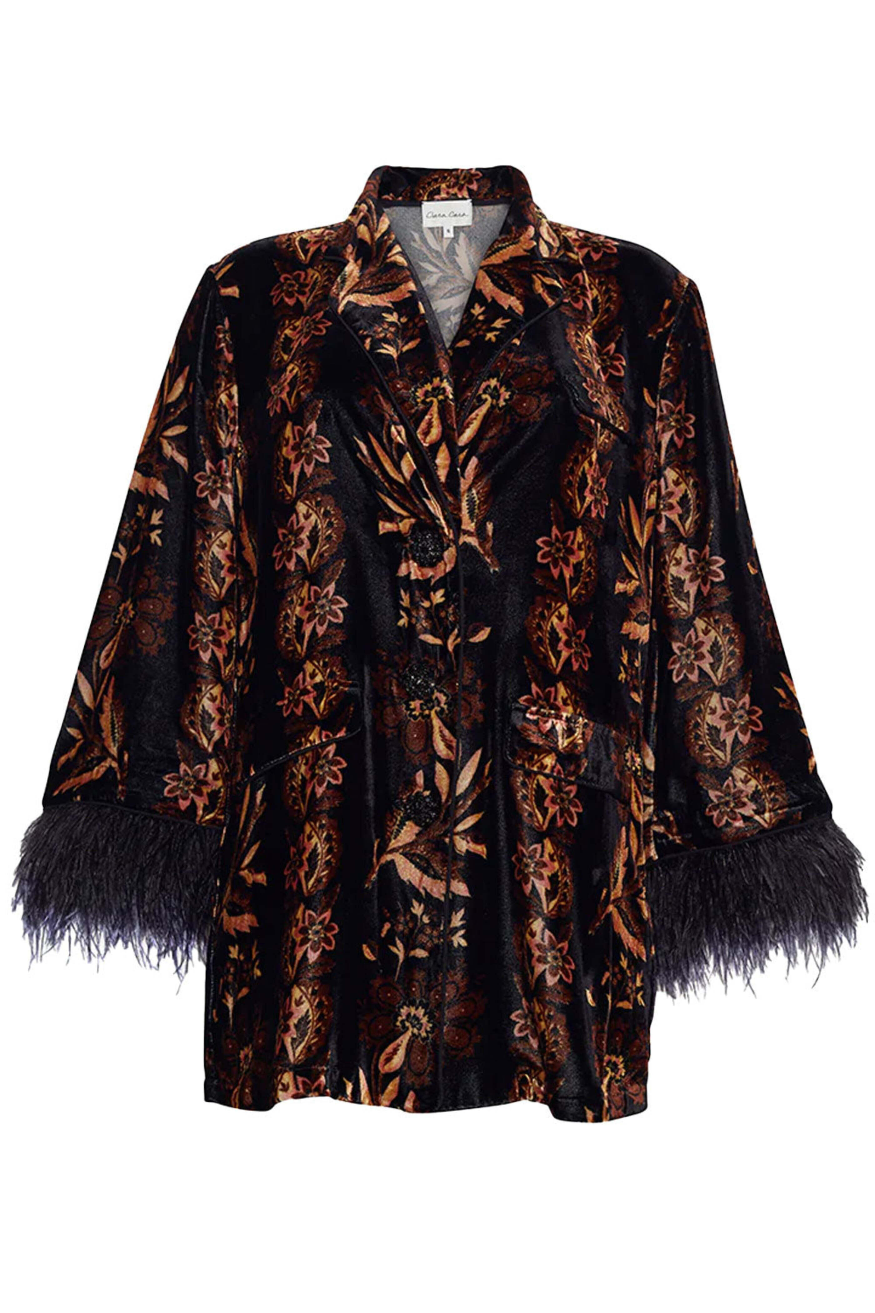Cara Cara Black Renaissance Venezia Jacket . Silk velvet . Feather embellishment . Snap closures with rhinestone shank detail . Made in China . 18% Silk 82% Rayon . Dry Clean Only or Hand Wash Cold .