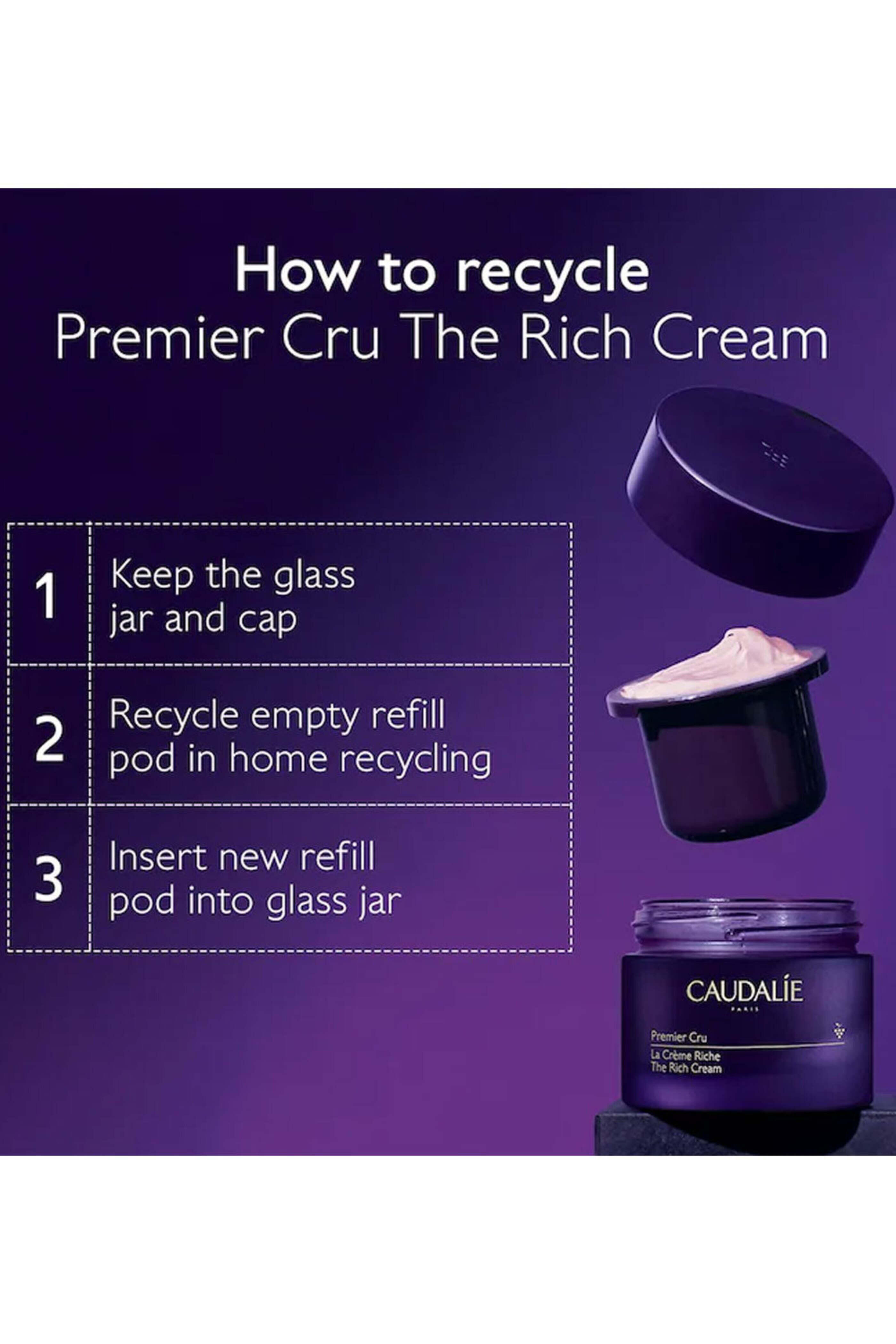 Caudalie Premier Cru The Rich Cream Refill. A rich moisturizer that visibly repairs skin barrier and reduces the look of wrinkles with TET8¢ Patent, bio-ceramides, and hyaluronic acid. For dark spots, fine lines, wrinkles, and redness. TET8¢ Patent: A revolutionary technology clinically shown to target all eight signs of aging. Bio-Ceramides & Shea Butter: Nourish and protect the skin's barrier. Micro Hyaluronic Acid: Replenishes moisture and hydrates for visibly plump skin. This product is vegan, gluten-free, cruelty-free, and comes in recyclable packaging. Peel the foil off of the pod and drop it into the glass jar. 1.6 oz / 50 mL. For normal, dry, and oily skin types. This luxurious, deeply nourishing moisturizer replenishes the dry skin's moisture barrier with bio-ceramides while targeting the eight signs of aging. Its clinically shown to visibly improve elasticity, firmness, wrinkles, dark spots, plumpness, hydration, and radiance with the breakthrough TET8¢ patent.
