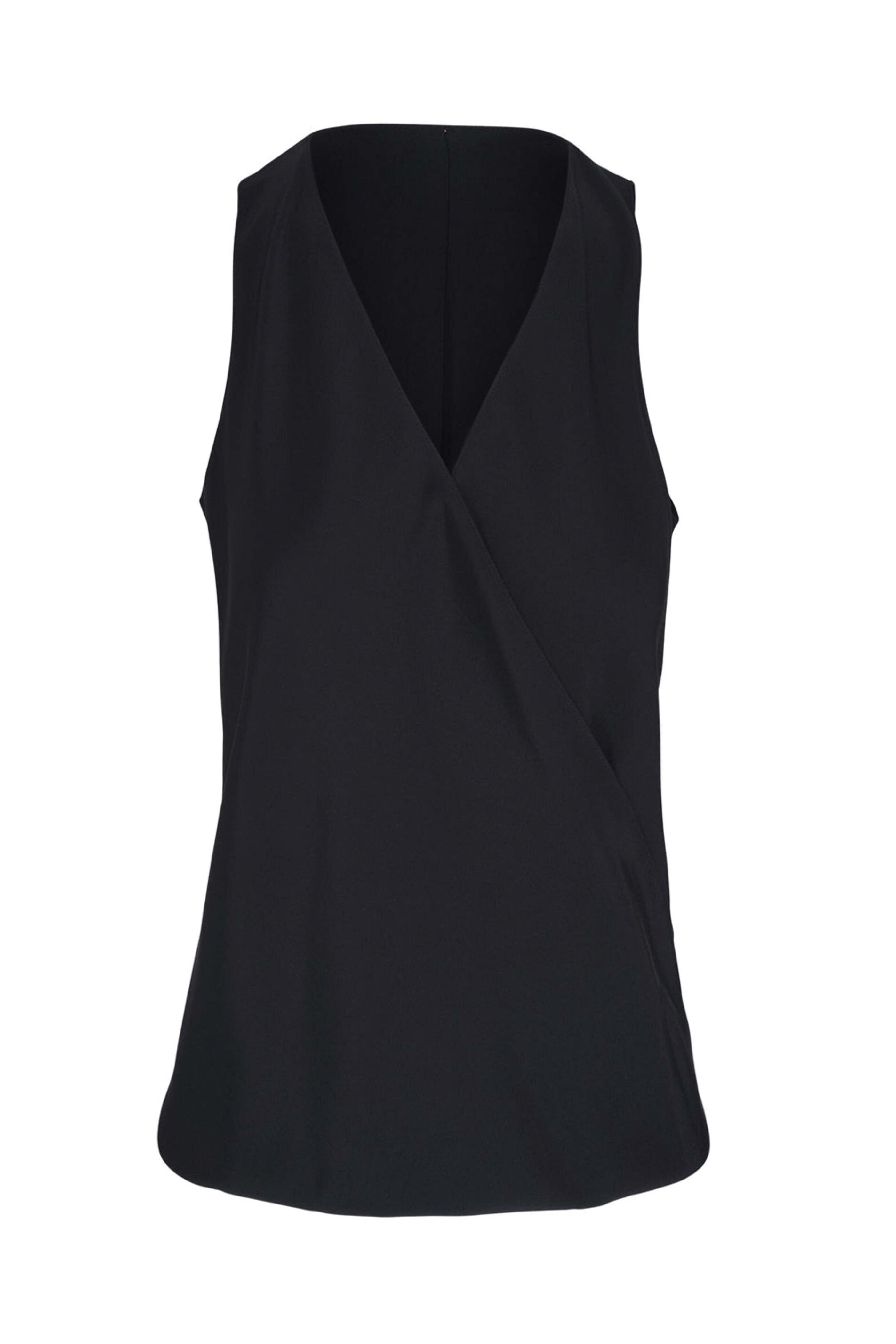 Peter Cohen Black Tide Top. V neck. Sleeveless. Faux wrap silhouette. Relaxed fit. Made in USA. 100% silk.