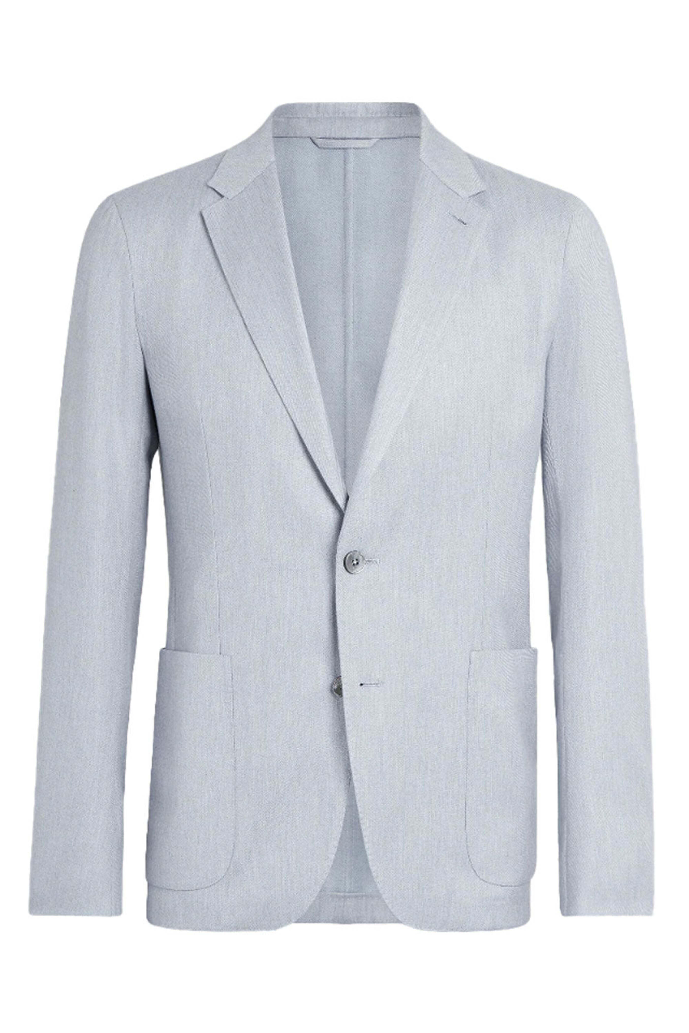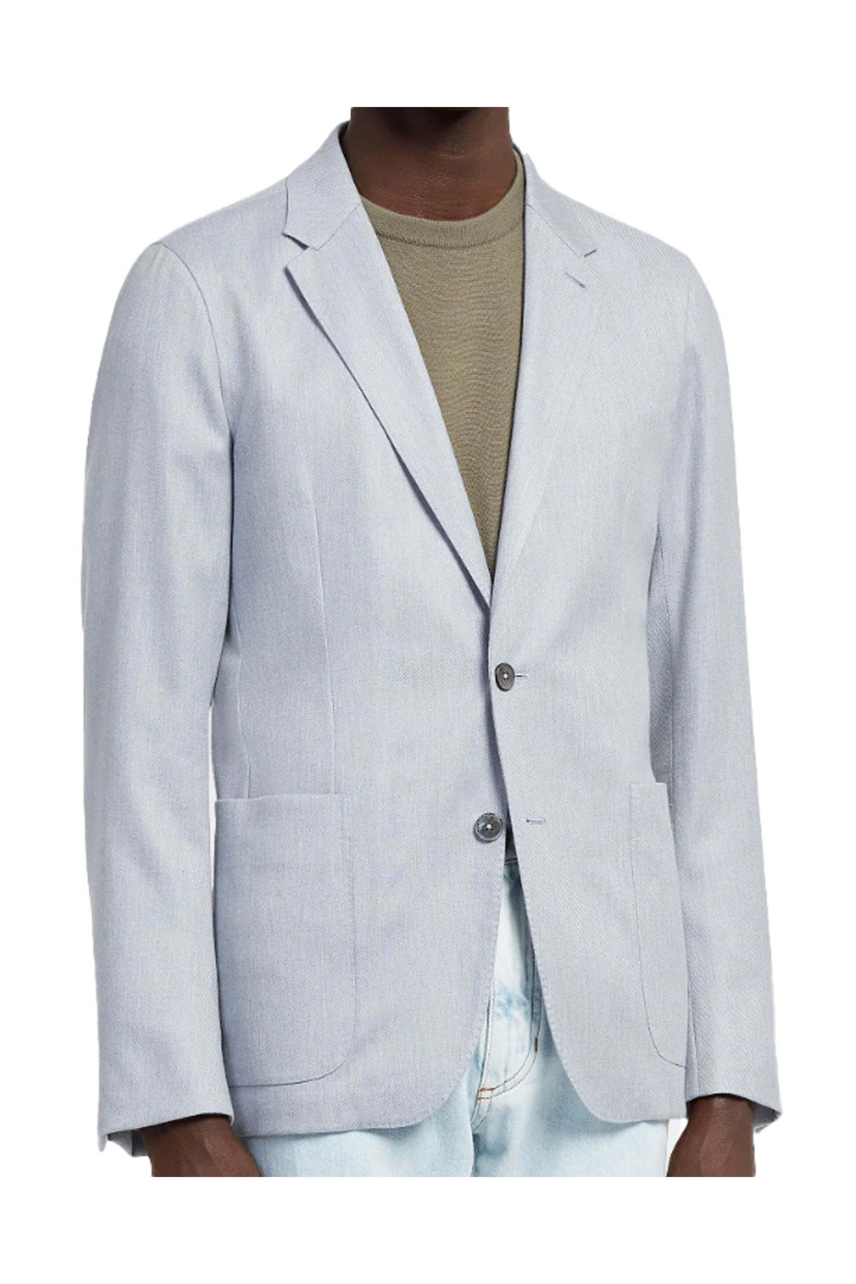 Zegna Light Blue Crossover Sportcoat. Notch lapels. Two button jacket. Front left chest pocket. Patch waist pockets. Double back vents. Drop: 7. Made in Italy. 47% cotton, 28% silk and 25% cashmere outer. 53% cotton and 47% cupro lining.