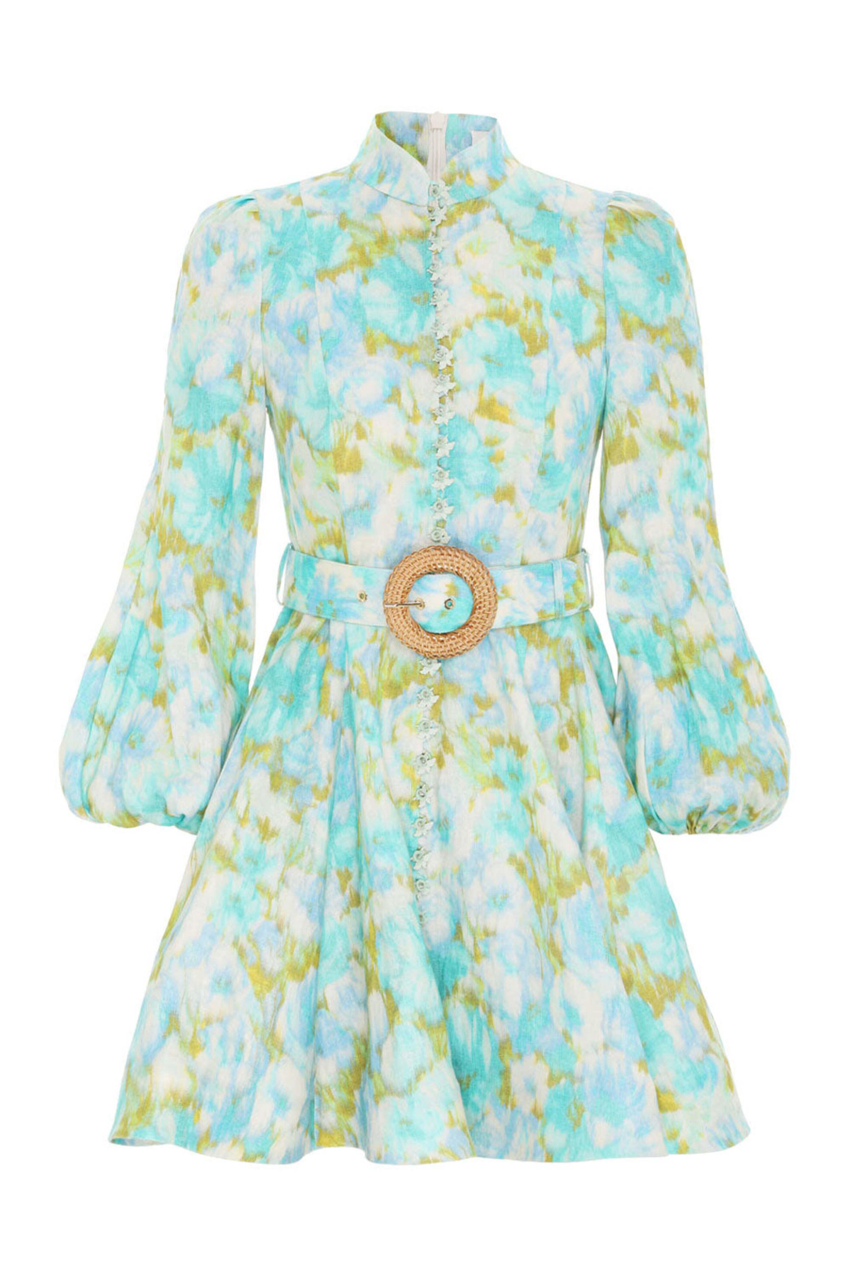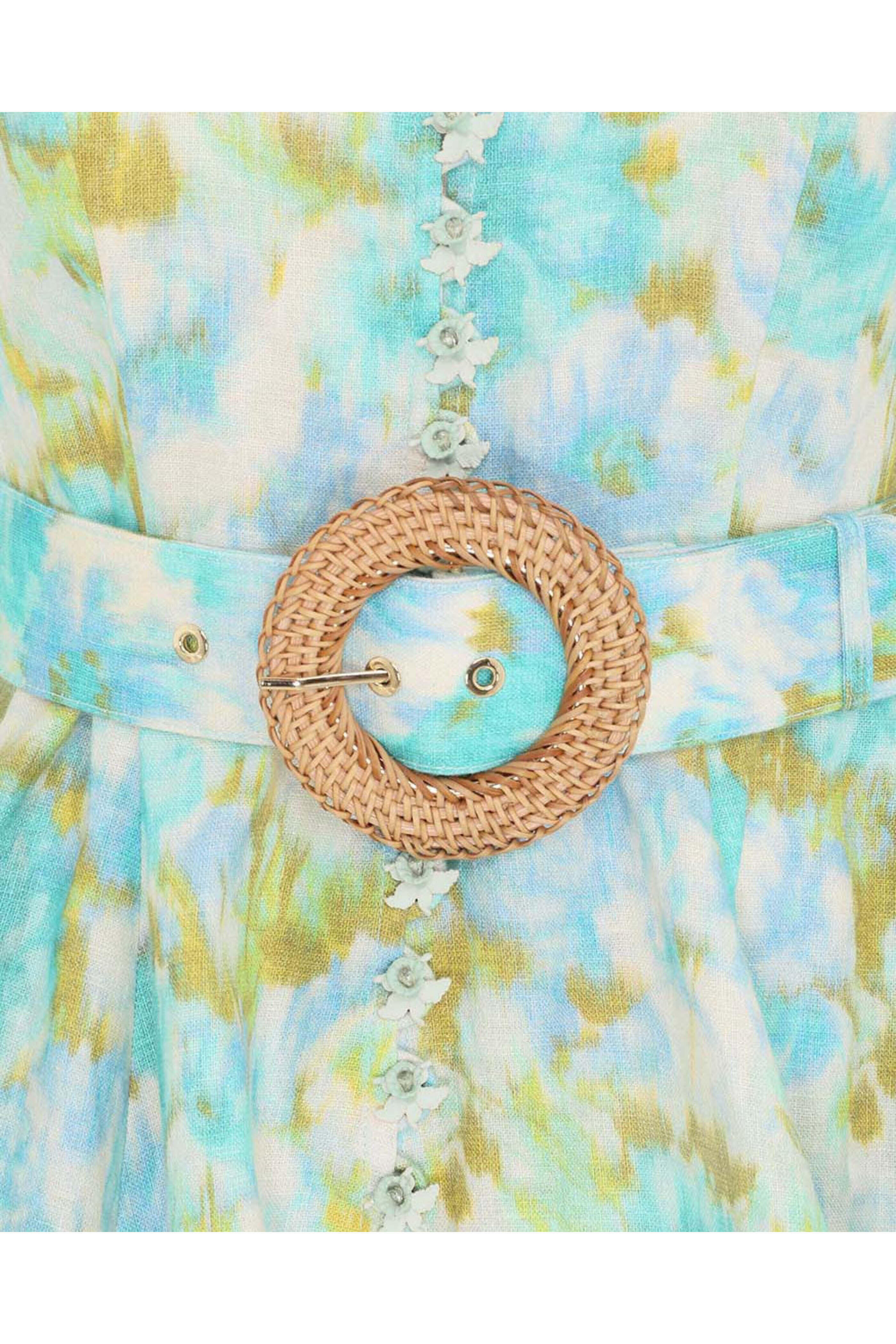 Zimmermann Aqua Ikat High Tide Belted Mini Dress. Mandarin collar. ¾ length blouson sleeves; elastic cuffs. Button down front closure; flower button detail. Removable buckle belt; raffia buckle fabrication. Fit and flare silhouette. Mini length. Linen fabrication. 100% linen.