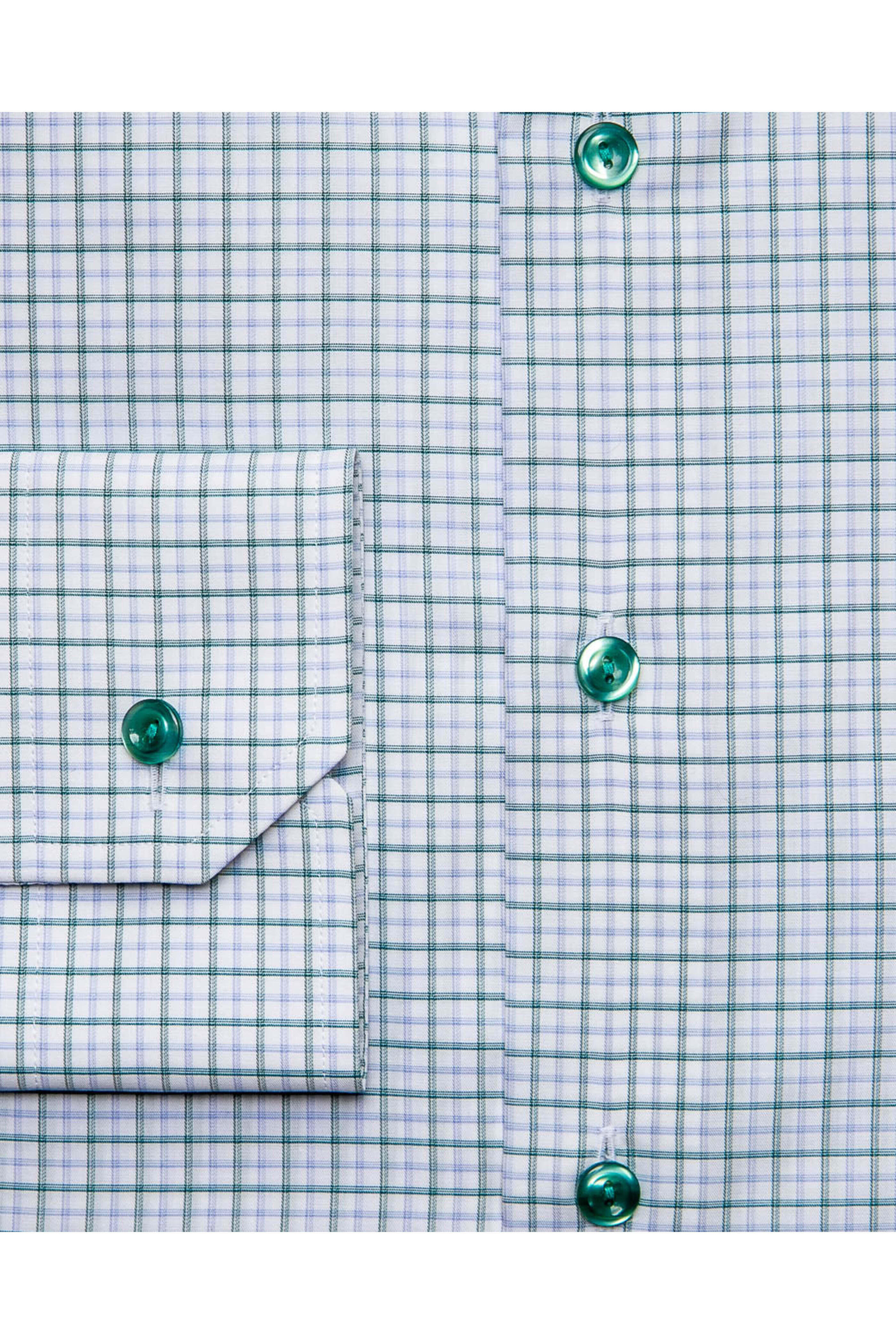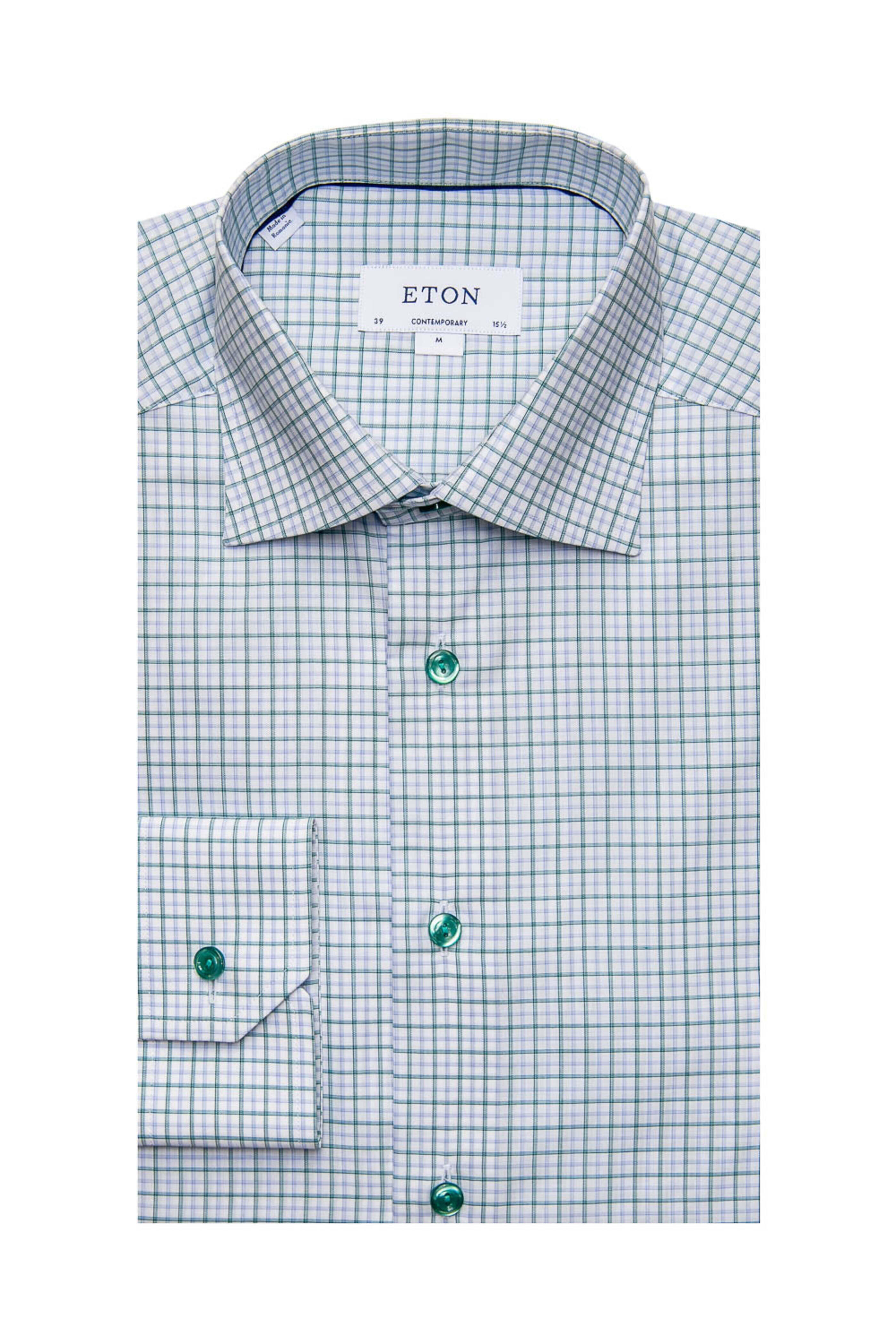 - Eton Forest Green and Sky Blue Check Dress Shirt Contemporary fit Point collar Mitered cut cuff Single button cuff 100% cotton Made in Europe