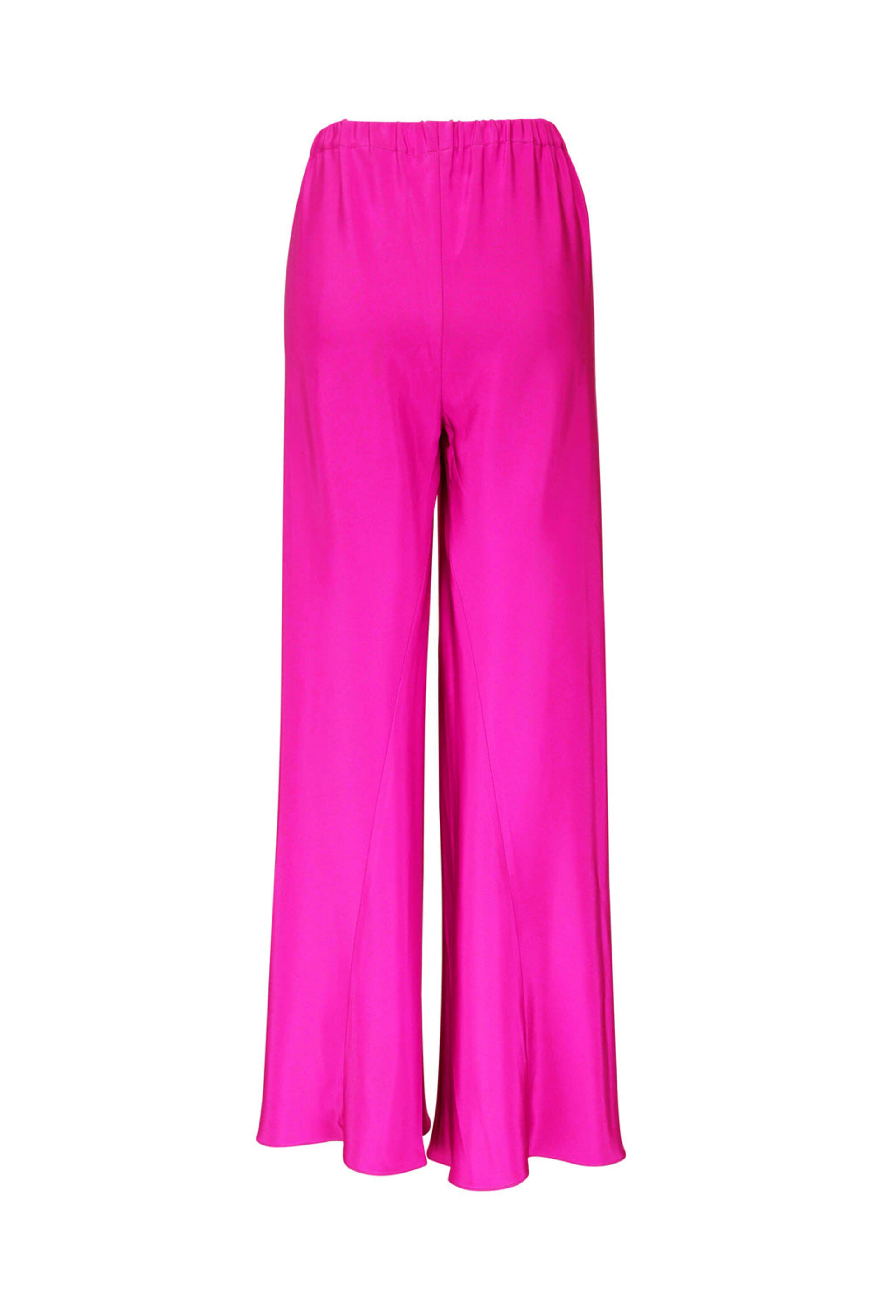 Peter Cohen Hot Pink Chute Pant. High rise. Flat front waist; elastic back waist. Wide through leg. Full length. Made in USA. 100% silk.