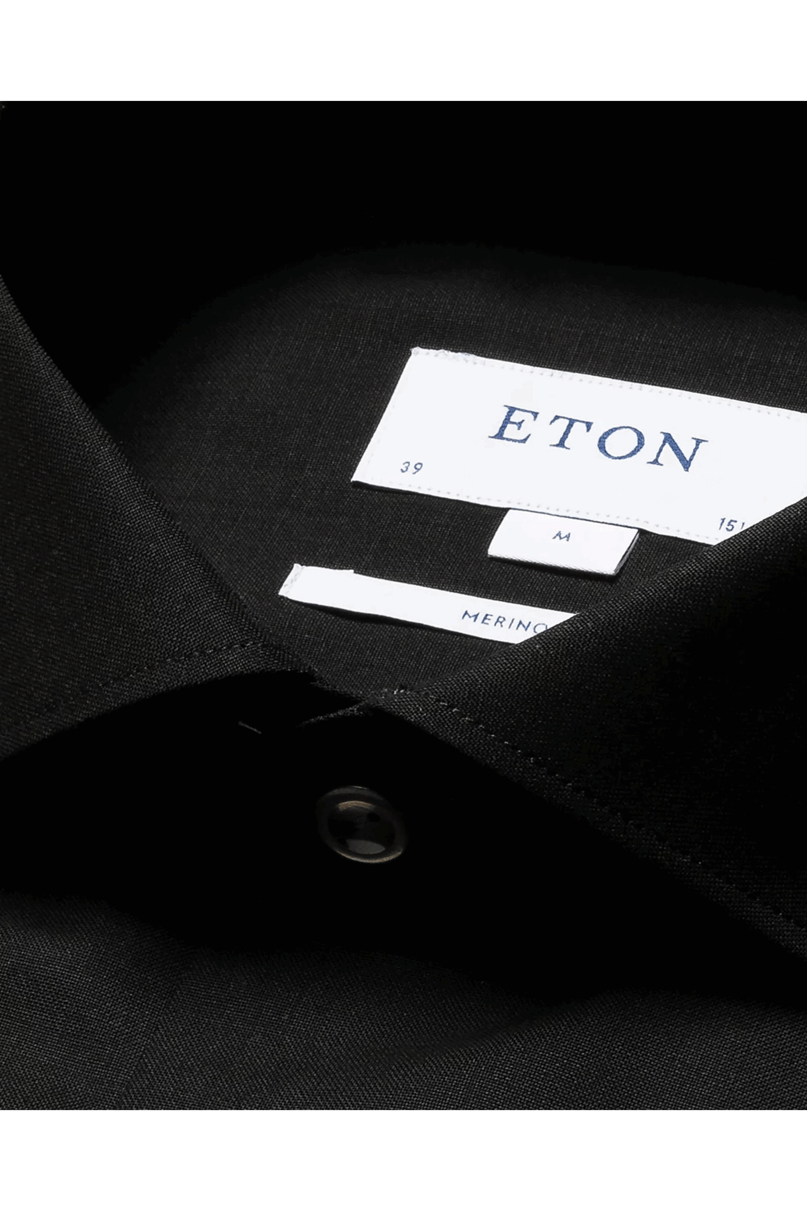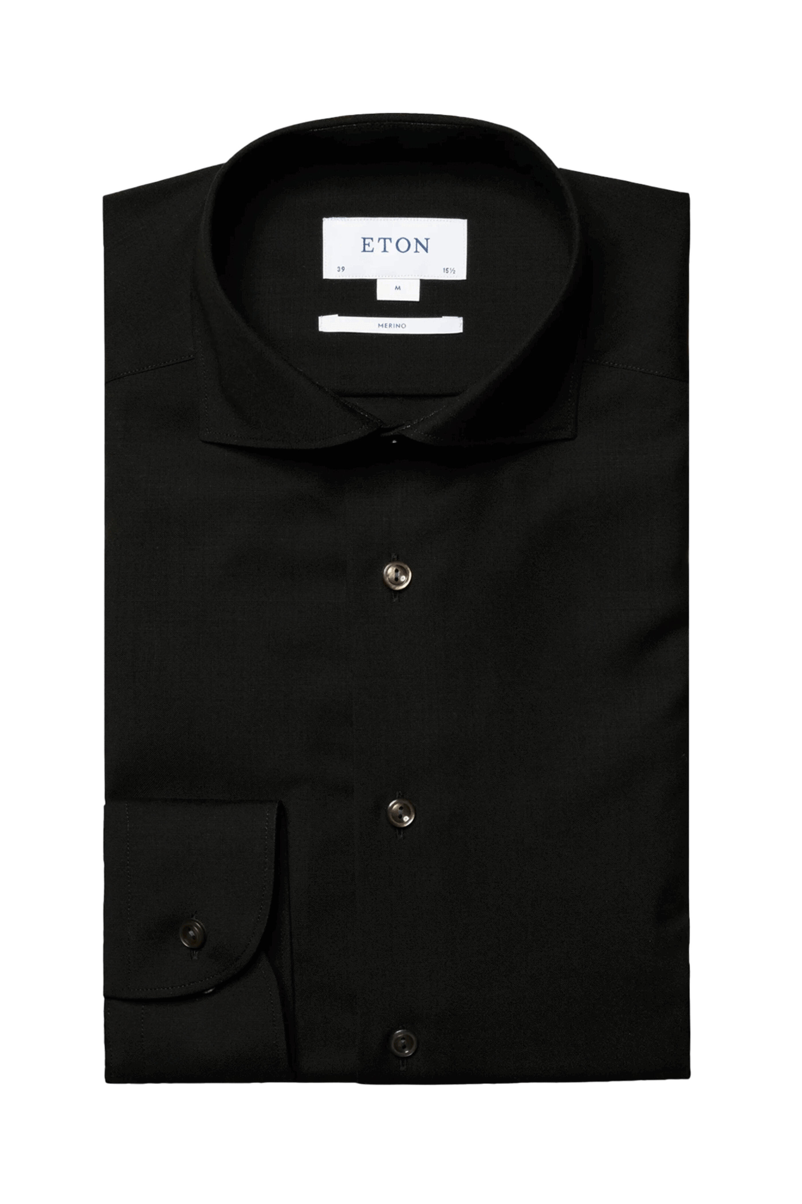 Eton Black Merino Wool Sportshirt. Spread collar. Button down front. Long sleeves. Single button mitered cuffs. Tonal Stitching. Made in Italy. 100% cotton.