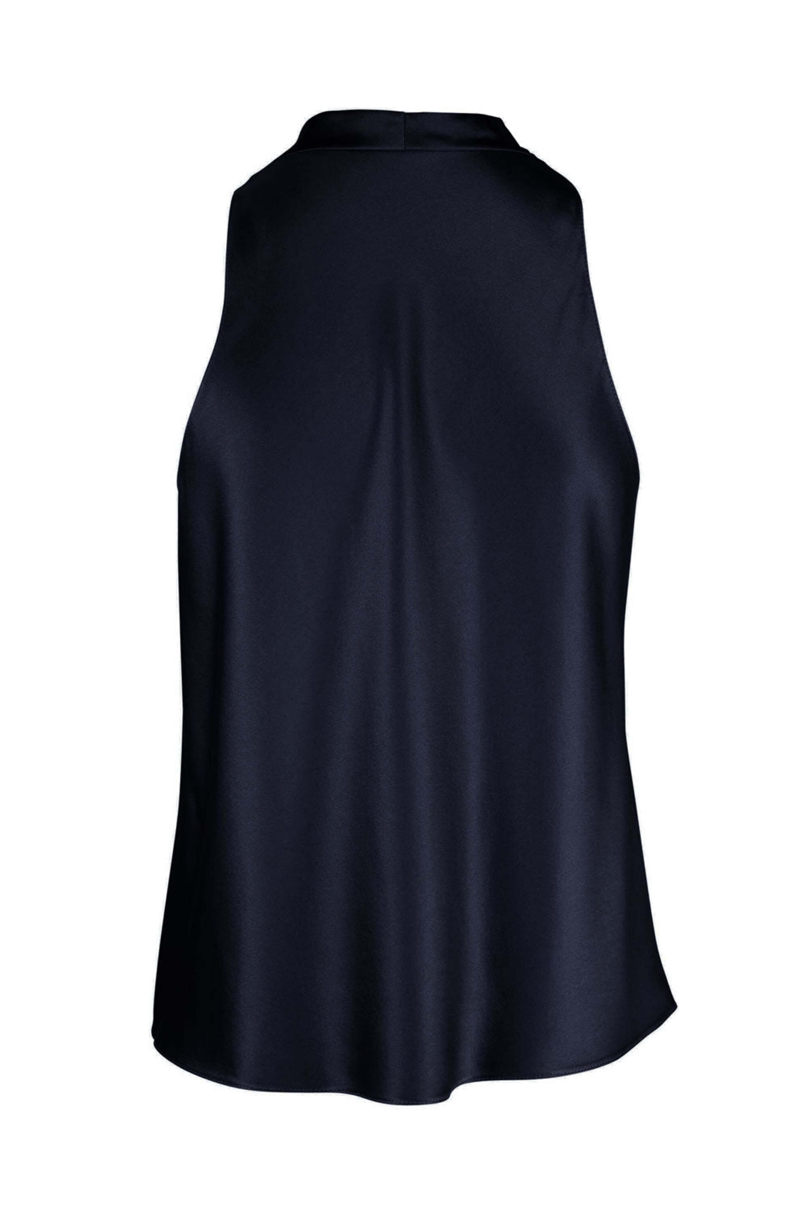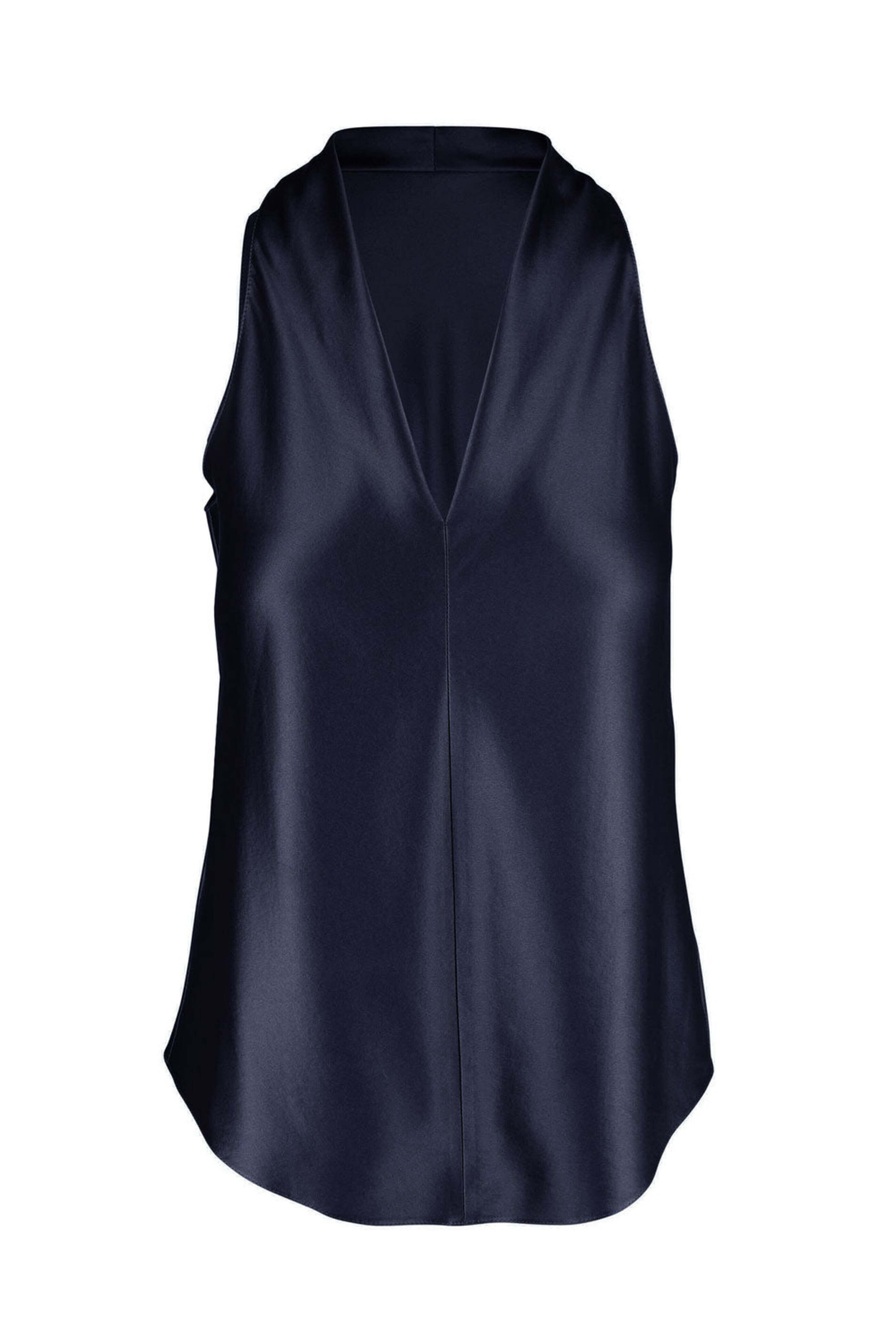 Peter Cohen Navy Tux Tank. V neck. Sleeveless. Relaxed fit. Rounded hem. Made in USA. 100% silk.