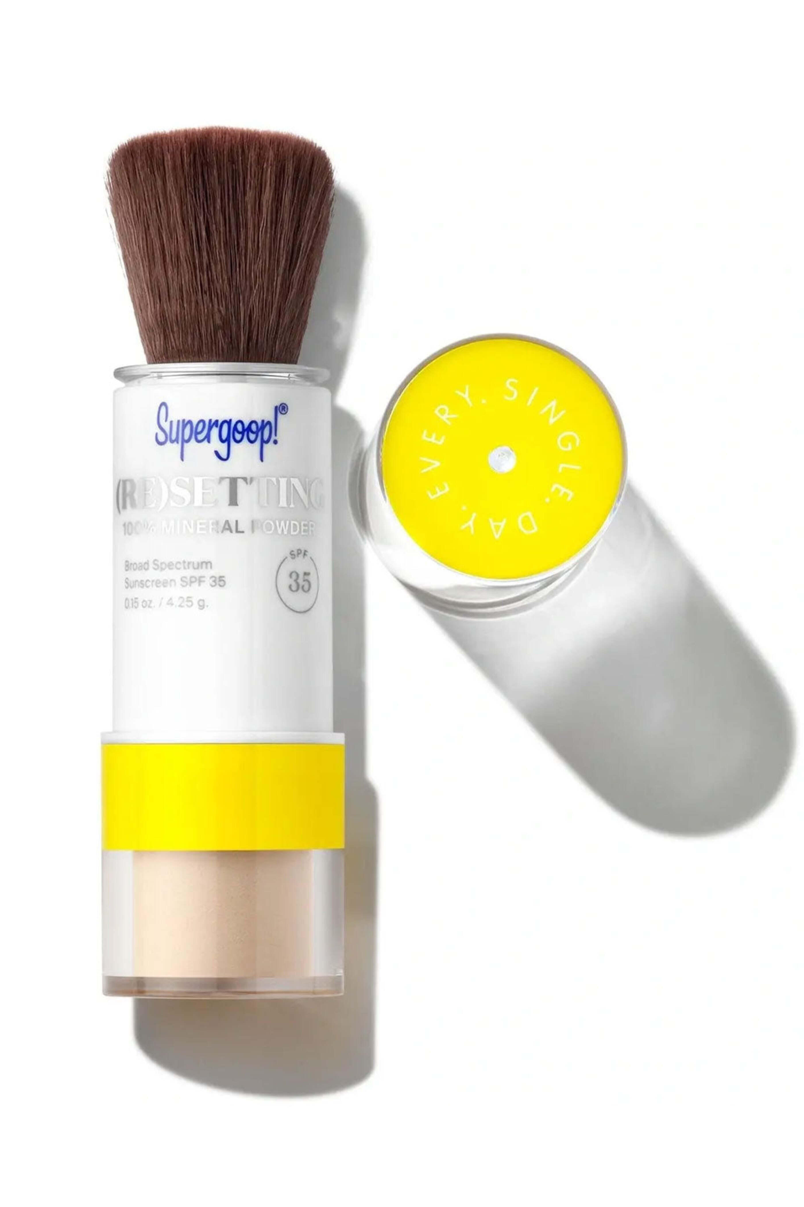 Non-nano setting powder with SPF 35 protection. Formula smooths skins appearance, reduces shine and protects with physical sunscreen. Brush on throughout the day to reapply SPF and control shine.. All skin types. Matte finish. 0.15 oz.. Supergoop! Translucent Resetting 100% Mineral Powder. Set your makeup and mattify skin with a swipe of this 100% mineral. 100% mineral.