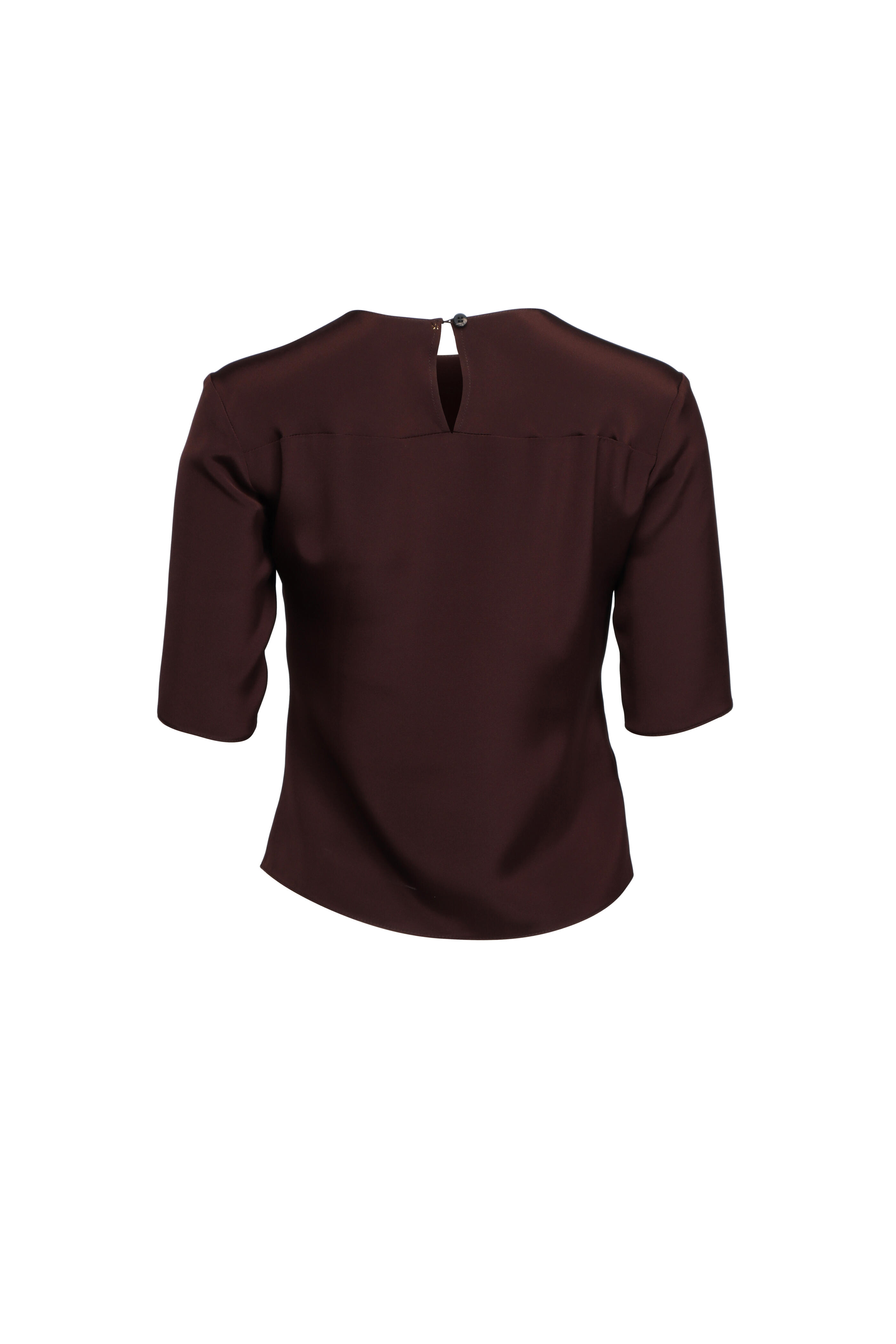 Elbow length sleeves. Back button closure. Keyhole detail. Made in USA. 100% silk. Dry clean.