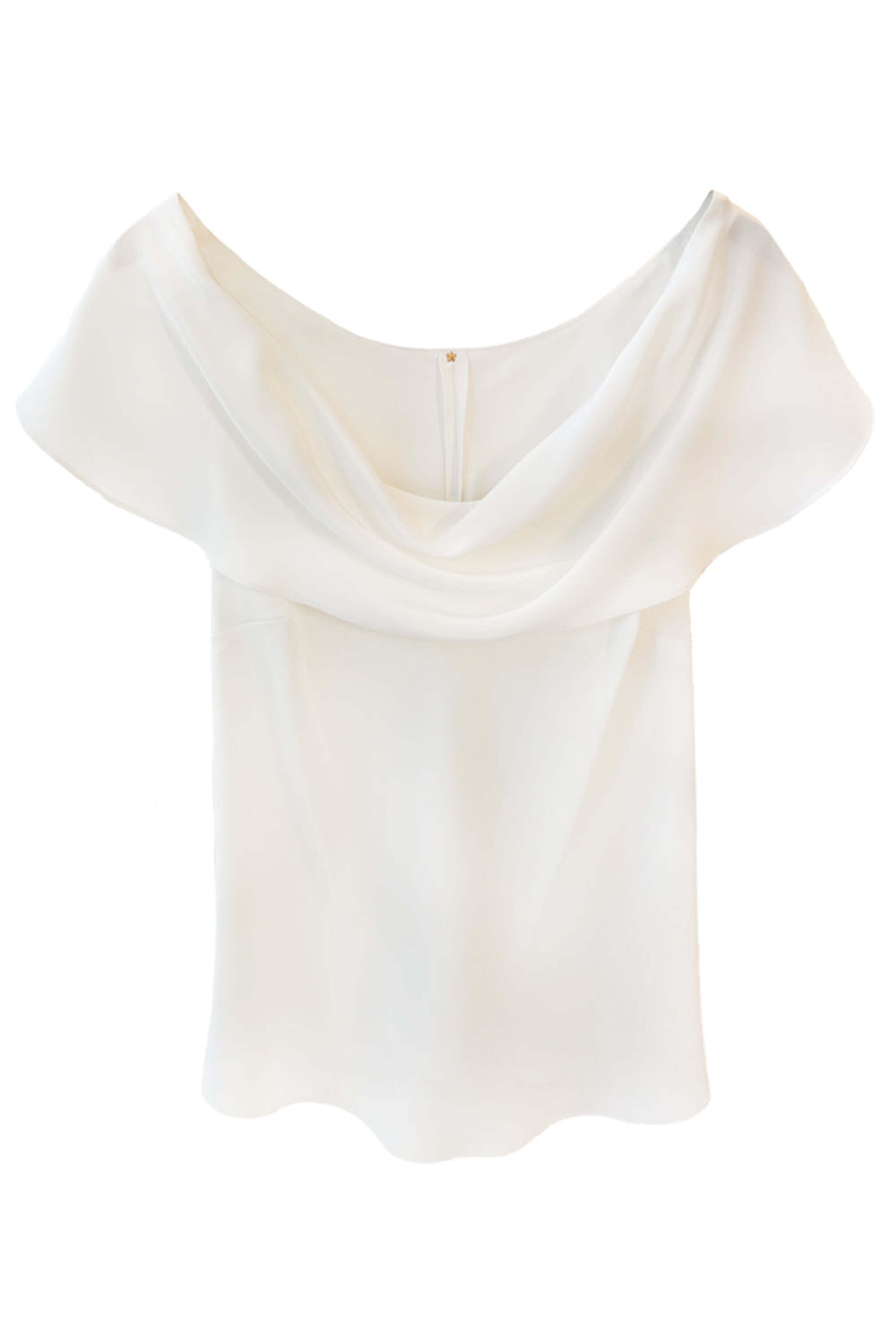 Peter Cohen White Silk Gigi Top. Scoop neck. Gathered short sleeve ruffle. Relaxed fit. 100% silk.