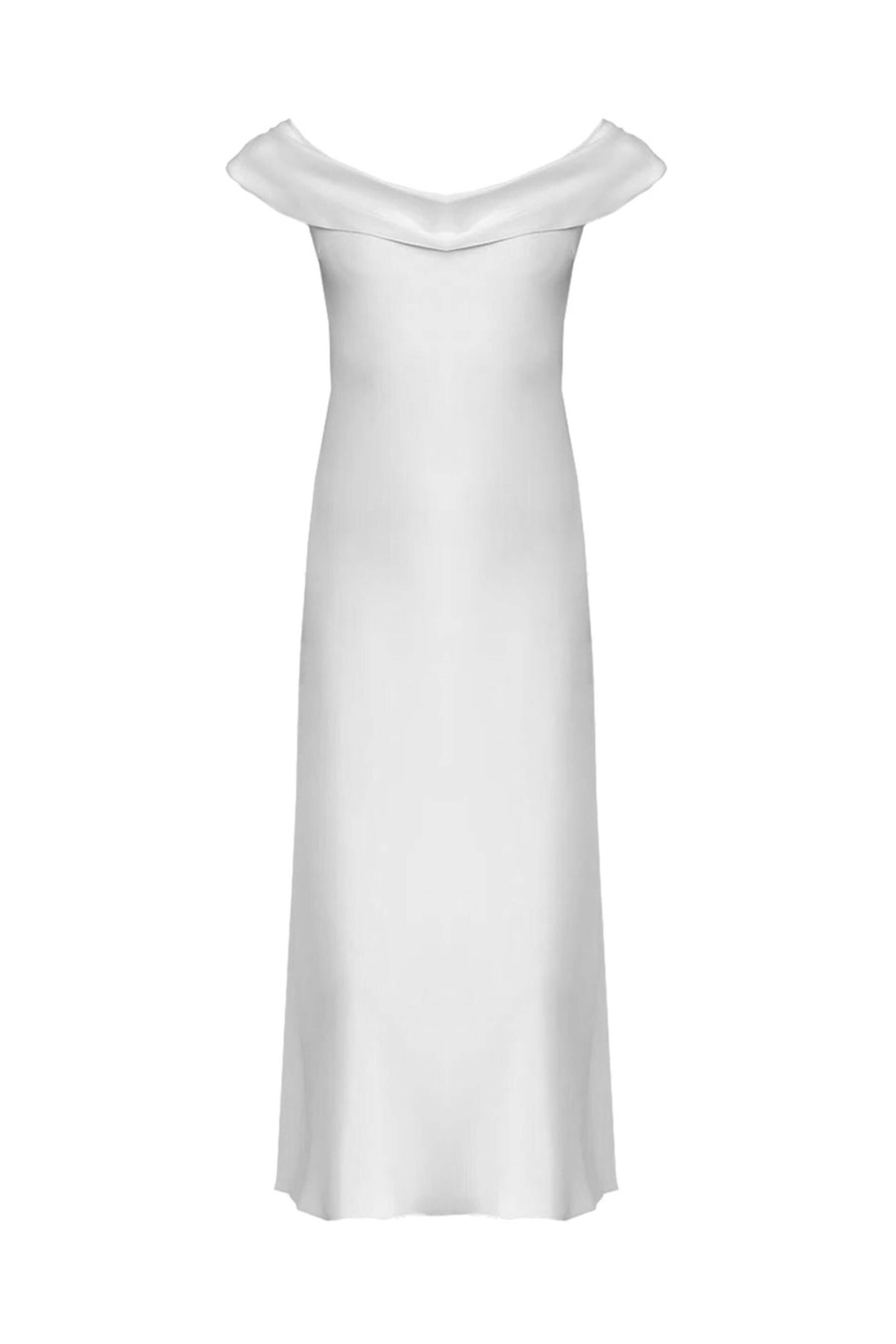 Peter Cohen White Gig Dress. Off the shoulder neckline. Gathered shoulder detail. Slim silhouette. Concealed zip closure. Flare hem. Midi length. Made in USA. 70% triacetate, 30% polyester.