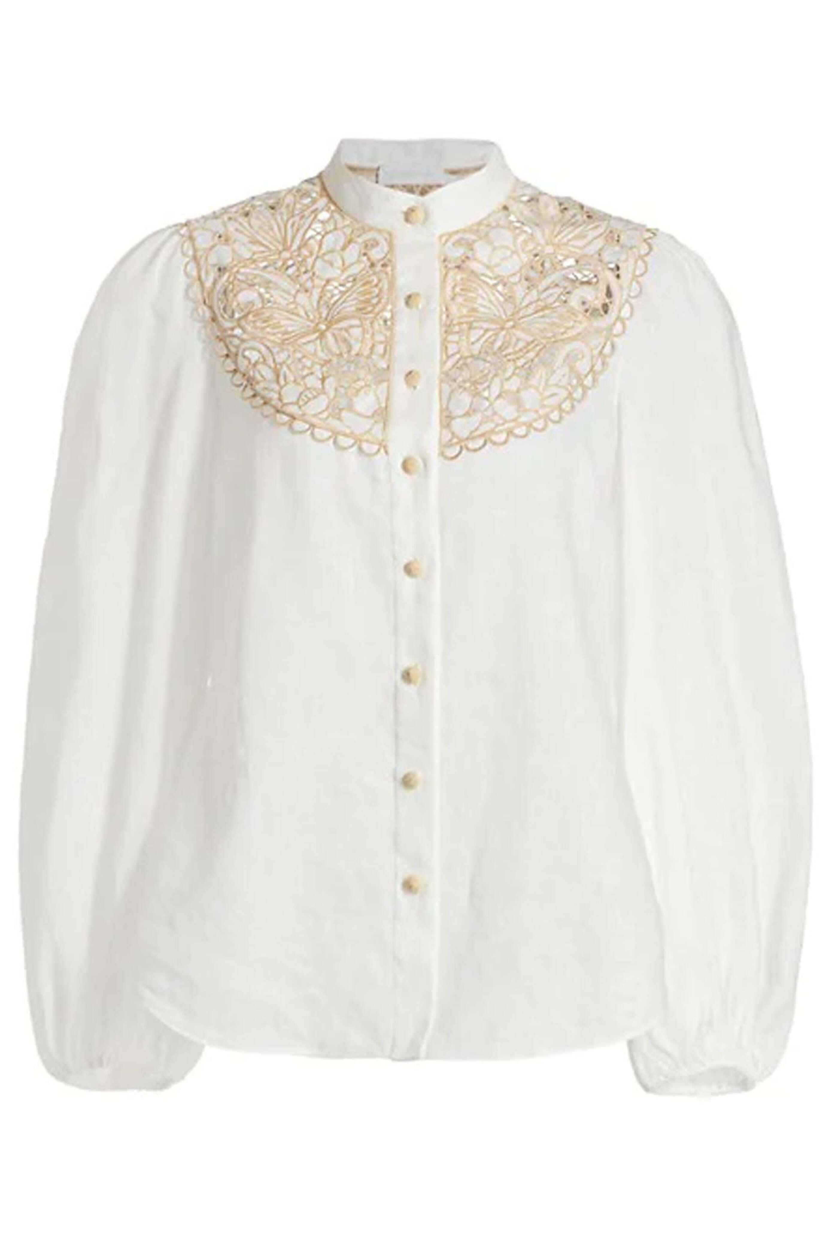 Zimmermann Ivory Butterfly Yoke Blouse. Banded collar. Long puff sleeves; elastic cuffs. Embroidered front and back yoke. Button down front closure. Relaxed fit. 100% linen outer, 100% polyester embroidery.