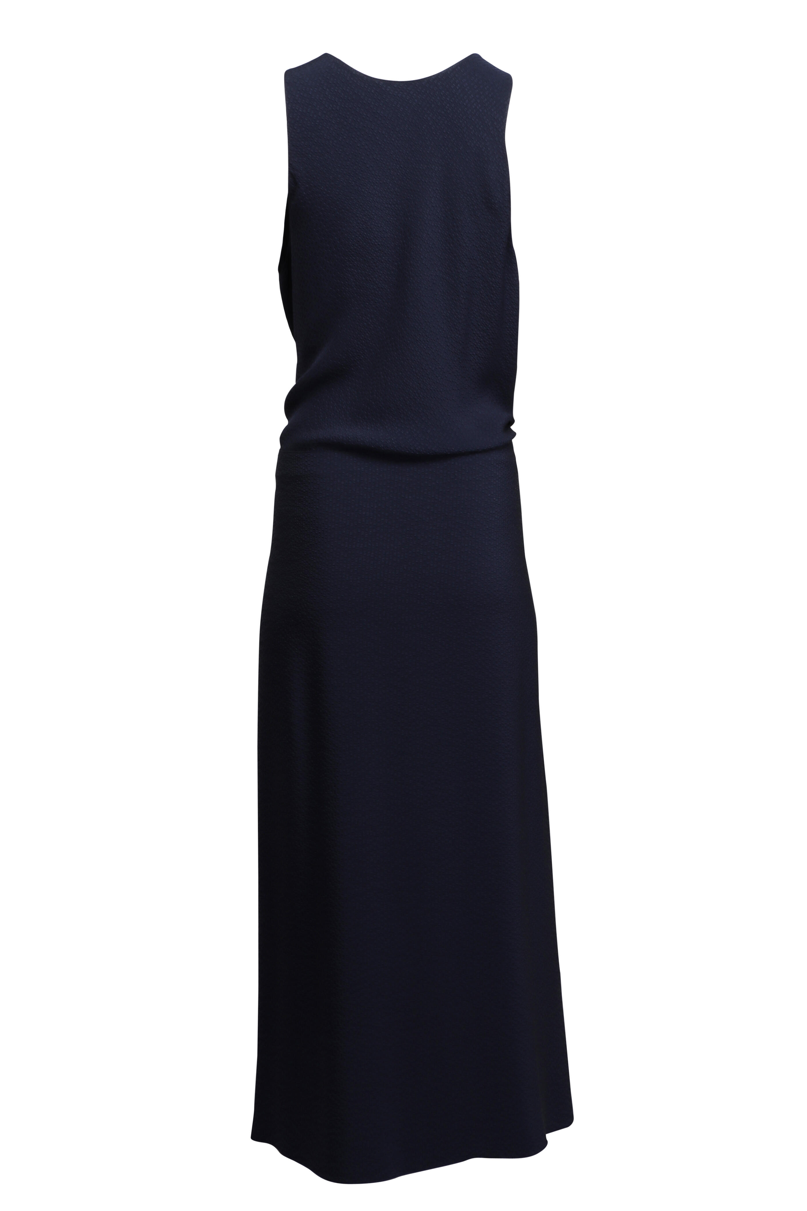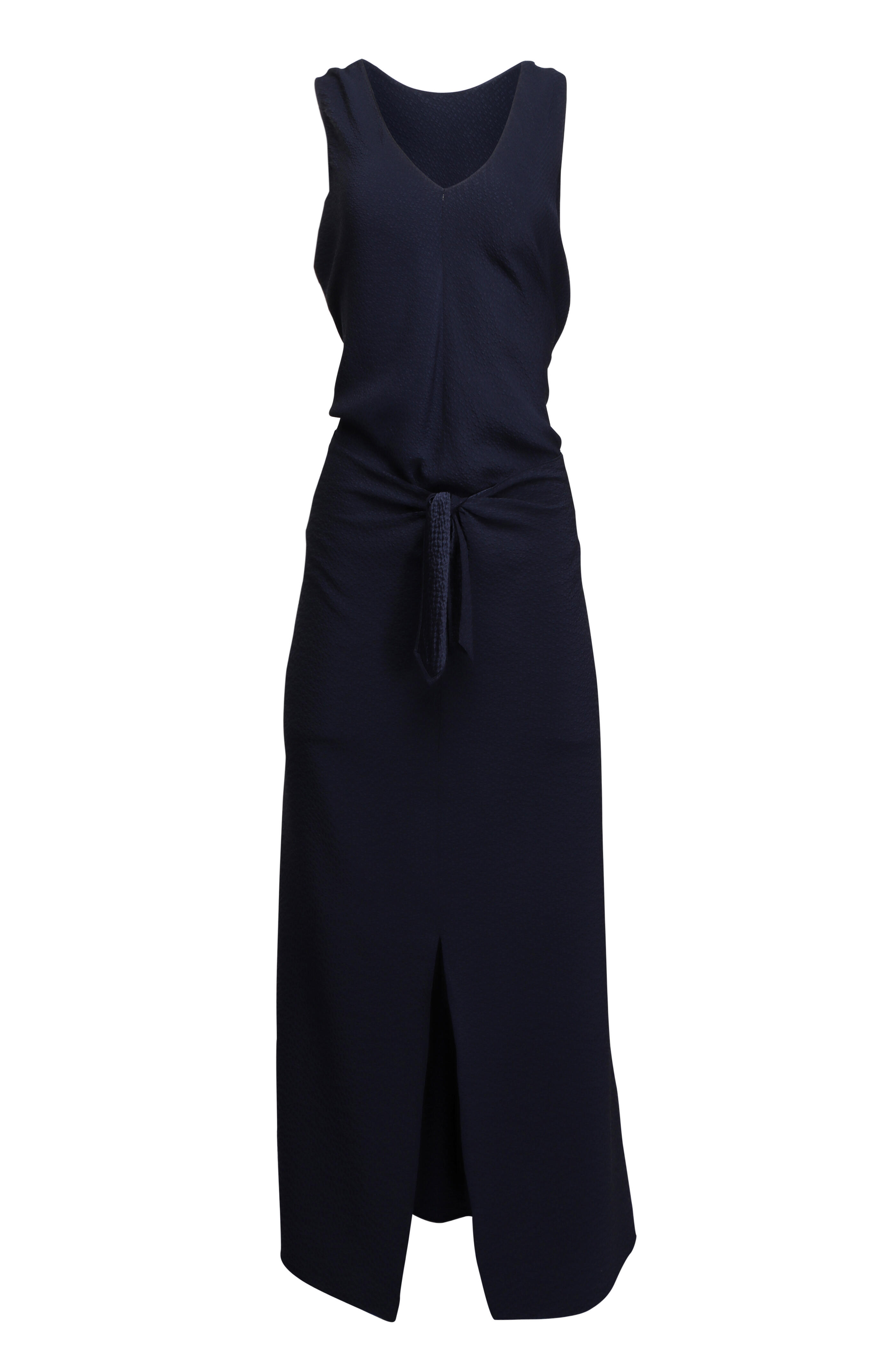 Chap Navy Blue Tie Front Hammered Silk Dress