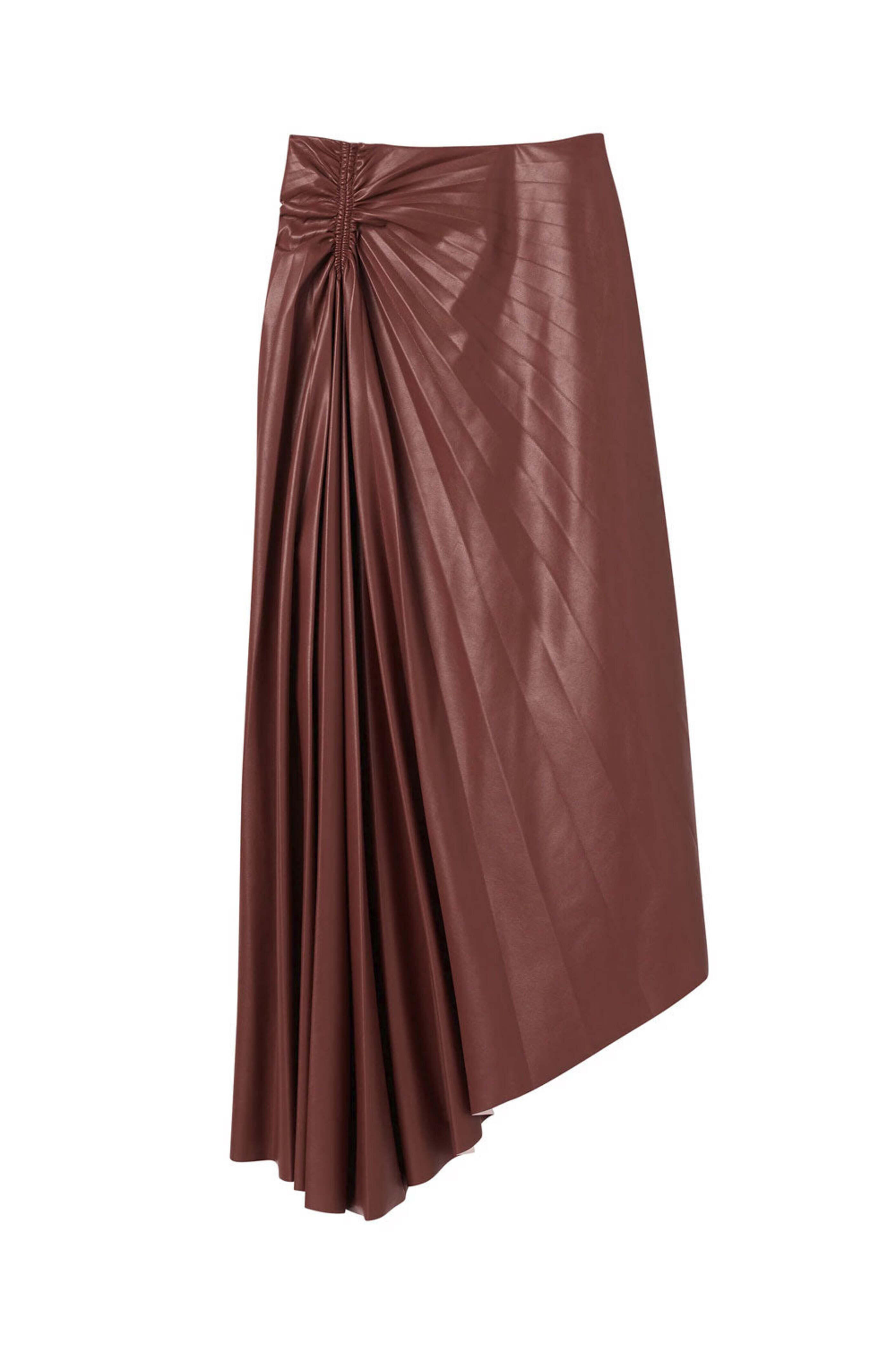 A.L.C. Caffe Tracy Vegan Leather Skirt. Mid rise. Concealed side zip closure. Side ruching detail. Midi to maxi length; asymmetric hem. A line silhouette. Slim fit. Vegan leather fabrication. 95% Viscose, 5% Elastane.