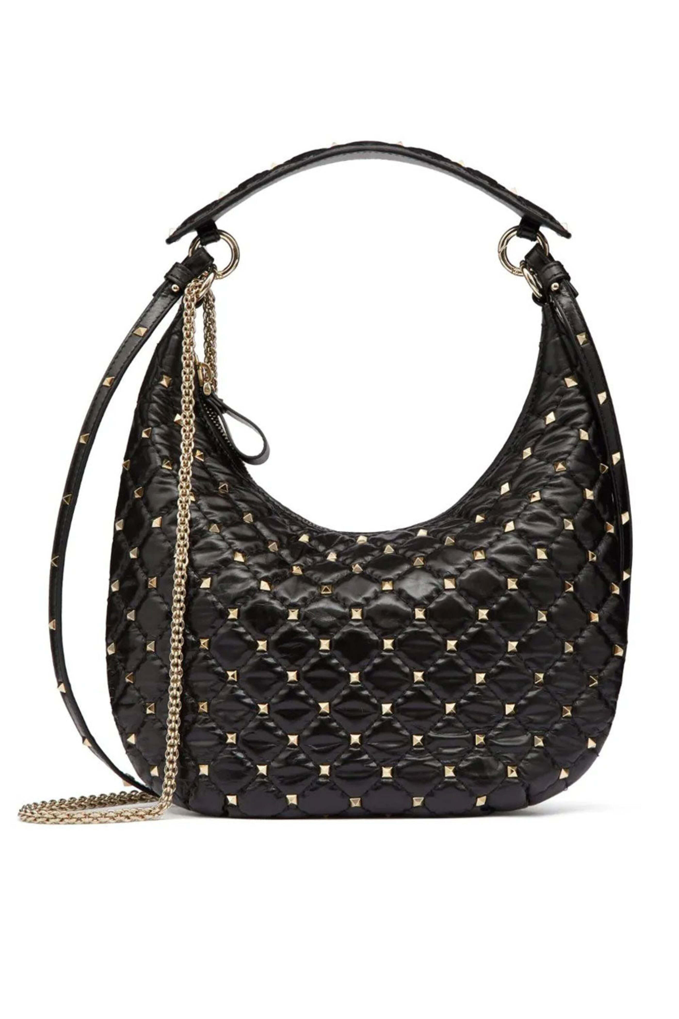 Valentino Small Hobo Rockstud Spike Bag in Nero. Zip closure. Single detachable top handle. Detachable sliding chain link shoulder strap. Gold-tone rockstud detailing. Diamond quilting. Gold hardware. Main compartment. Internal card slot. Internal logo stamp. Leather outer and lining. 43.5" chain drop. 37.5" strap drop. 10" handle drop. 11.5"W x 10.5"H x 1"D. Made in Italy.