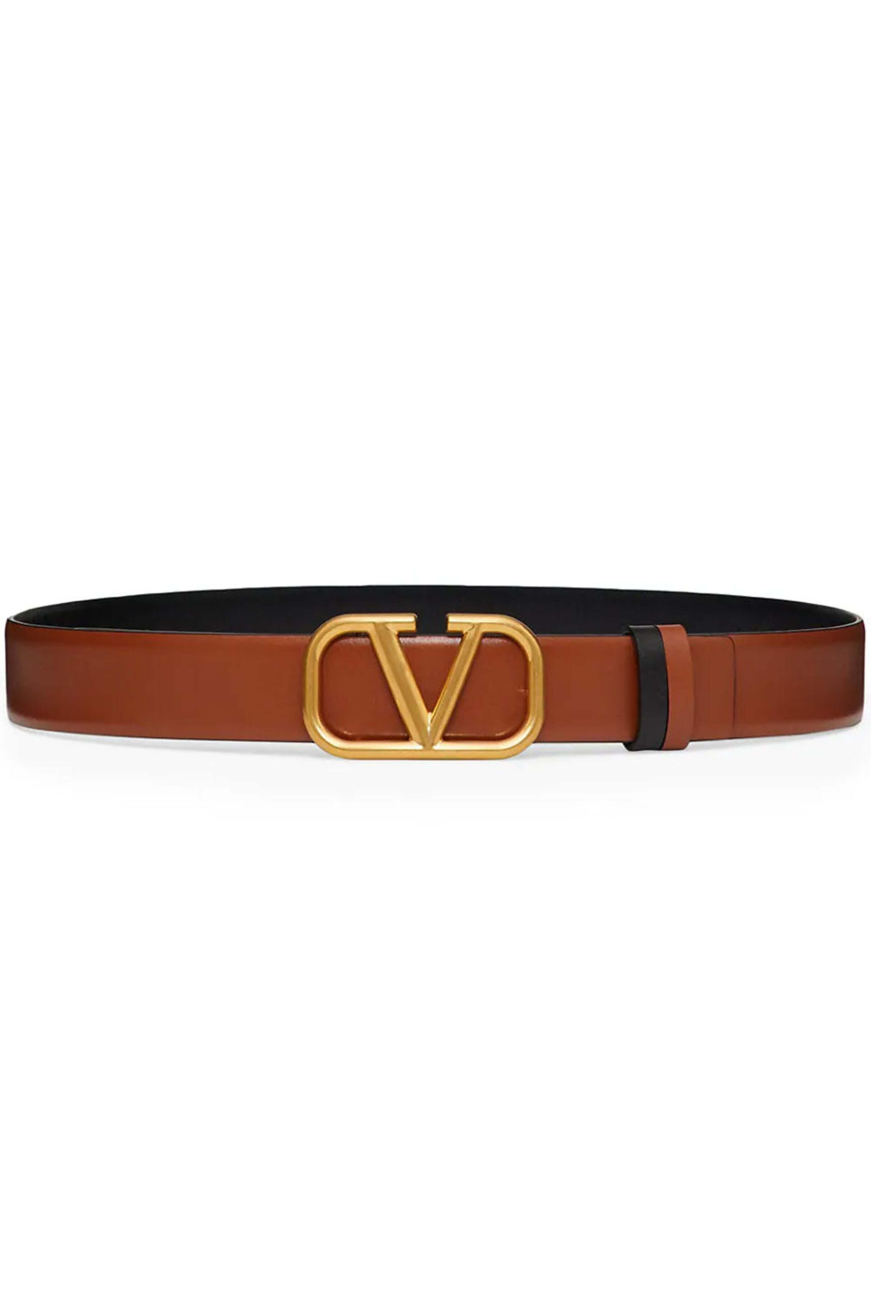 Valentino Garavani V-Logo Reversible Belt in Brown and Black. Adjustable buckle. Gold tone hardware. Reversible. Calfskin leather. 1.25 W. Made in Italy.