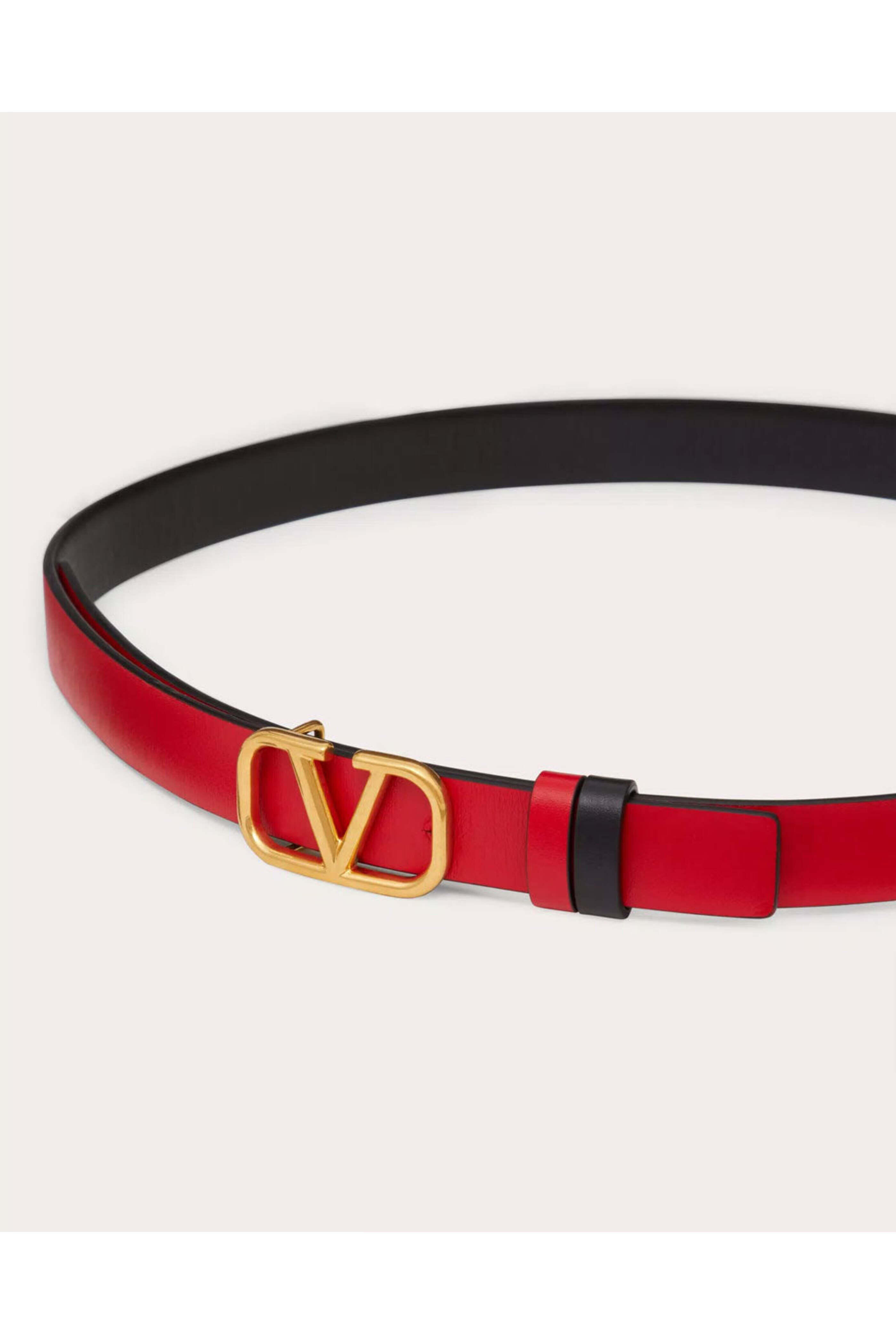 Valentino Vlogo Reversible Belt in Red and Black 20mm. Adjustable reversible belt. Two loop keepers. Vlogo buckle. Antique brass finish hardware. Calfskin leather. .8 width. Made in Italy.