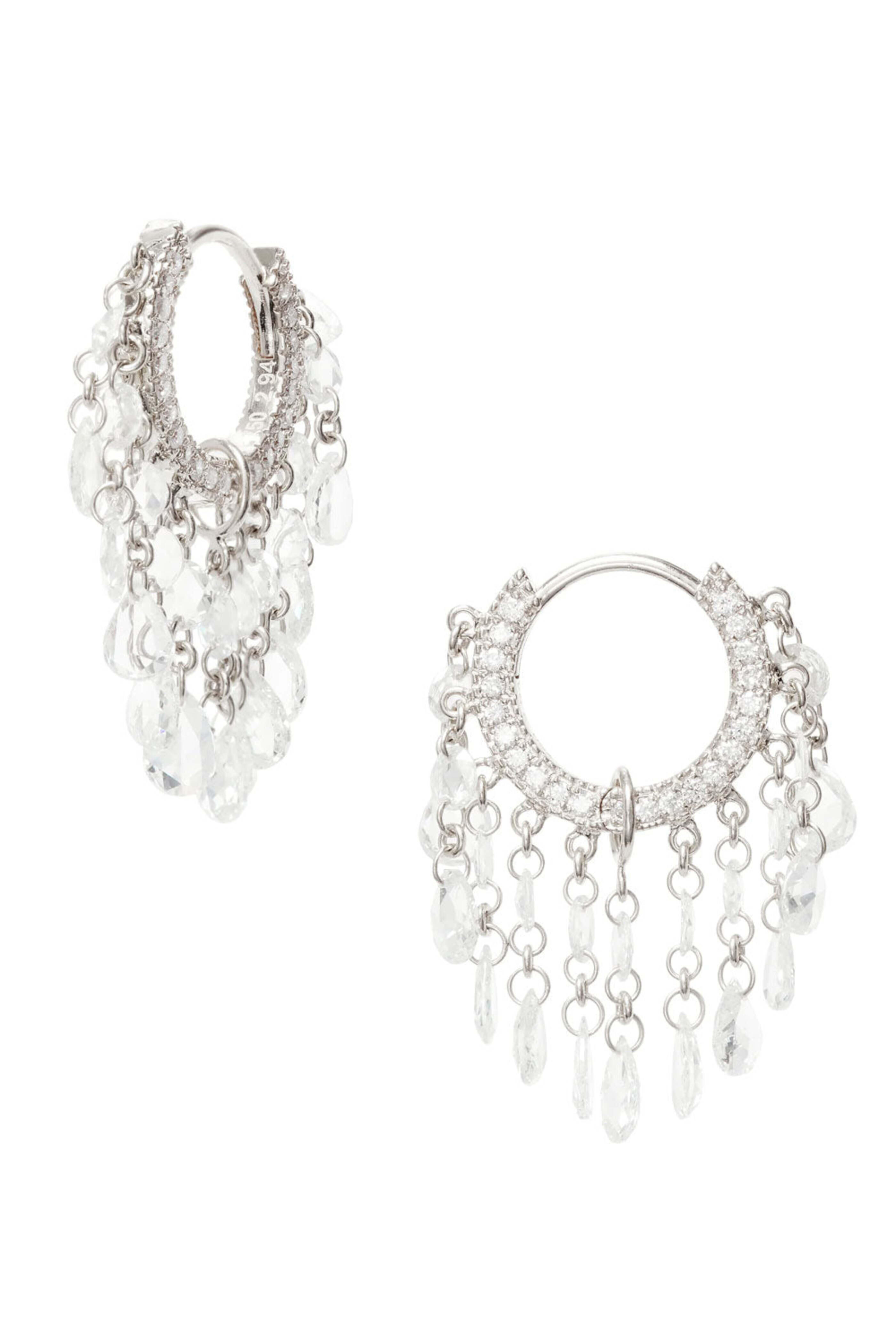 Kai Linz Saucy Diamond Shaker Earrings. 18k white gold. Diamond 3.02 total carat weight. Laser cut diamonds. Waterfall design. Chain drops. Hinge huggie closure.