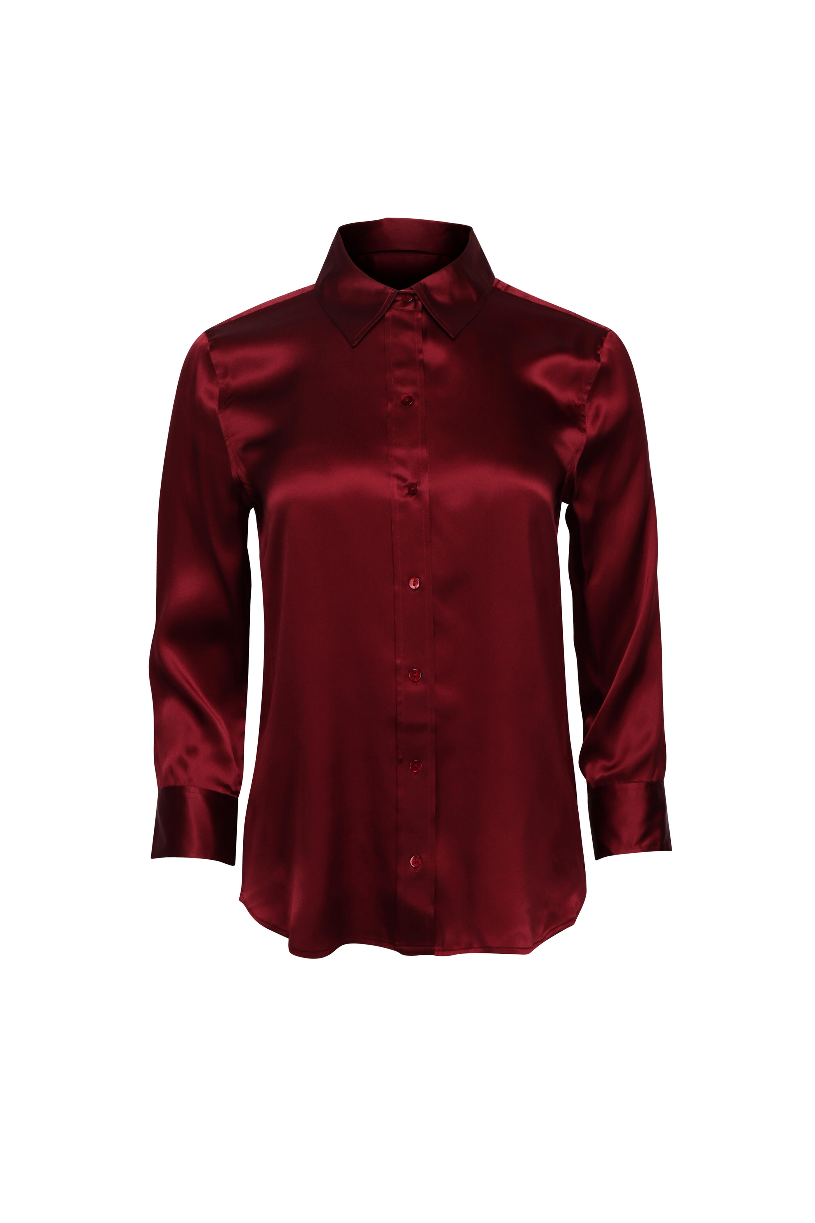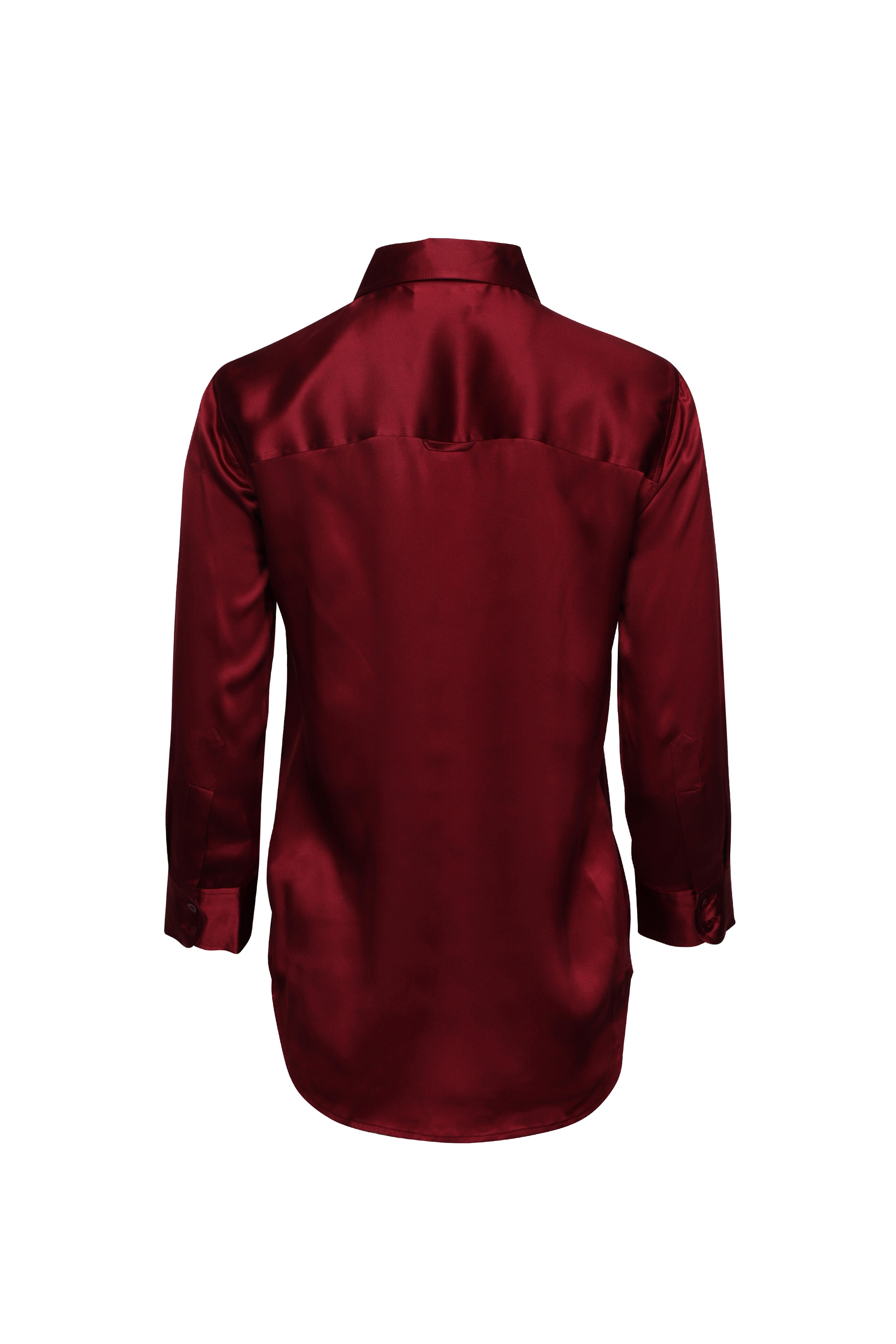Collar. V neck. ¾ length sleeves; button cuffs. Button up front closure. Slim fit. Rounded shirttail hem. Imported. Sleeve 19.2” (Size XS). Length 26” (Size XS). 100% silk. Dry clean.