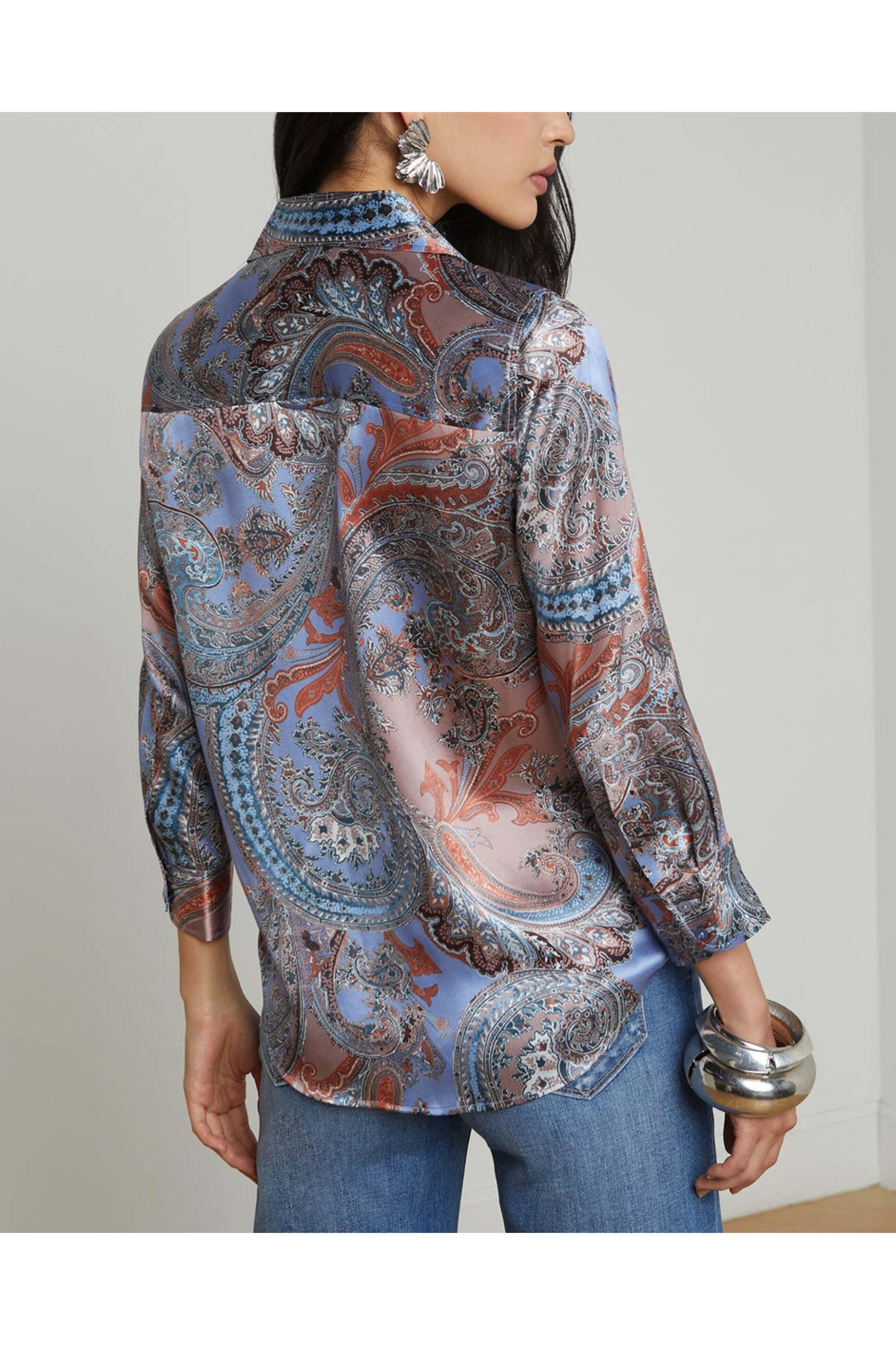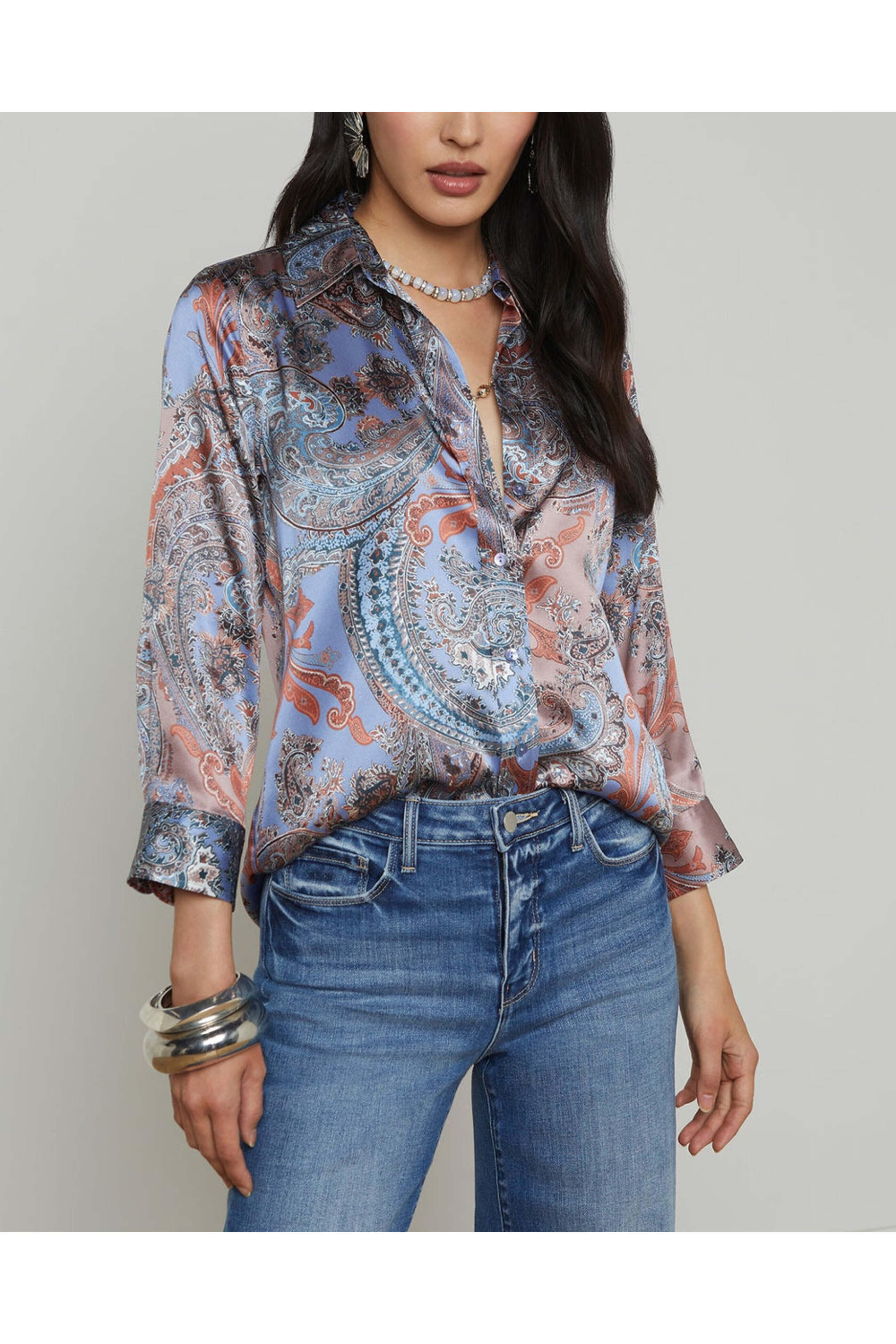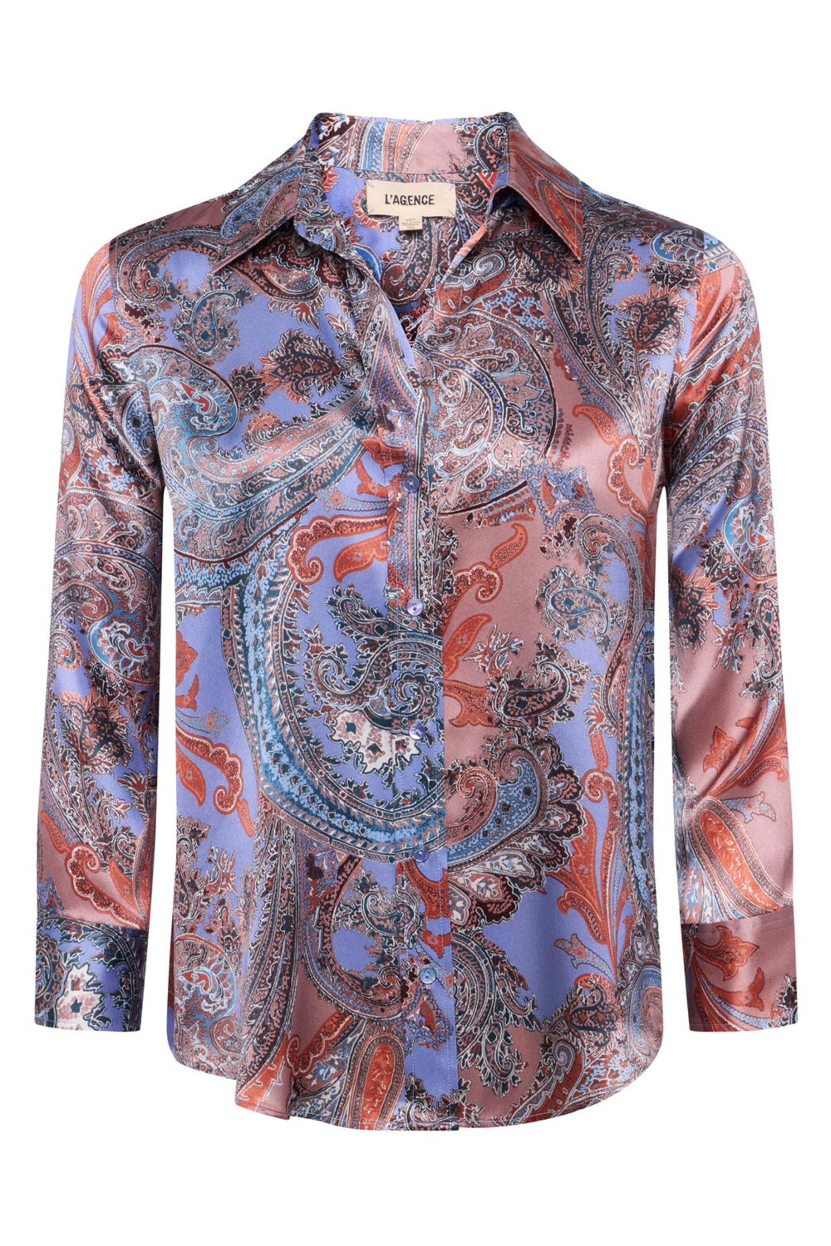 LAgence Periwinkle French Paisley Dani Blouse. Collar. V neck. ¾ length sleeves; button cuffs. Button down front closure. Relaxed fit. Rounded high low hem. 100% silk.