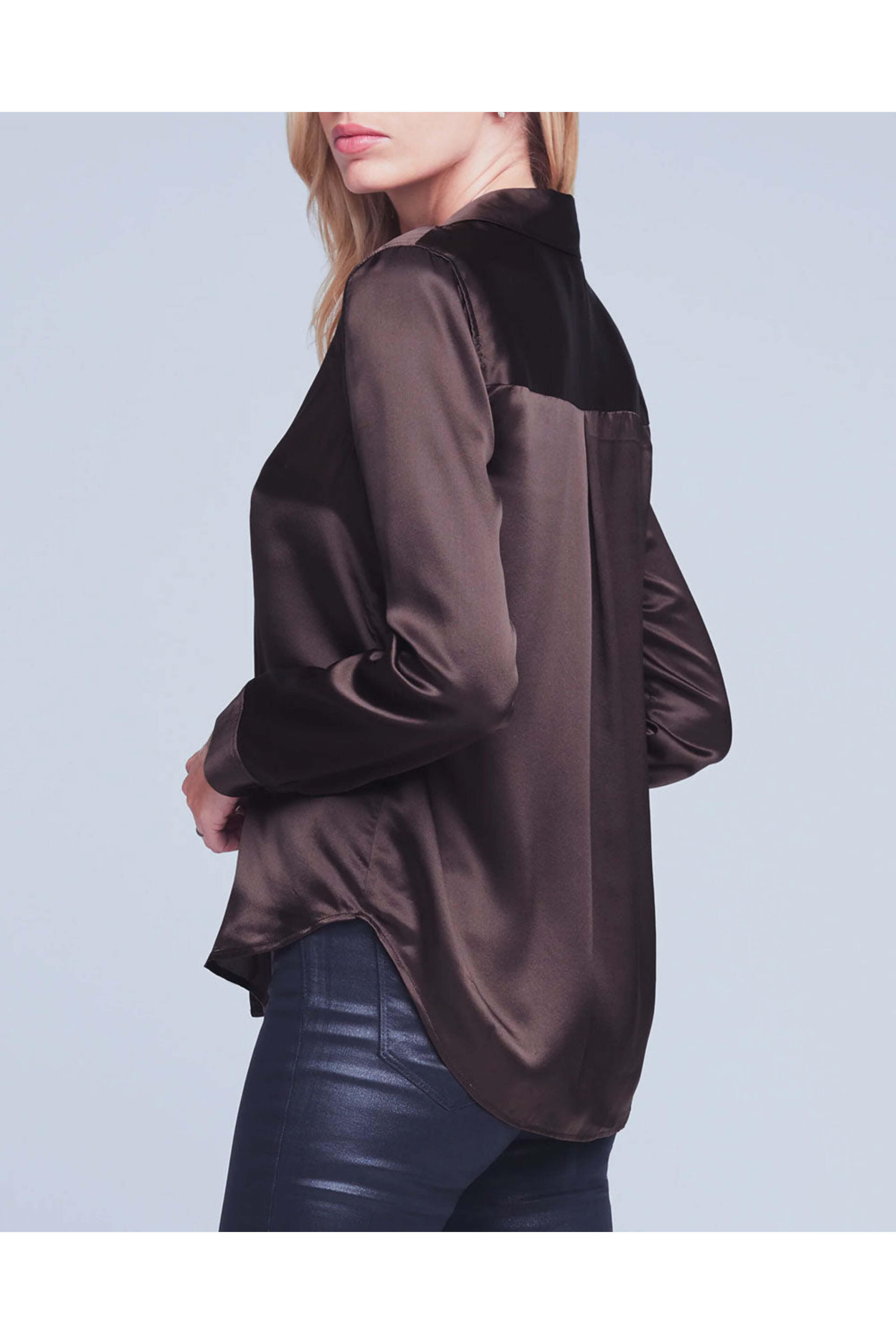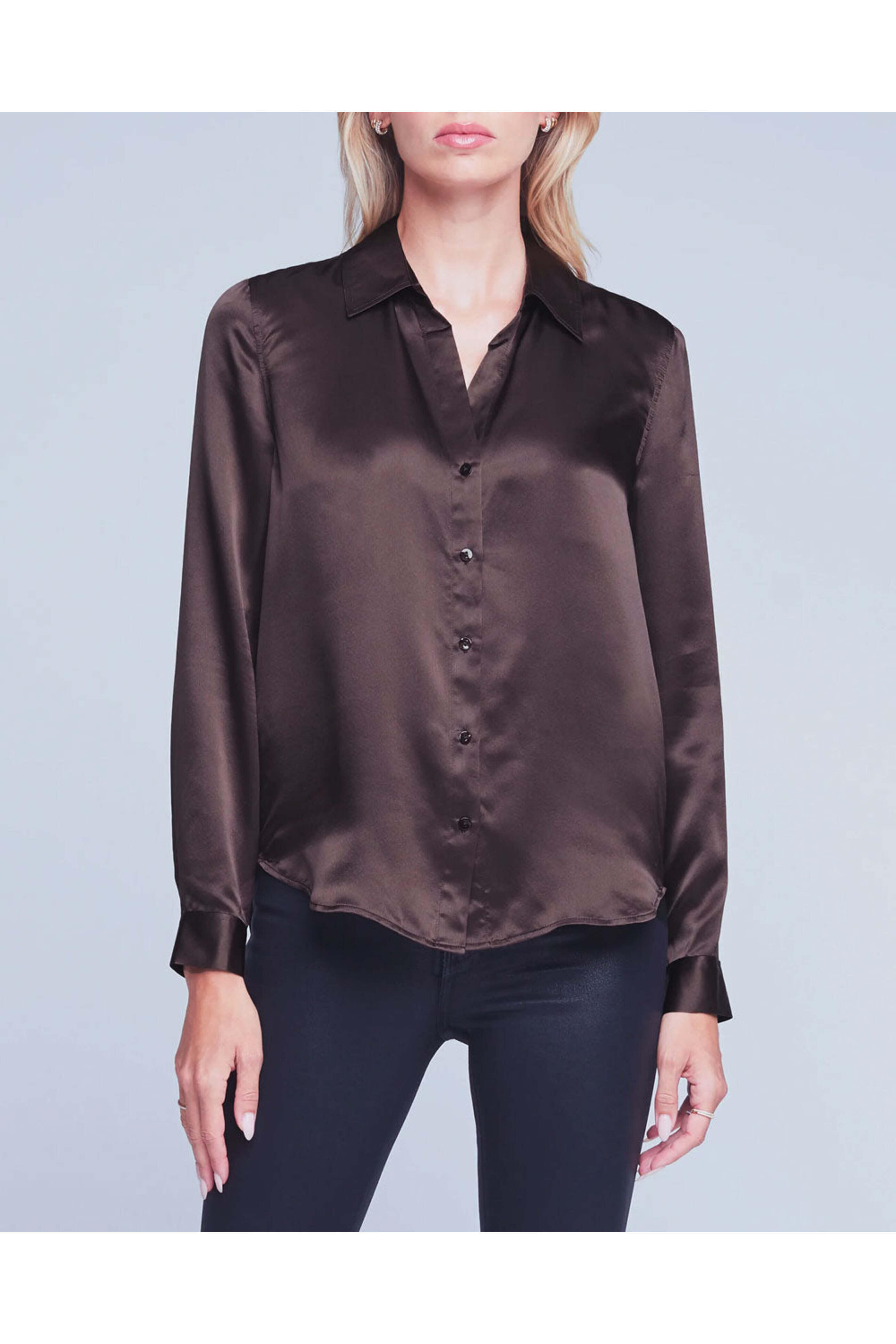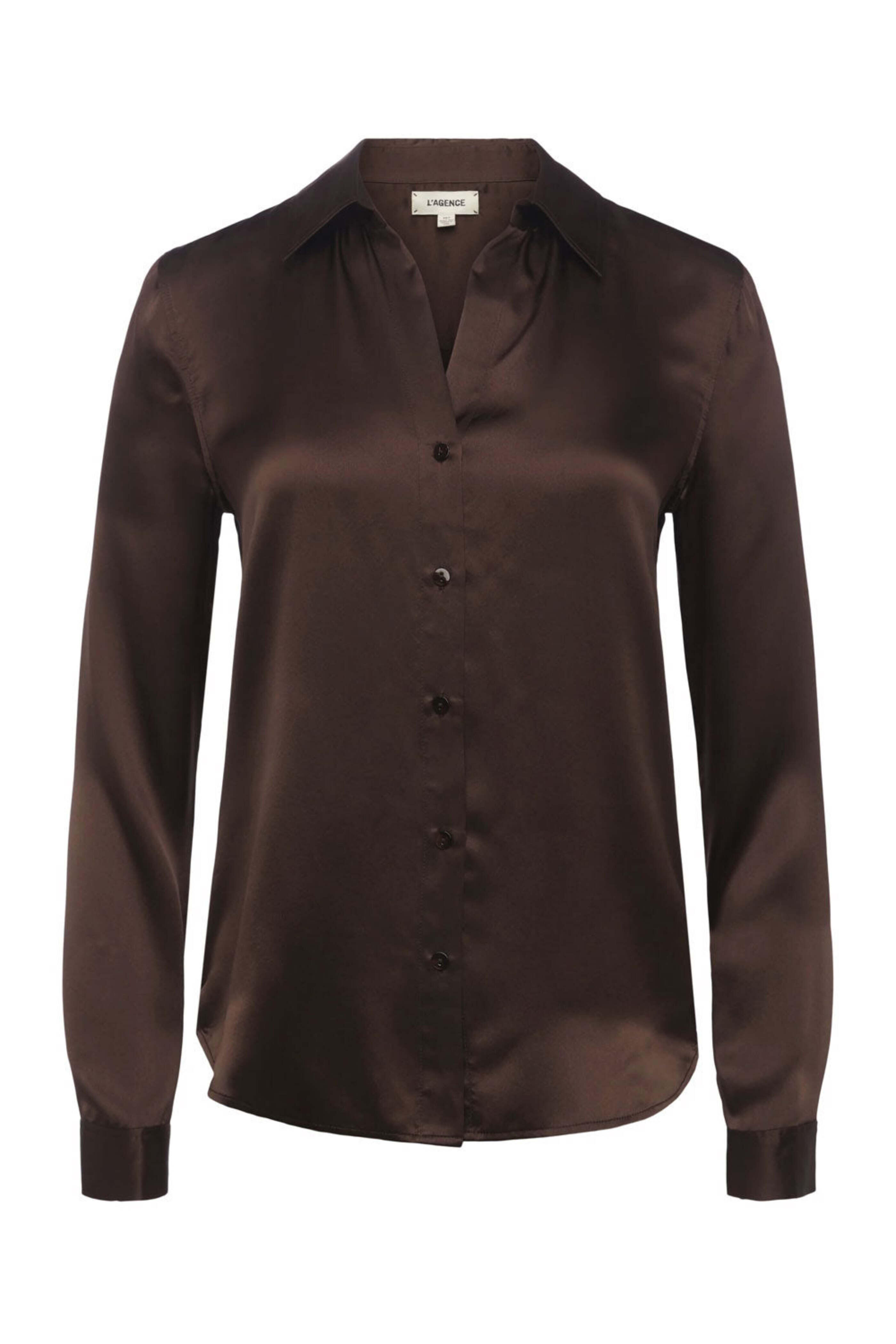 L'Agence Cocoa Brown Tyler Blouse. Stand collar. Long sleeves; button cuffs. Tonal button up closure. Yoked back; inverted pleat. Curved hem. Relaxed fit. 100% Silk.
